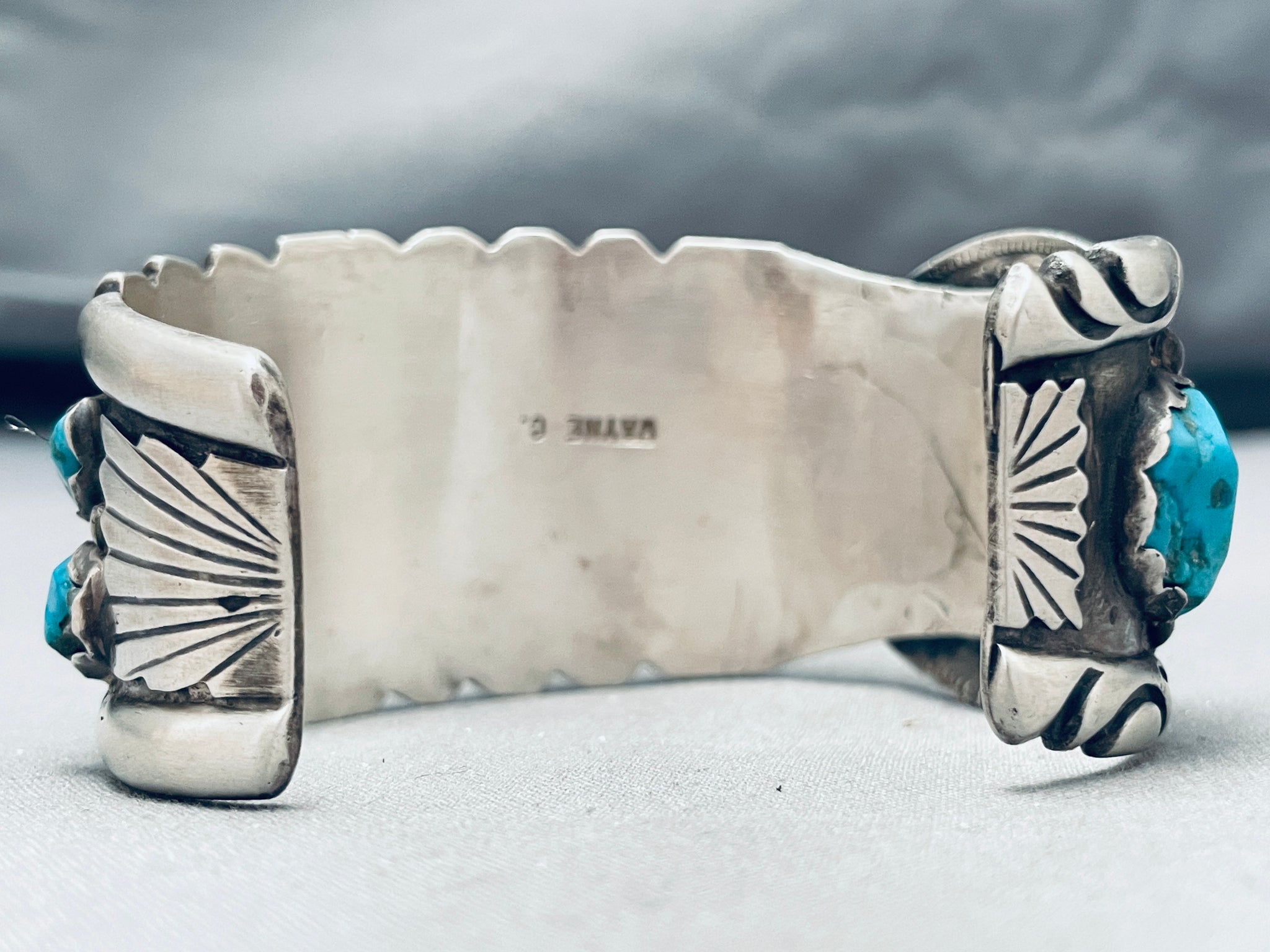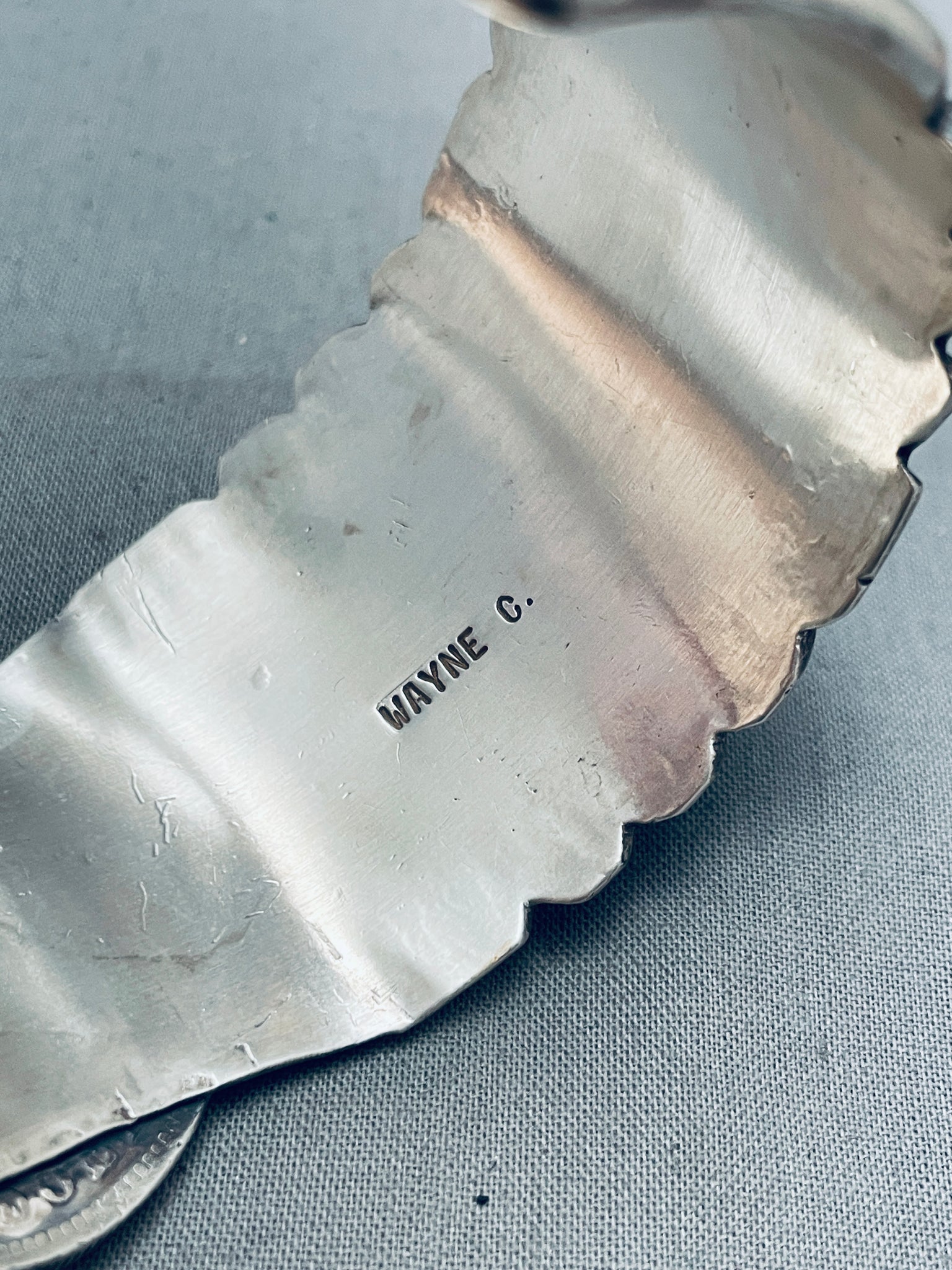 We are proud to offer this fascinating vintage Zuni silver bracelet. What an eye-catching cuff we have here! Where do we begin?! The cuff has a gentle wave to it, as the one side hosts the 1882 USA Silver Dollar that's now perfectly curved, as the one side greets one of the 11 vibrant, carved turquoise stones that call this bracelet home! The opposite side of the Silver Dollar is where we have the remaining ten stones, arranged in two rows of five stones, separated and accented with dual silver beads! This bracelet is quite the conversation piece! The largest stone measures around 9/16" x 1/2". The width of the bracelet measures around 1-1/2". Signed by Zuni artist, Wayne Cheama. Sterling silver. The inside end to end measures around 5-7/8" with an additional 1-1/2" gap. Sturdy 114 grams.