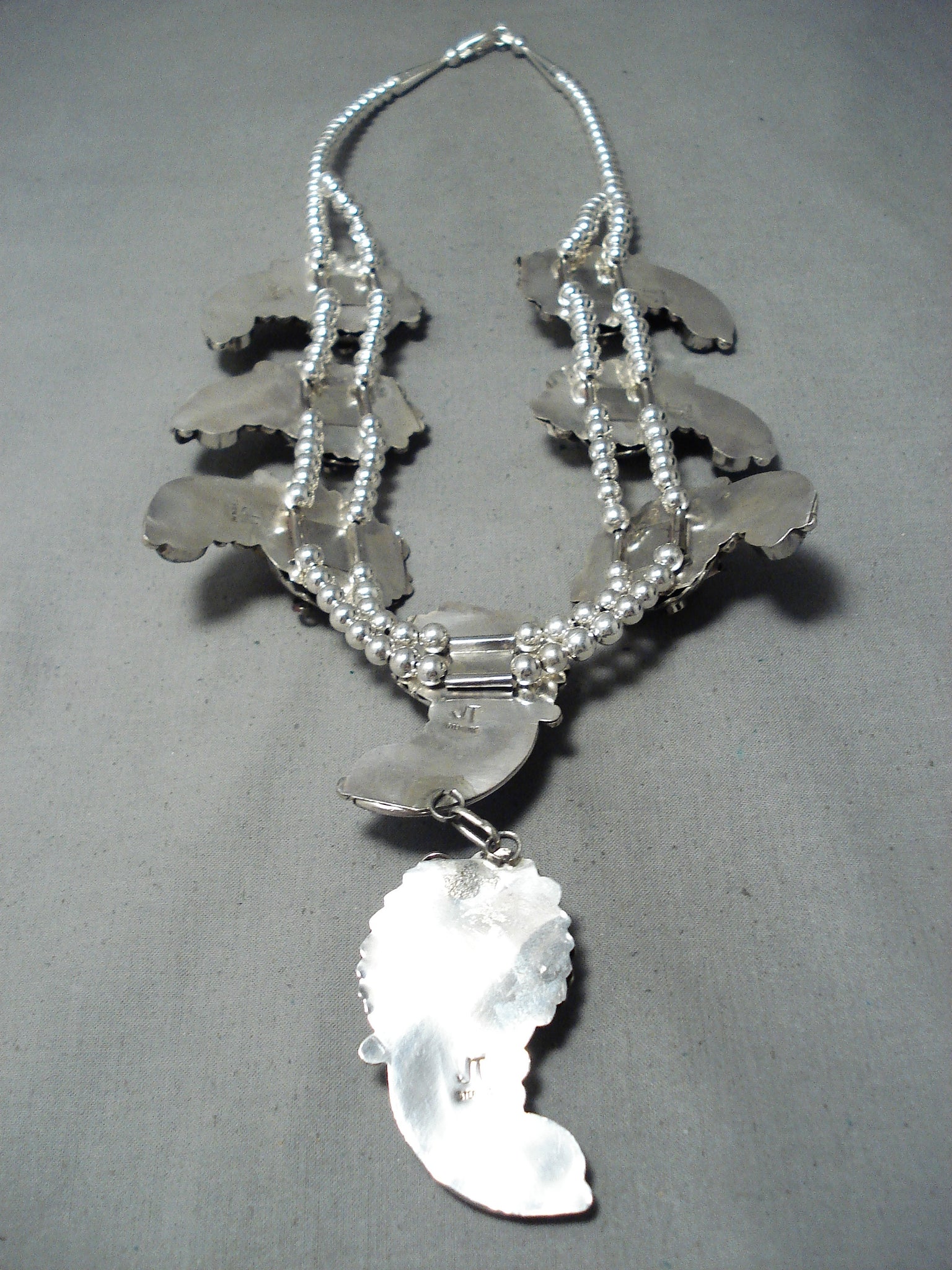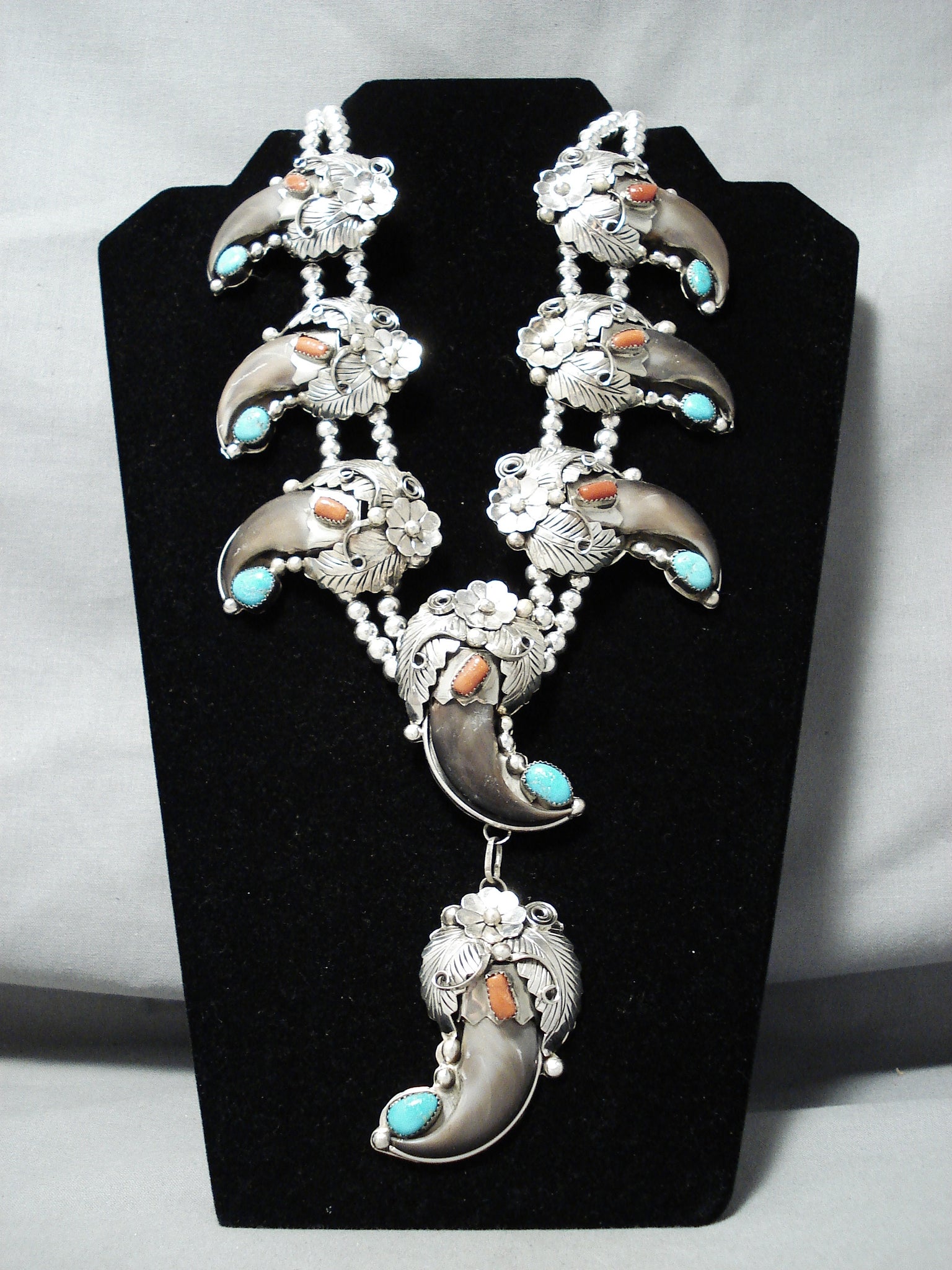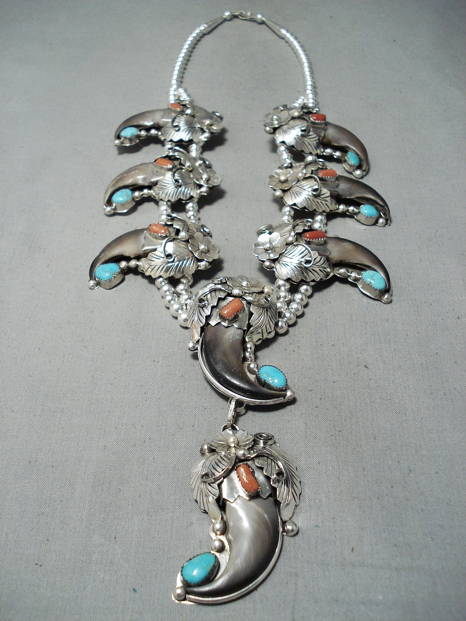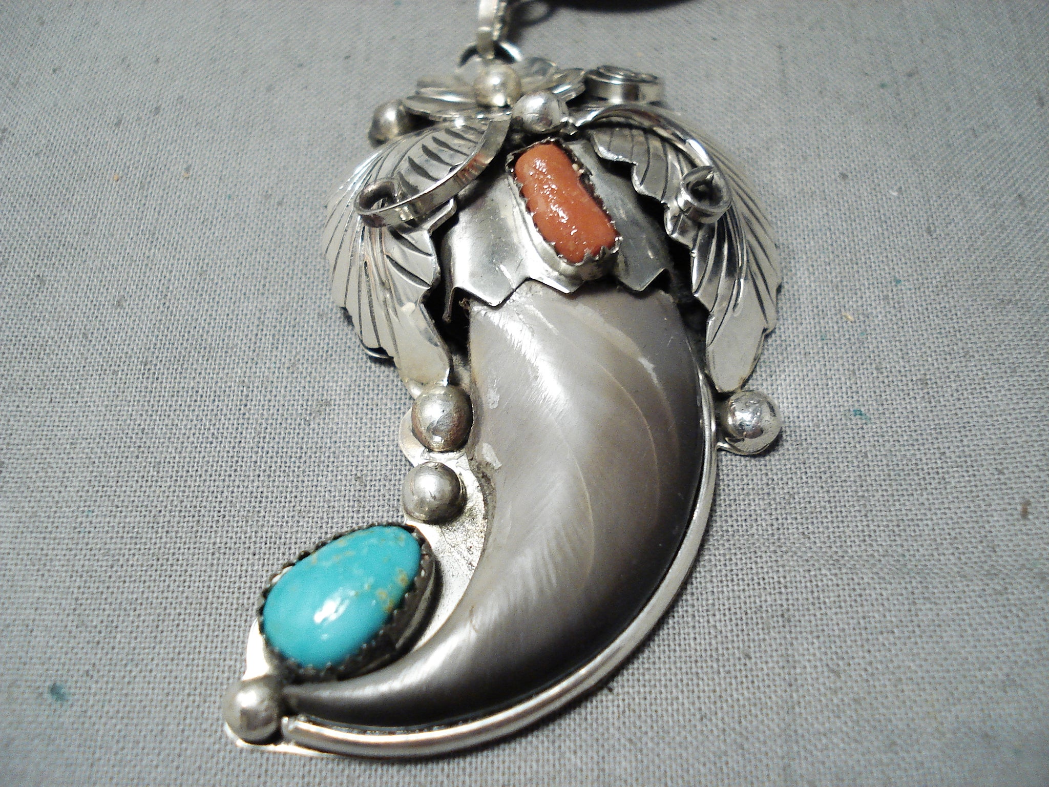 Authentc Native American Navajo Bear Turquoise Coral Sterling Silver Necklace