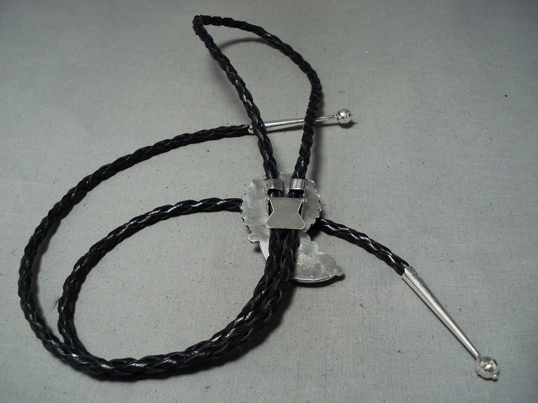 Authentic Bear Native American Navajo Turquoise Coral Sterling Silver Bolo Tie