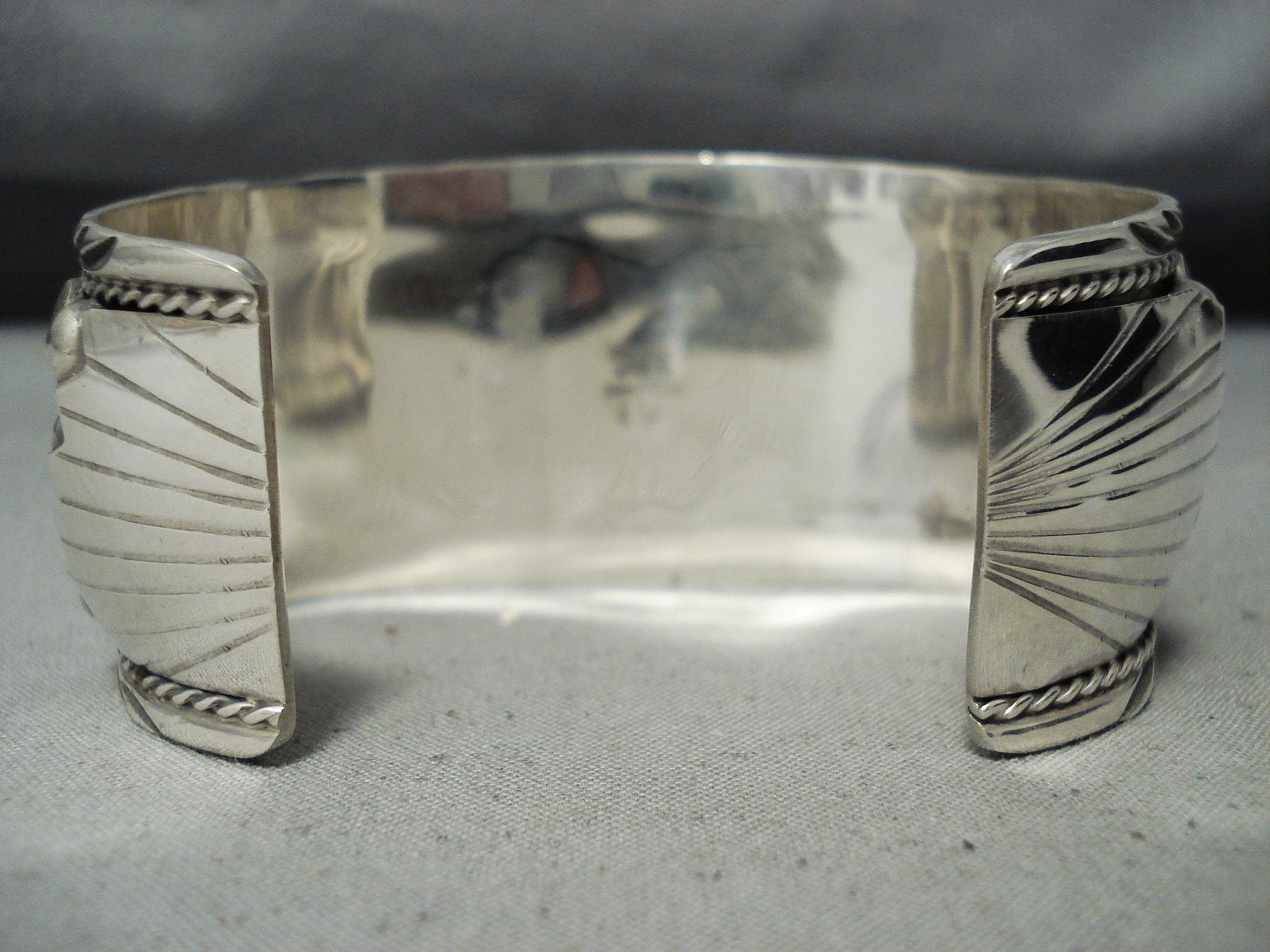 This is an astonishing vintage Navajo turquoise and coral silver bracelet. This stunning silver bracelet is an authentic bracelet. Located throughout the magnificent silver cuff are wonderful Old Kingman turquoise stones with accenting coral stones. The silver works that are situated on the entire cuff are fabulous including raindrops, flattened beads, sun bursting fans, and large impeccable leaves. Bordering the cuff are superior wave works with accenting silver ropes that run from one end to the other. The largest stone measures around 1/2" x 3/8". The width of the bracelet measures around 1-1/2". Signed by Navajo artist, EY. Sterling silver, marked. Cir. 1970's+. The inside end to end measures around 6" with an additional 1-1/2" gap. Sturdy 57 grams.