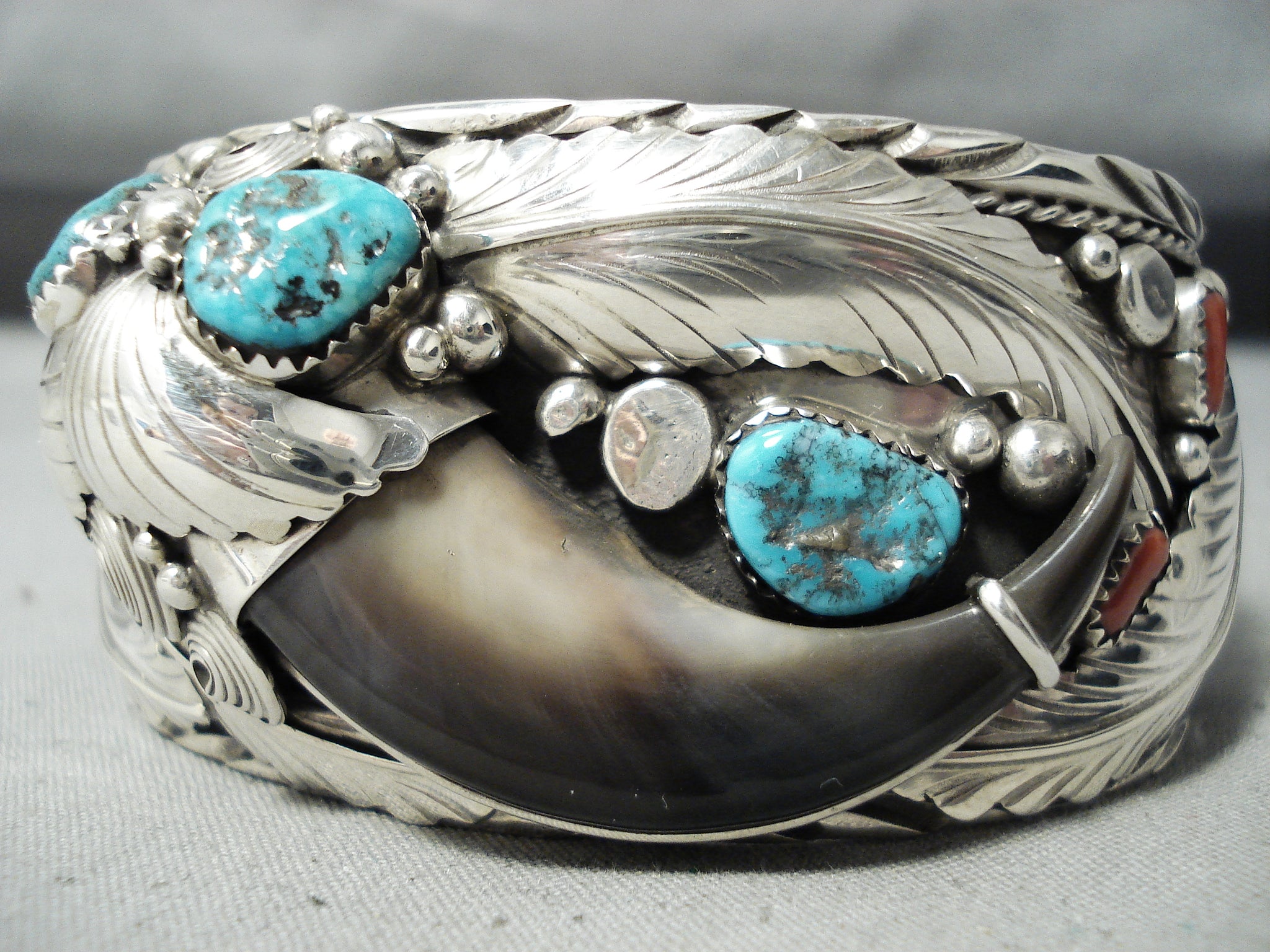 Authentic Bear Native American Navajo Turquoise Coral Sterling Silver Bracelet