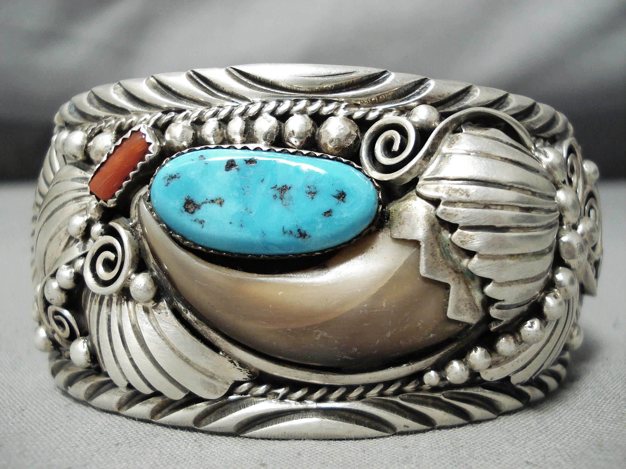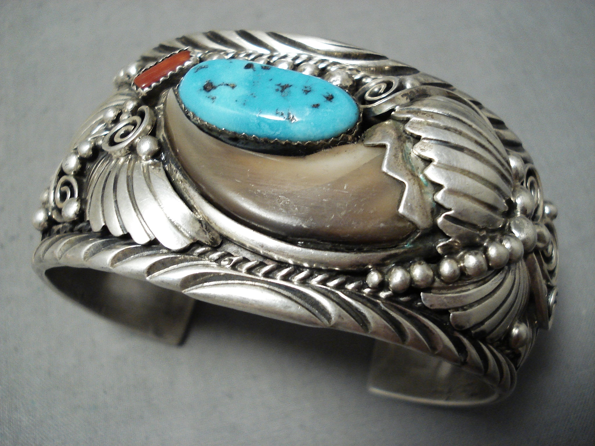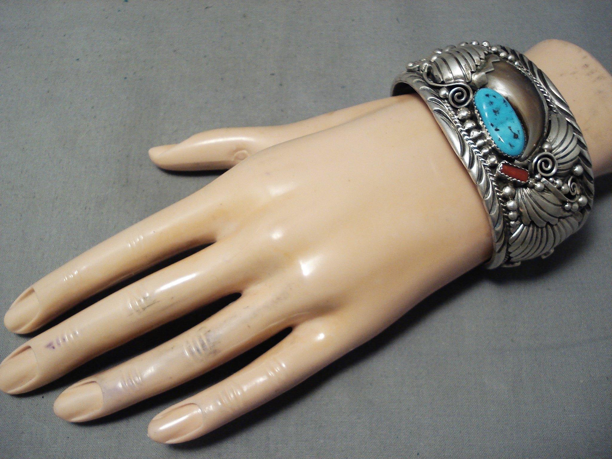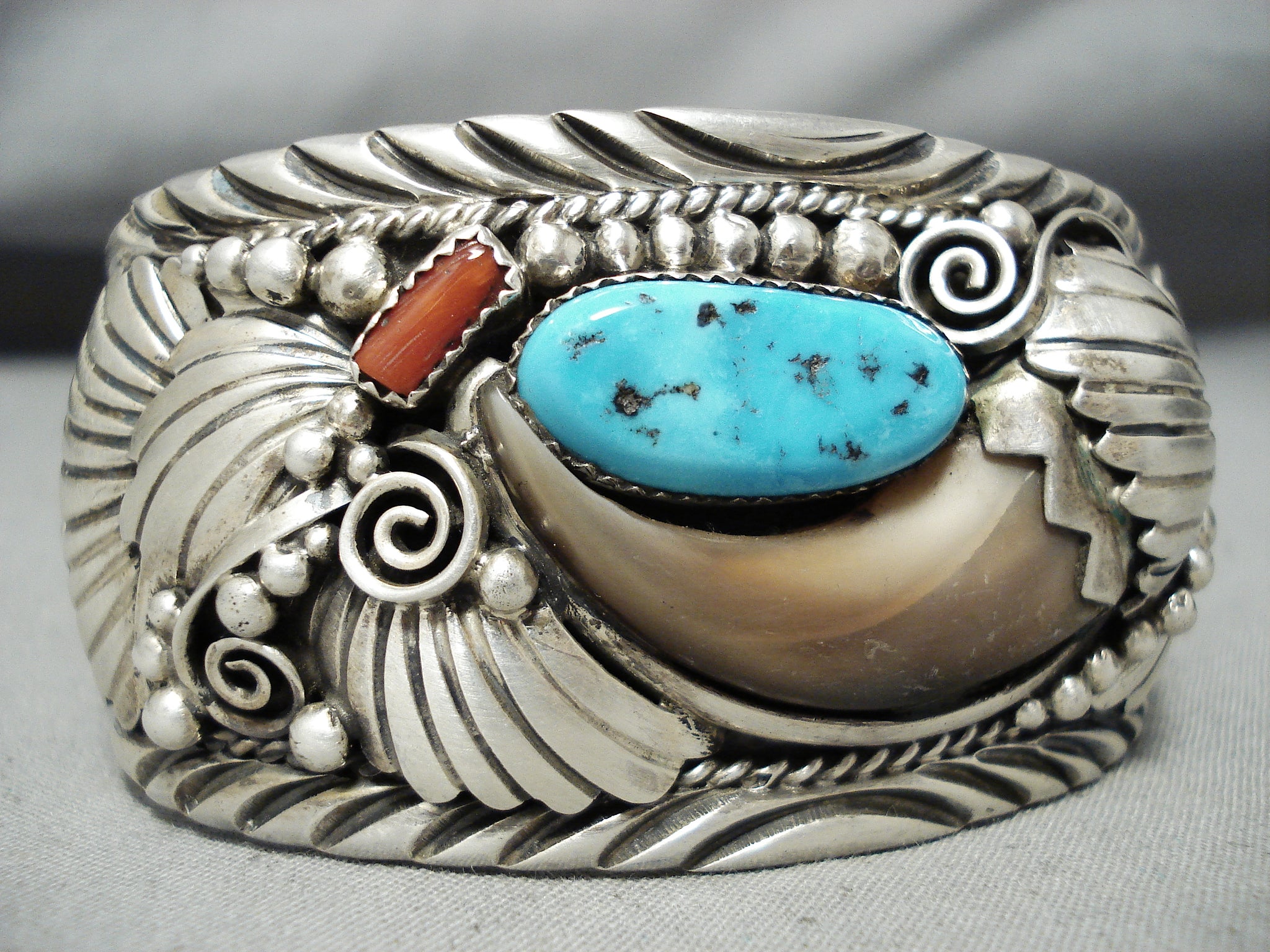 Authentic Bear Native American Navajo Turquoise Coral Sterling Silver Ted Joe Bracelet