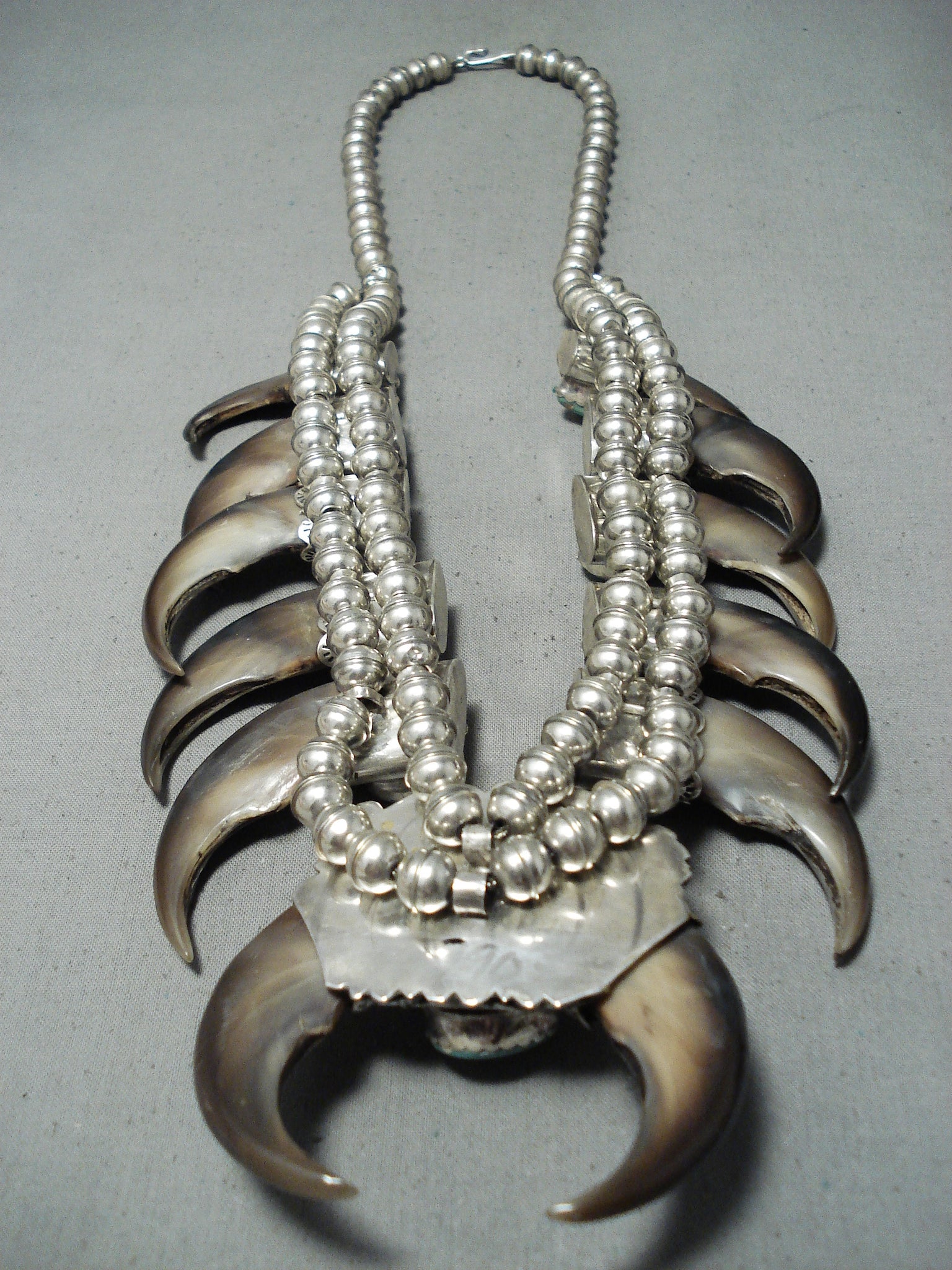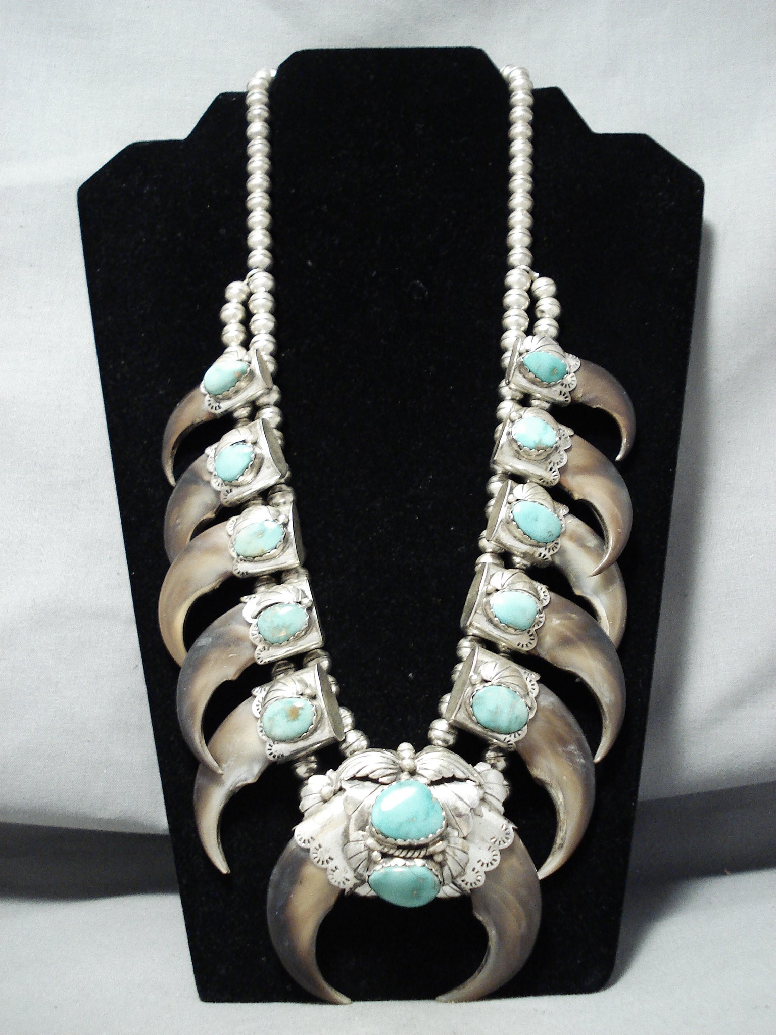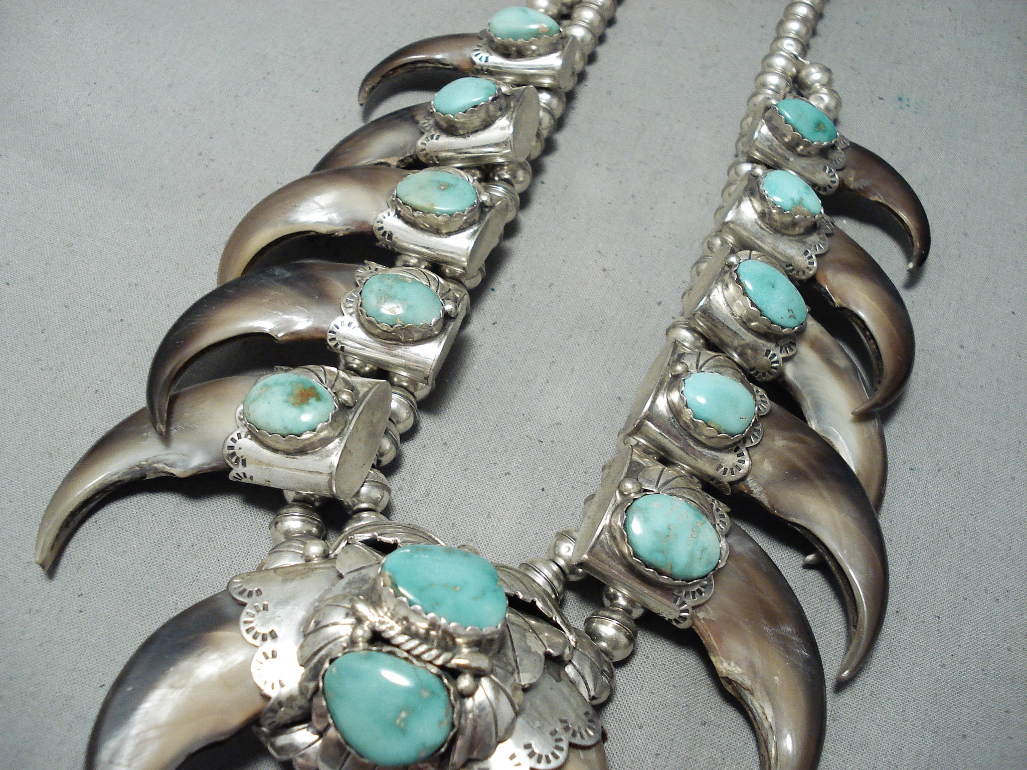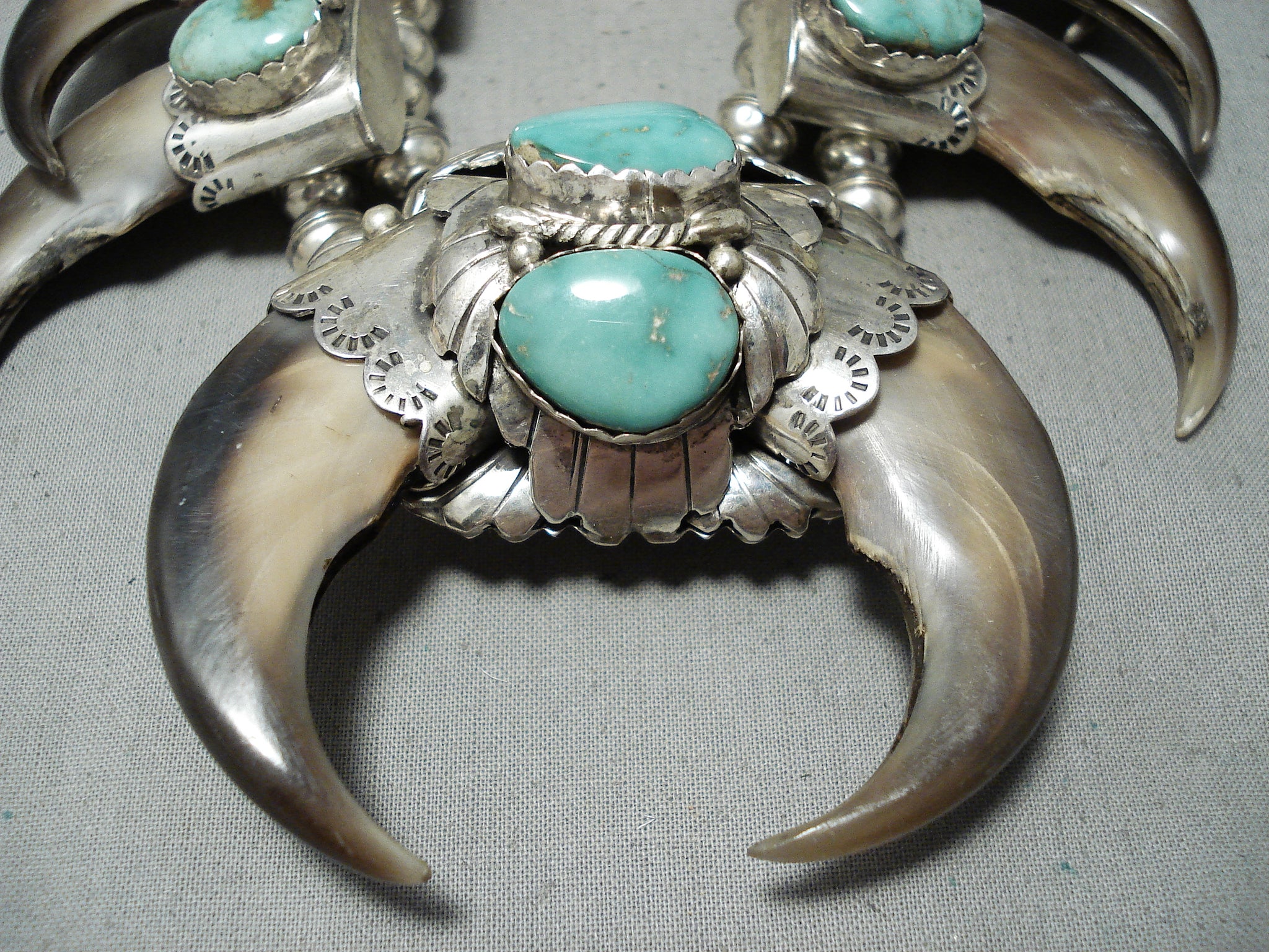 Authentic Bear Vintage Native American Navajo Turquoise Sterling Squash Blossom Necklace