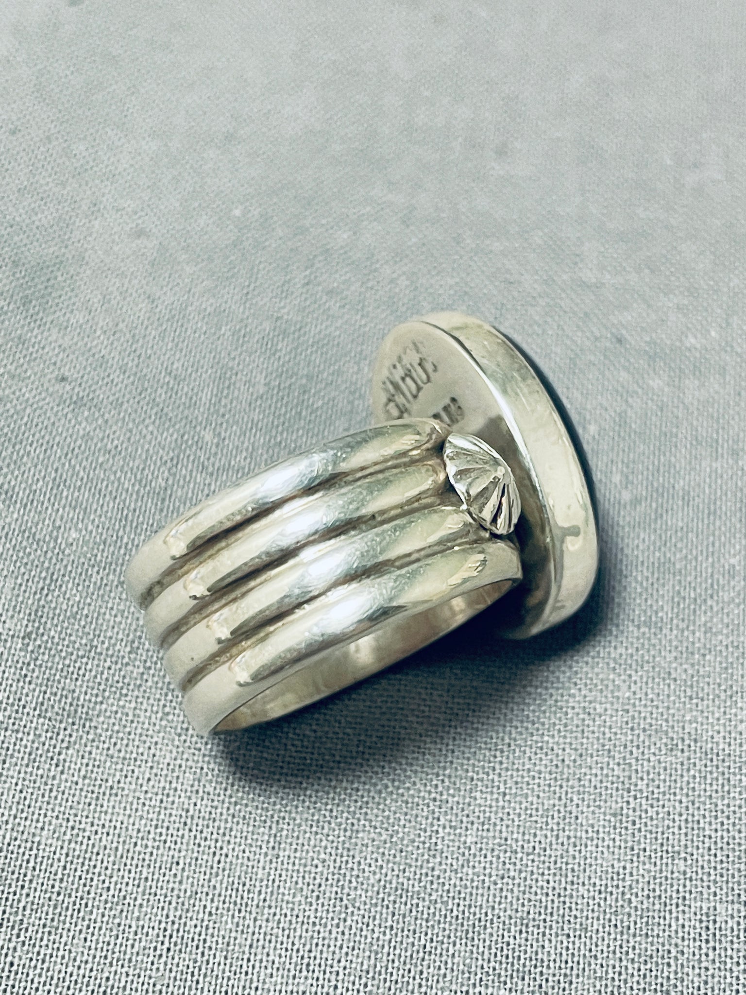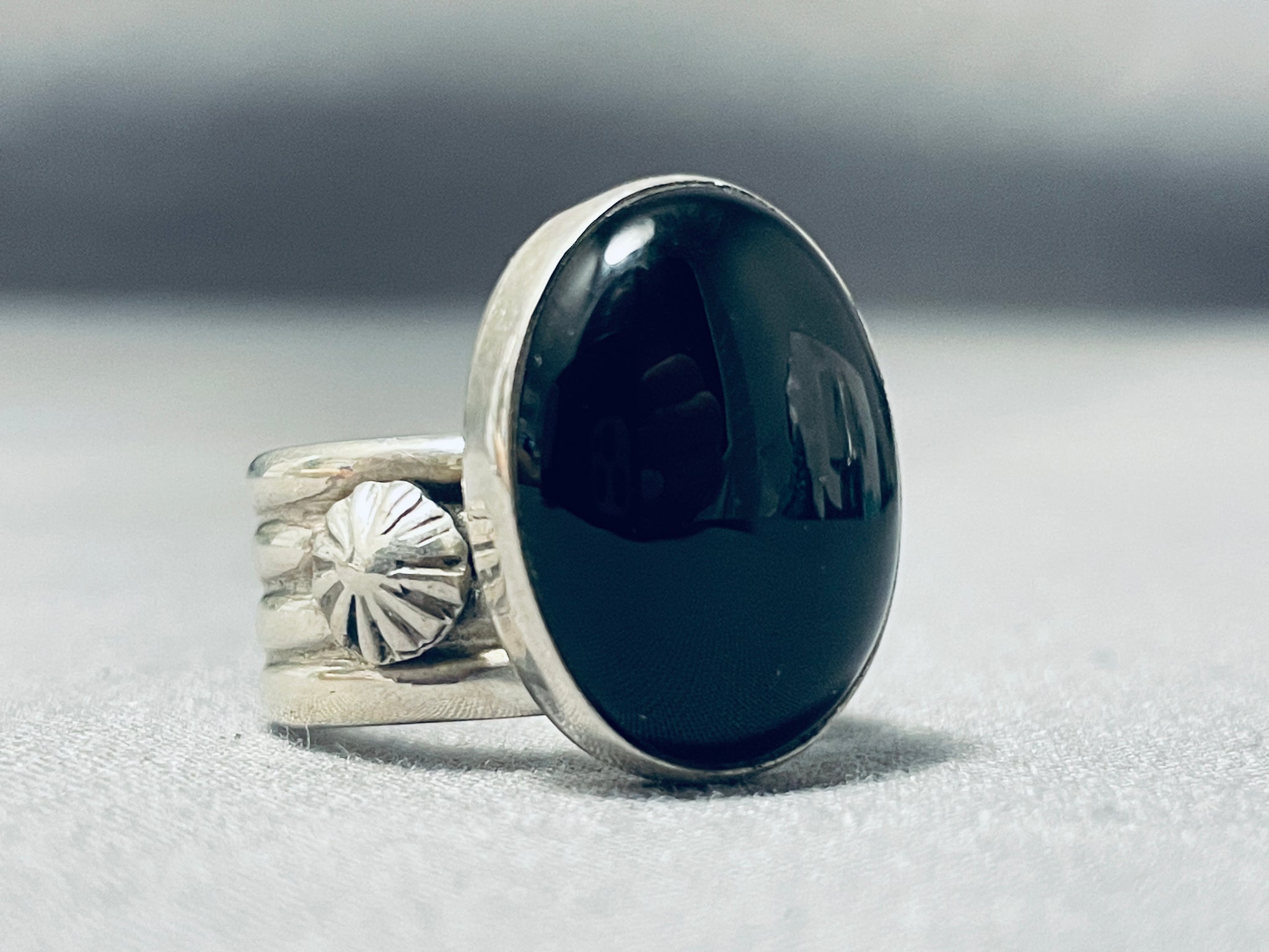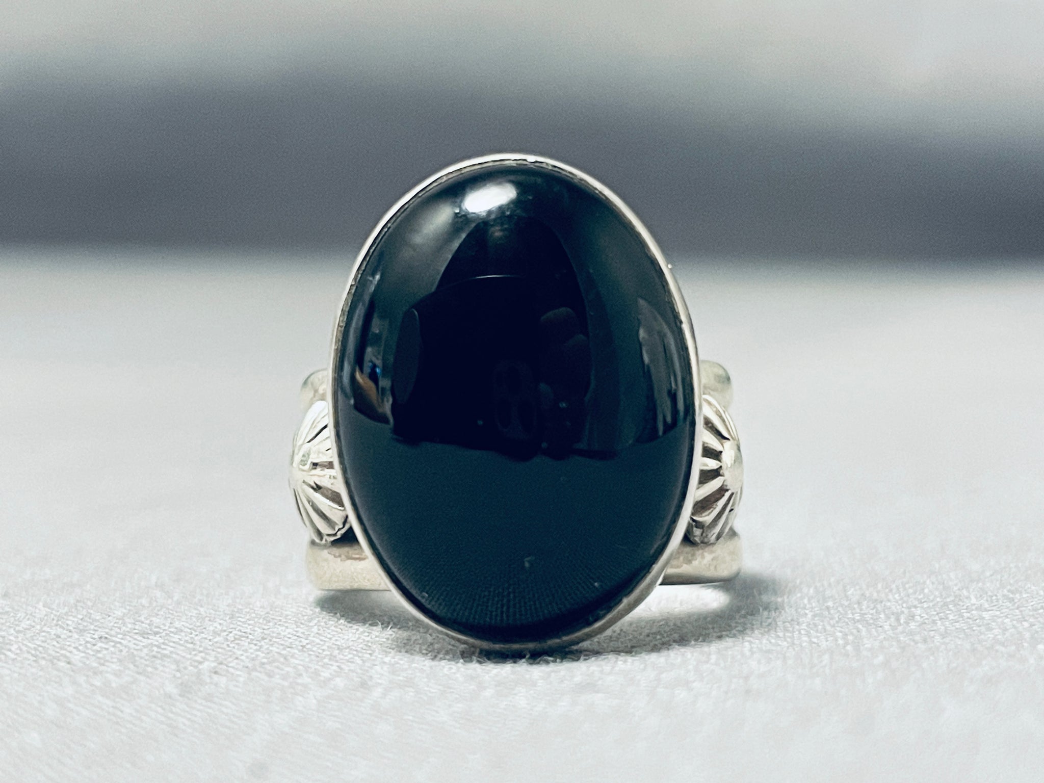 This is a marvelous Navajo ring featuring an oval black onyx stone and handcarved silver stars, on a solid silver band! So Stunning! The center stone measures around 3/4" x 5/8". Signed by Navajo artist, Ben Begaye (d.). The ring size is around 8. Sterling silver, marked. Sturdy 12 grams.