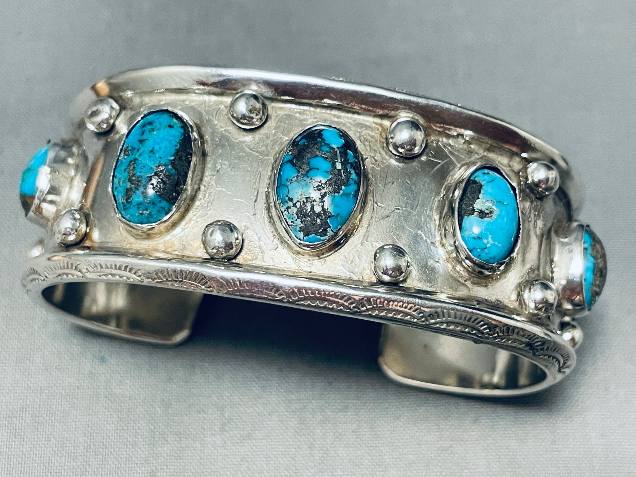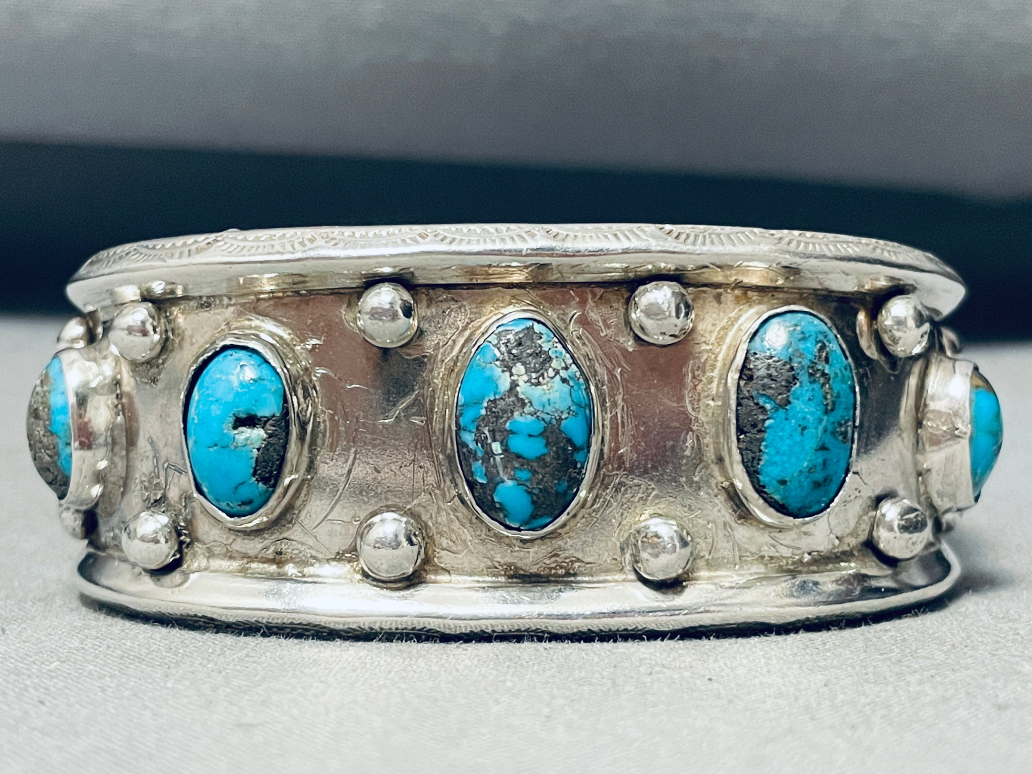 This is an impressive vintage Navajo turquoise row silver cuff bracelet. This stunning bracelet contains 7 fascinating large chunky graduating turquoise stones that appear to be from the impeccable and very rare Bisbee turquoise mine. Situated throughout the cuff are oustanding silver raindrops. Bordering the cuff are beautiful protruding silver edges, such intricacy and beauty on this bracelet. I absolutely love the bordering silver sun stampings that run all the way around the borders. The center stone measures around 1/2" x 3/8". The width of the bracelet measures around 1". Sterling silver. Cir. 1970's+. The inside end to end measures around 5-1/4" with an additional 1" gap. Sturdy 55 grams.