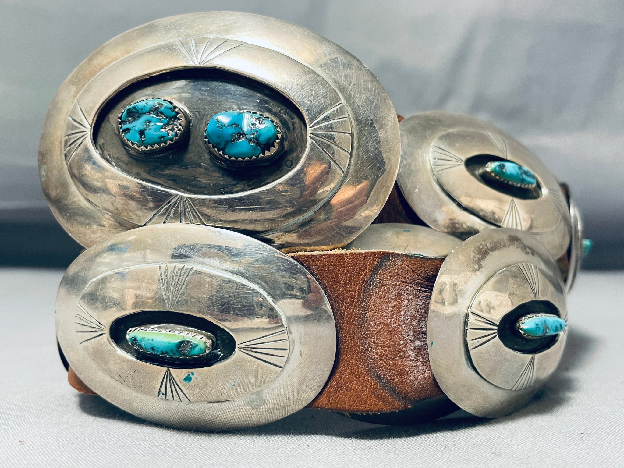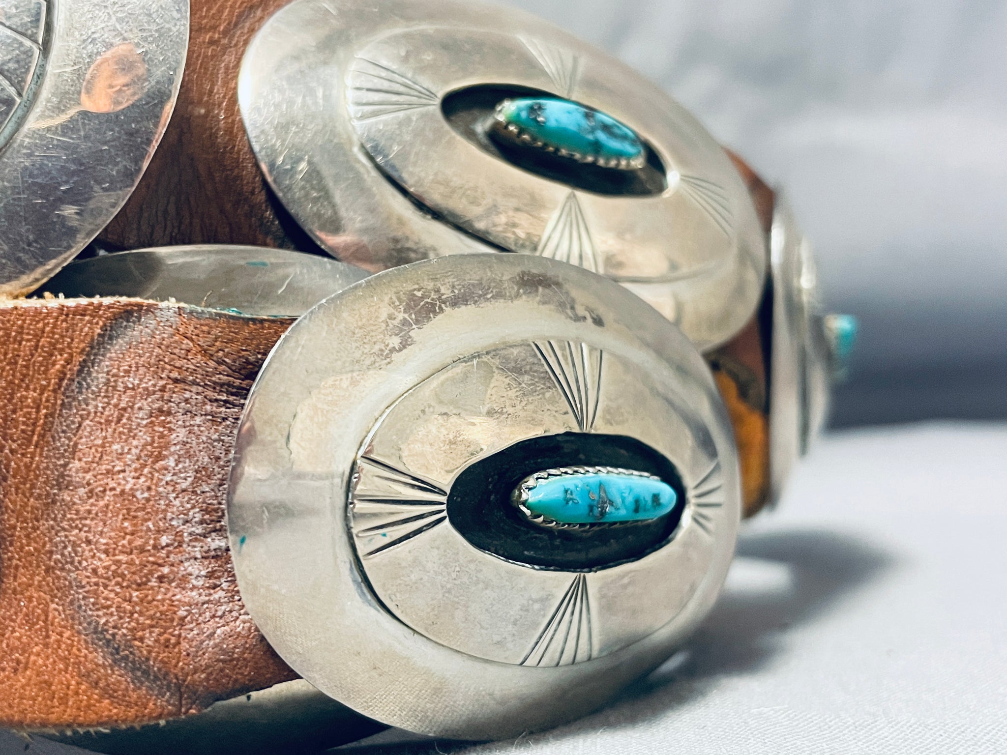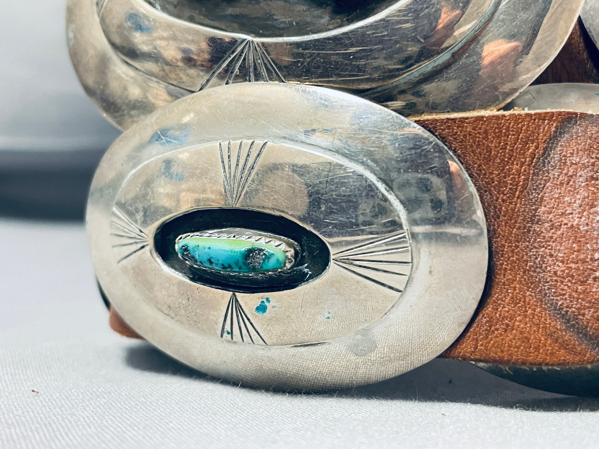 Authentic Hand Tooled Vintage Native American Navajo Turquoise Sterling Silver Concho Belt