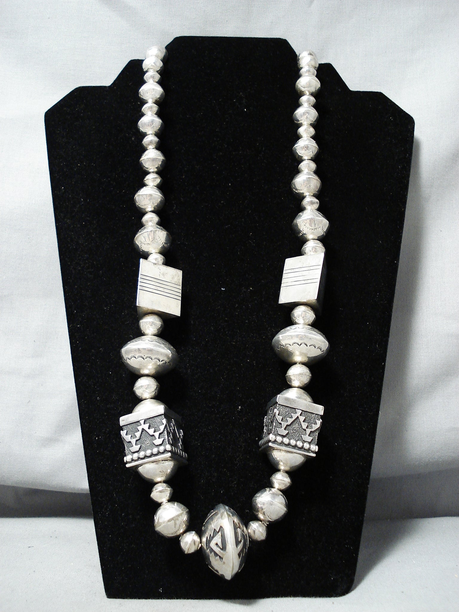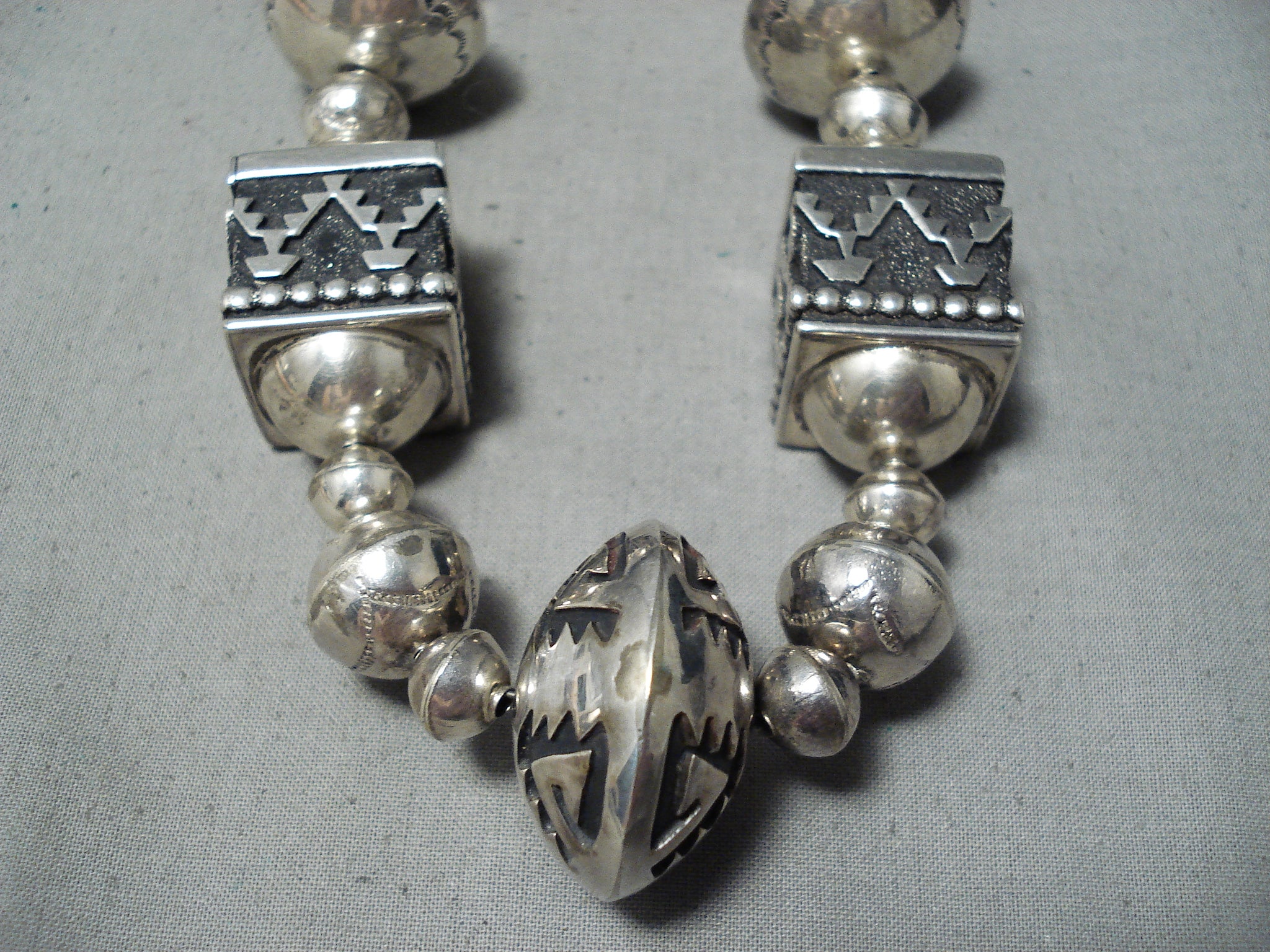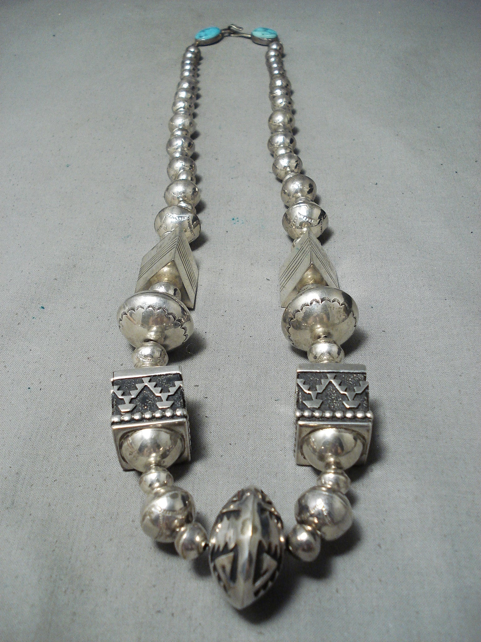 This is a magnificent vintage Navajo turquoise silver very large necklace being very important as it was handmade by the famous artist, Thomas Singer. This is one of his earlier necklaces and this is one of the bigger authentic ones. Please be careful of the replicas out there, this is the real deal. This necklace contains colossal hand carved silver beads that range in multiple sizes as well as very large silver cube shaped beads and large 3D triangular shaped beads. The intricacy of the silver works on the beads are amazing as they include sun stampings, geometric patterns and line segments. This necklace is truly one of a kind. The largest silver bead at the bottom measures a mind blowing 1-1/4" in diameter. Located at the ends of the very long necklace are two old Sleeping Beauty turquoise stones that each measure around 3/4" X 1/2" and goes into a stunning thick traditional silver clasp. Sterling silver, marked. Cir. 1970's+. Signed by Navajo artist, Thomas Singer . The length of the necklace measures around 32". Sturdy 145 grams.