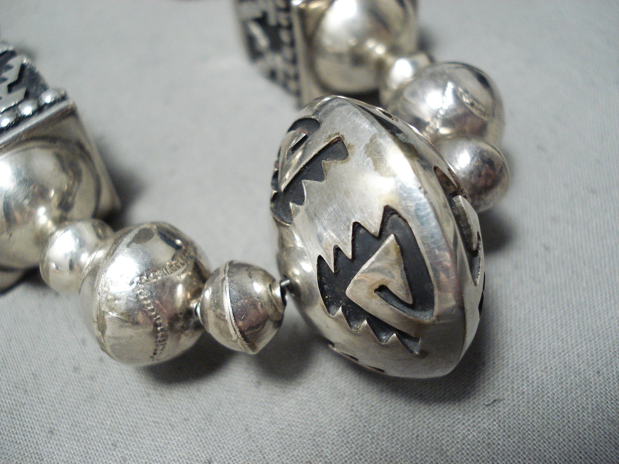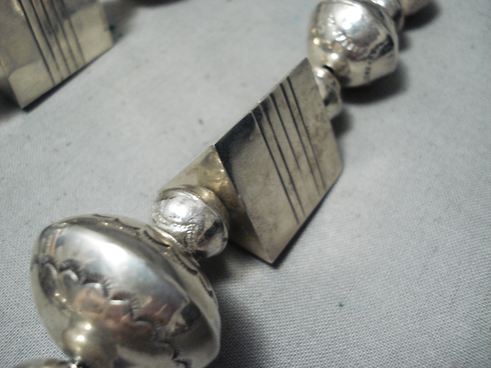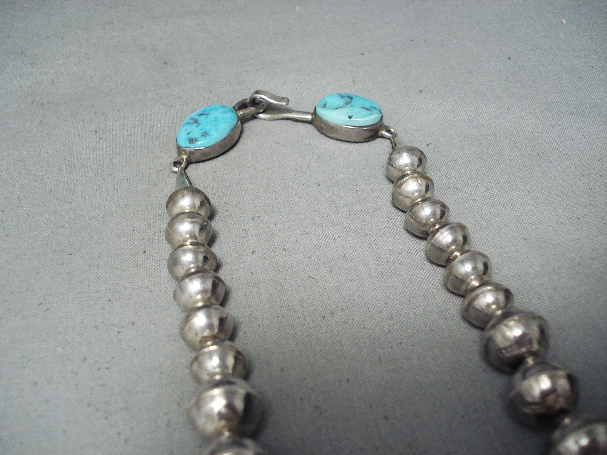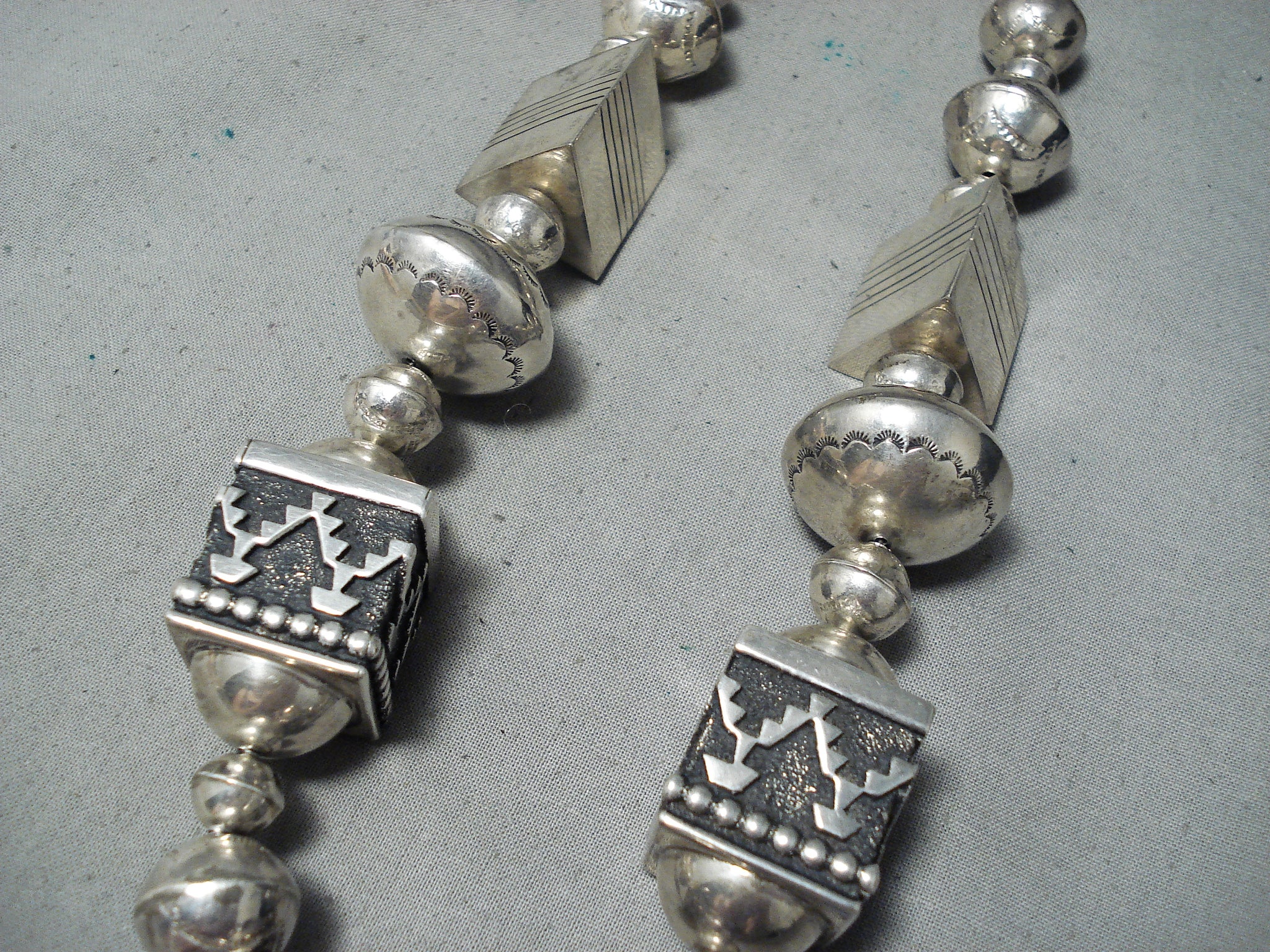 This is a magnificent vintage Navajo turquoise silver very large necklace being very important as it was handmade by the famous artist, Thomas Singer. This is one of his earlier necklaces and this is one of the bigger authentic ones. Please be careful of the replicas out there, this is the real deal. This necklace contains colossal hand carved silver beads that range in multiple sizes as well as very large silver cube shaped beads and large 3D triangular shaped beads. The intricacy of the silver works on the beads are amazing as they include sun stampings, geometric patterns and line segments. This necklace is truly one of a kind. The largest silver bead at the bottom measures a mind blowing 1-1/4" in diameter. Located at the ends of the very long necklace are two old Sleeping Beauty turquoise stones that each measure around 3/4" X 1/2" and goes into a stunning thick traditional silver clasp. Sterling silver, marked. Cir. 1970's+. Signed by Navajo artist, Thomas Singer . The length of the necklace measures around 32". Sturdy 145 grams.