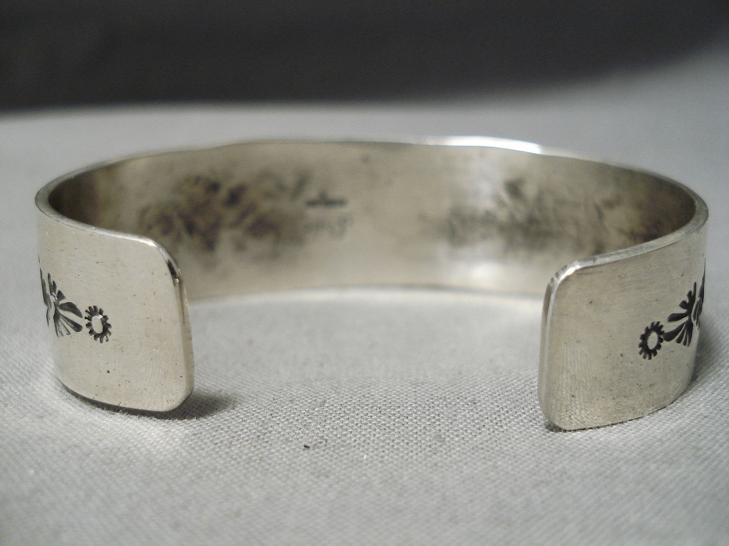 A fabulous Navajo silver bracelet. The impressive oval Pilot Mountain turquoise stone sets at the heart of the wonderfully decorated handstamped cuff. The center stone measures around 3/4" x 5/8". The width of the bracelet measures around 3/4". Signed by Navajo artist, Jeanette Dale. Sterling silver, marked. The inside end to end measures around 5-3/8" with an additional 1" gap. Sturdy 34 grams.