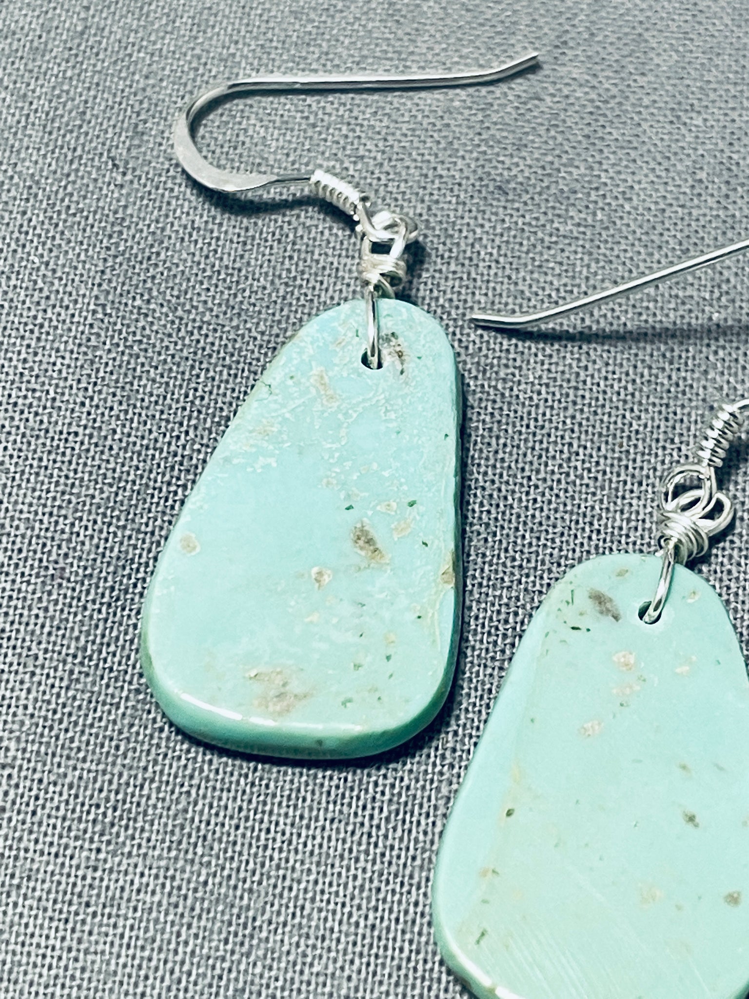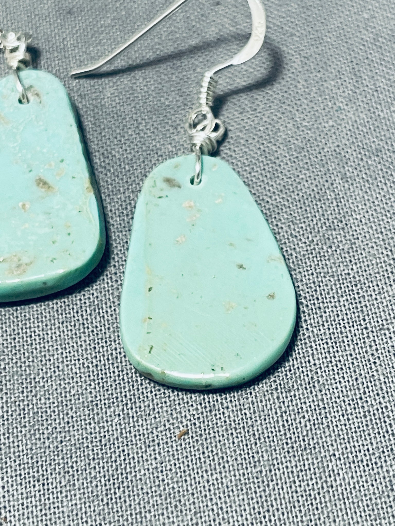 This is a striking Navajo pair of turquoise slab earrings. These earrings are stunning and each consist of a marvelous large chunky green colored turquoise slab. Each slab measures a wonderful 1" X 1/2". These earrings are so marvelous. Sterling silver. The earrings weigh around 2 grams.