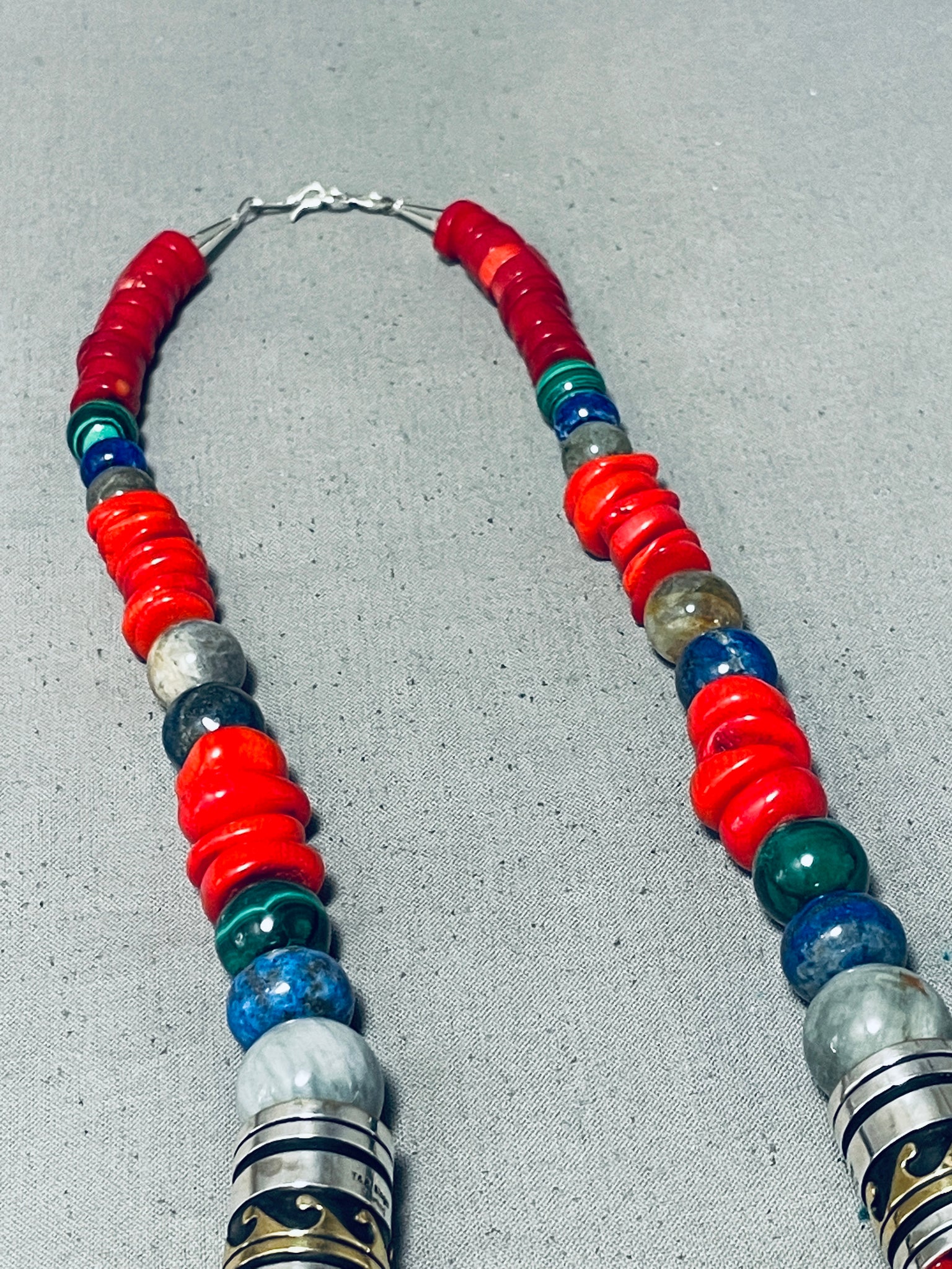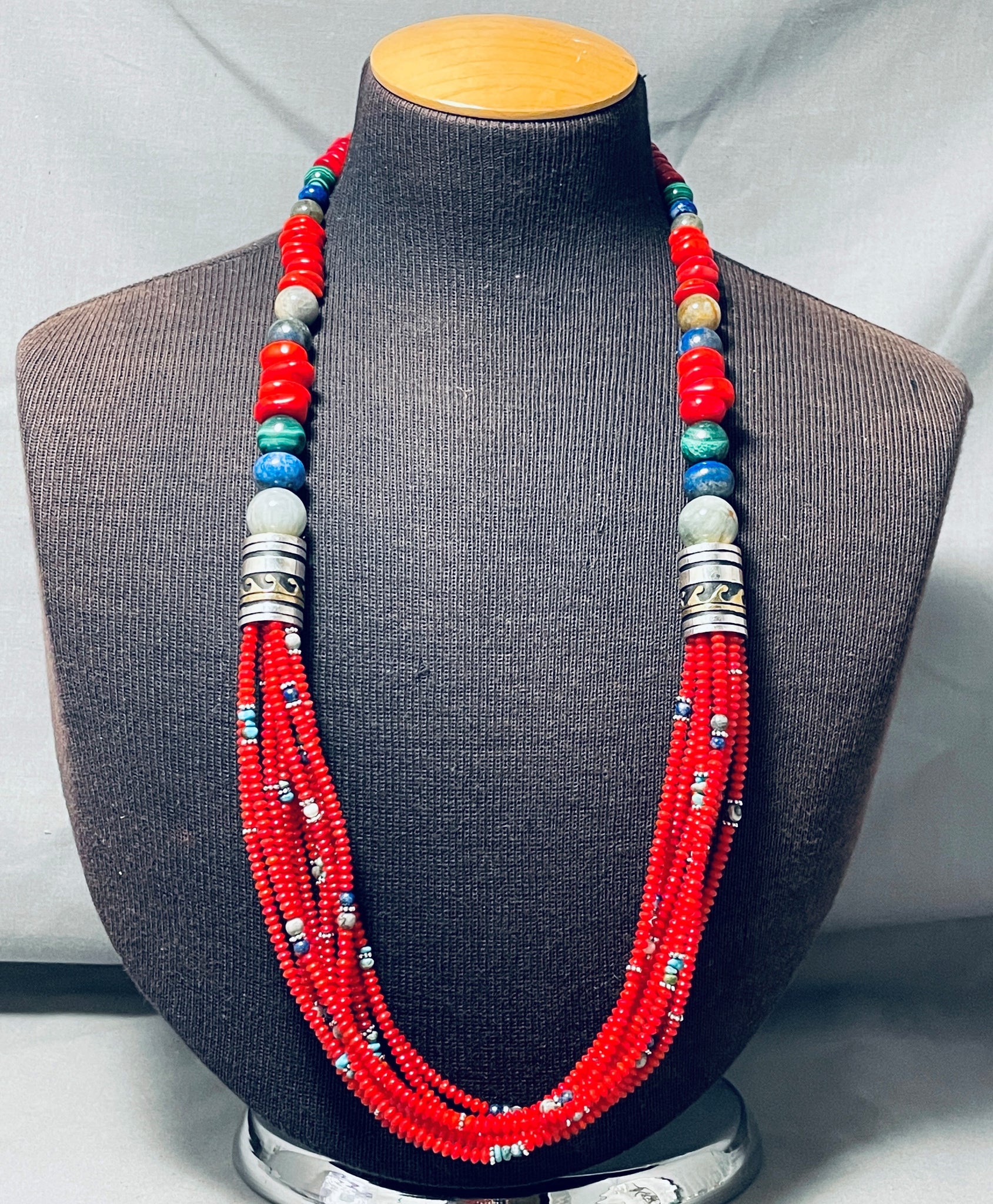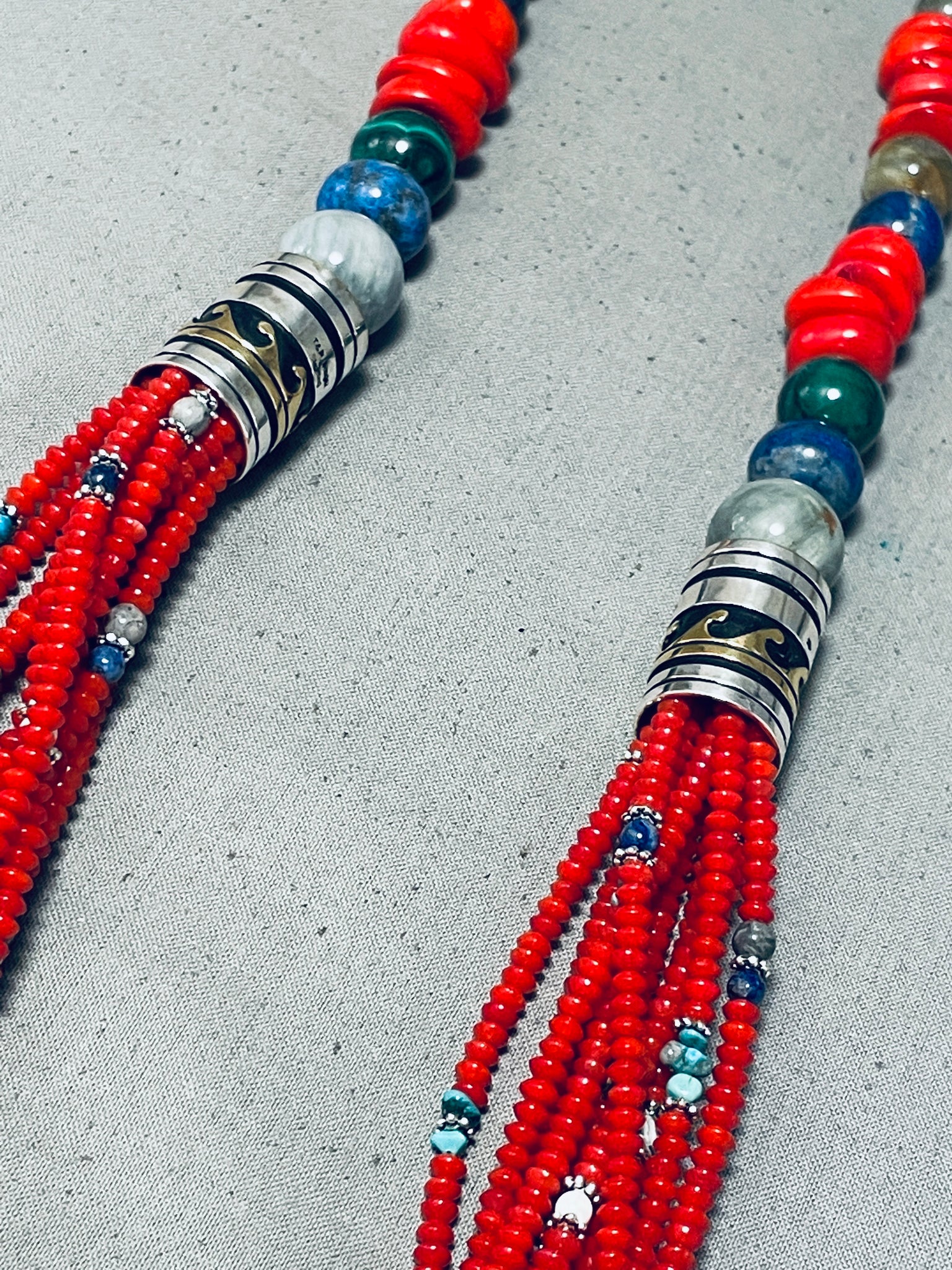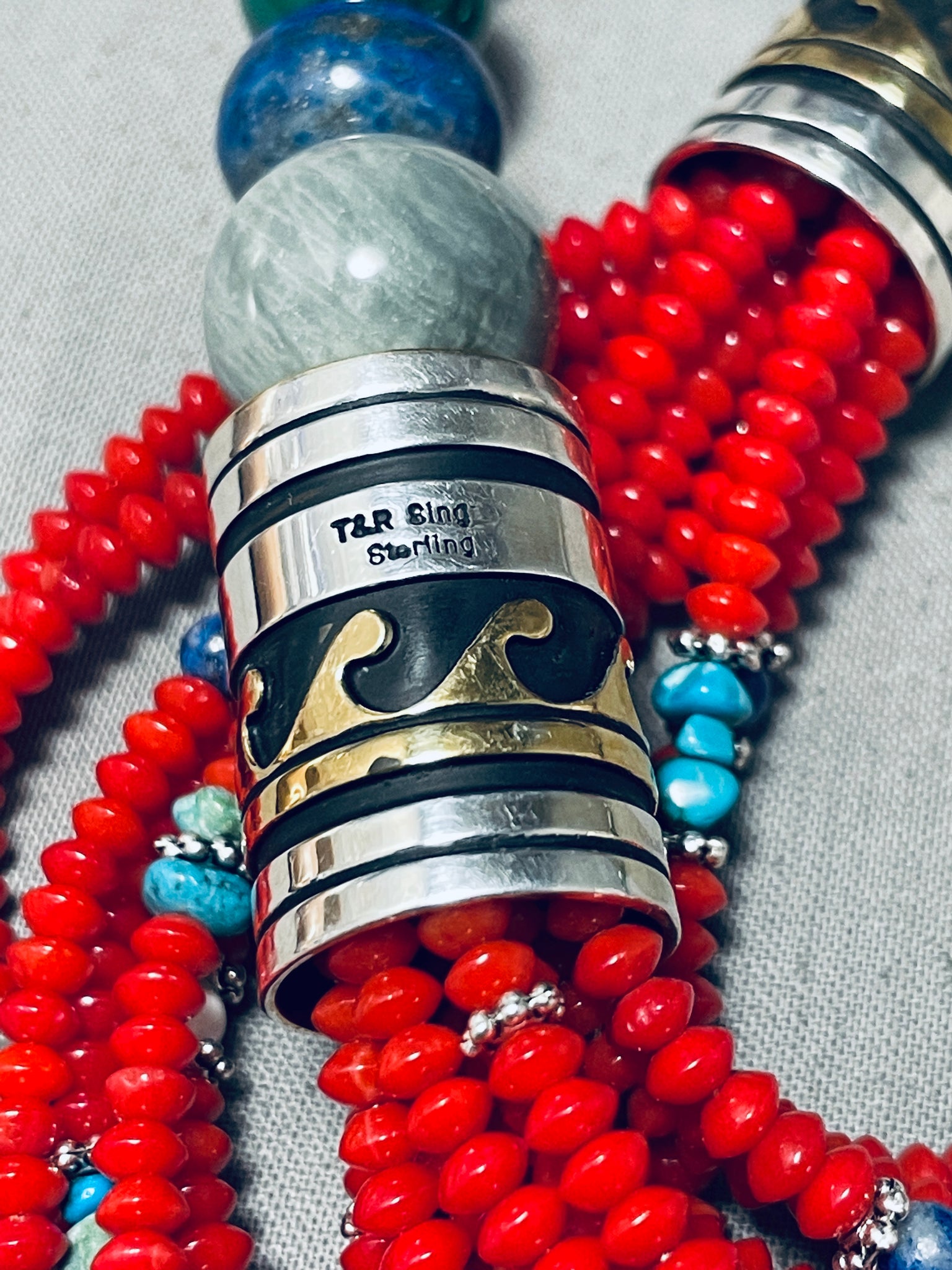 We are proud to offer this breathtaking Navajo silver necklace. The intense, vibrant colors of this necklace will take your breath away! Specifically chosen and strung in specific order, this artist has created an absolutely electrifying lengthy necklace of coral stones and various colorful round ball beads of stones that include those of lapis and gaspeite, just to name a couple! And if that weren't enough - the artist strung the fabulous handcrafted 1" two-tone silver tube at each side where the 10 strands of small coral beads with additional small stones of turquoise and others that hang there at the center of the necklace! Simply stunning! Sterling silver, marked. Signed by Navajo artist, Rose Singer. The length of the necklace measures around 30". Sturdy 174 grams.