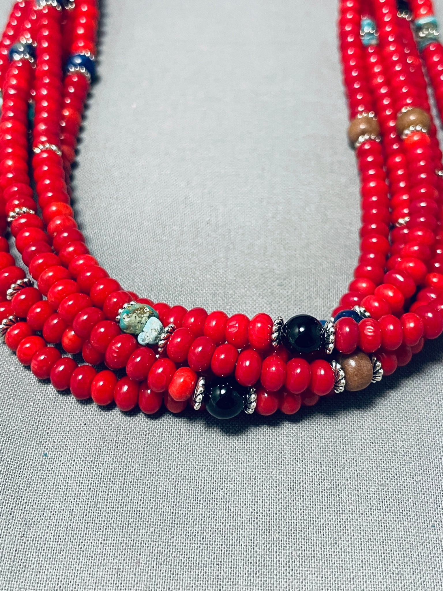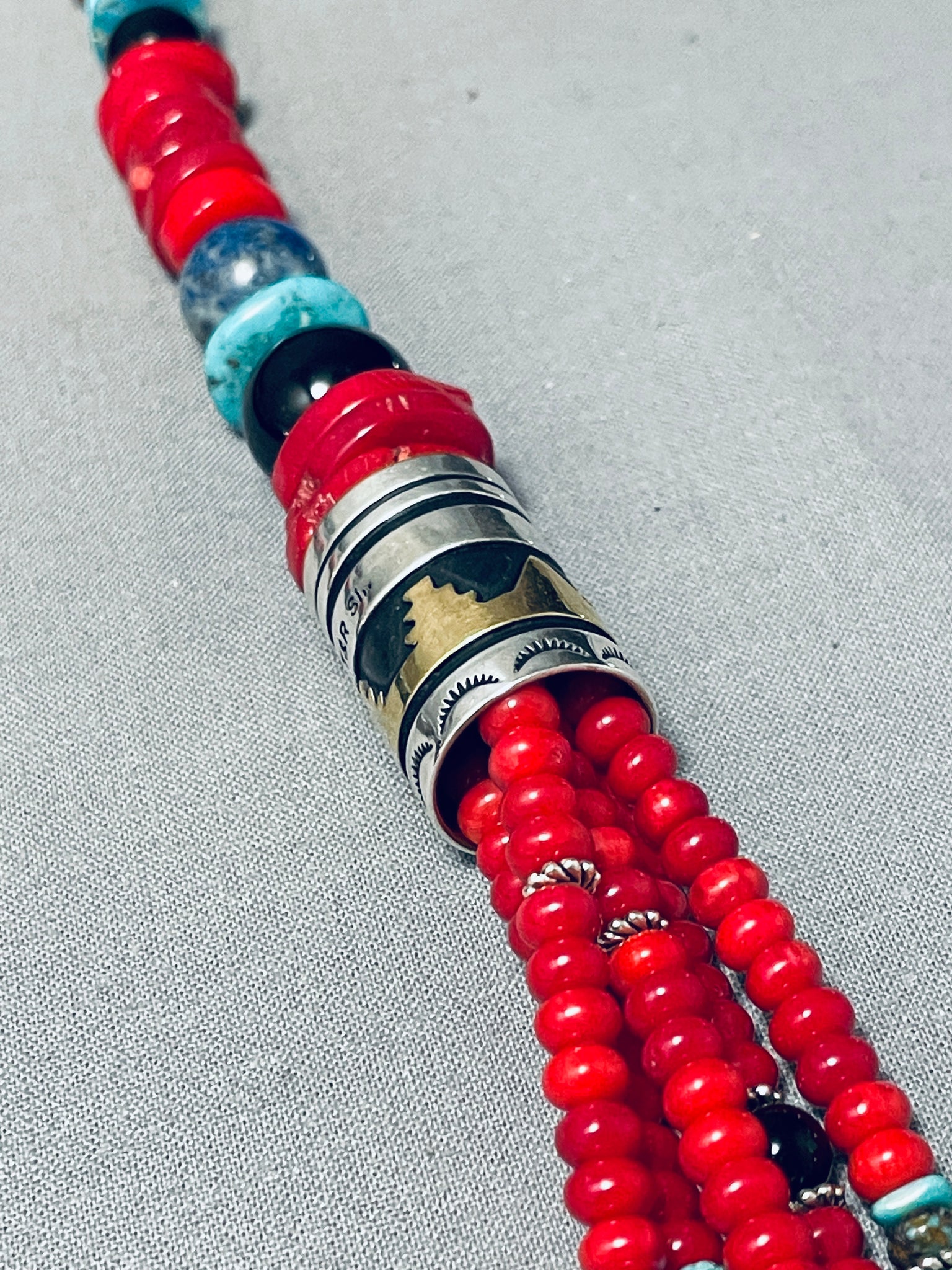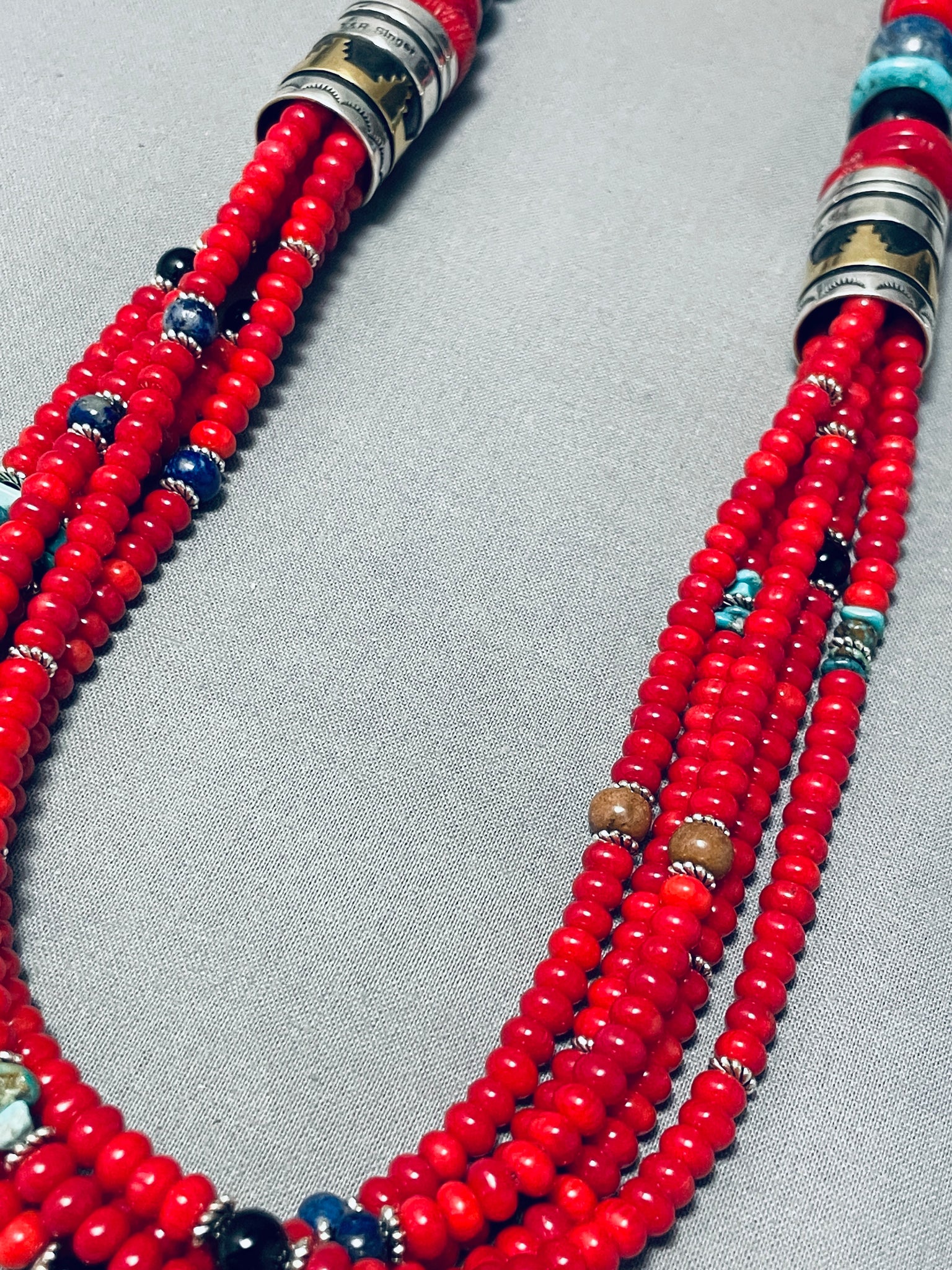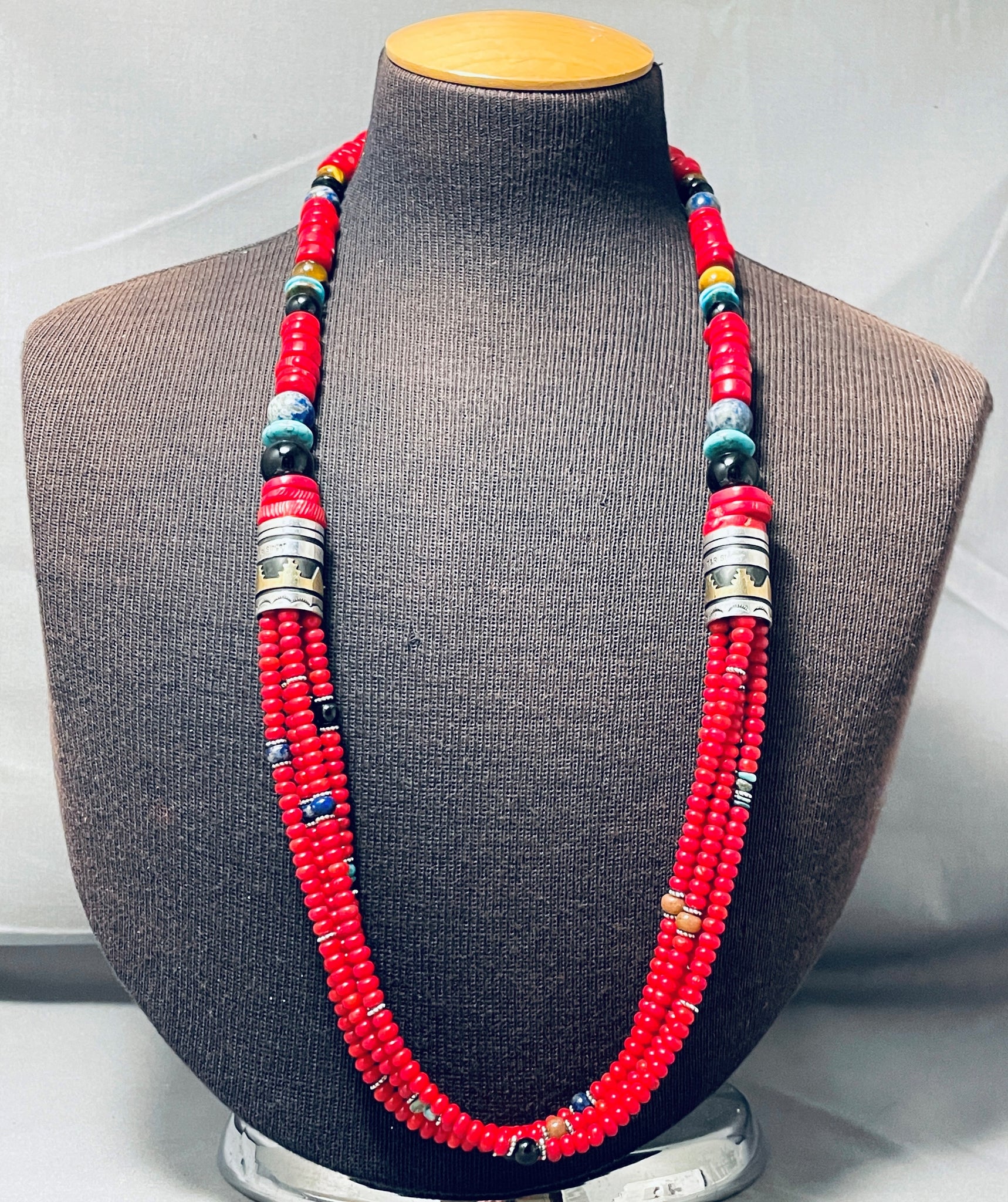 This is an exceptional Navajo multiple stone silver necklace. This wonderful necklace consists mostly of chunky graduating coral stones that are in thick disc shapes and smaller rounded disc shapes. Situated throughout the corals are beautiful stones and shells that consist of rounded tigers eye, onyx, lapis, and turquoise. Seperating the bottom five strands from the top larger single strand are amazing handmade silver drum beads that each measure around 1" X 3/4". Accenting the drum bead are amazing sun stampings, geometric patterns and deep line segments. I absolutely love the detailing and colors on this necklace. Sterling silver. Cir. 1980's+. Signed by Navajo artist, T & R Singer. The length of the necklace measures around 29". Sturdy 171 grams.