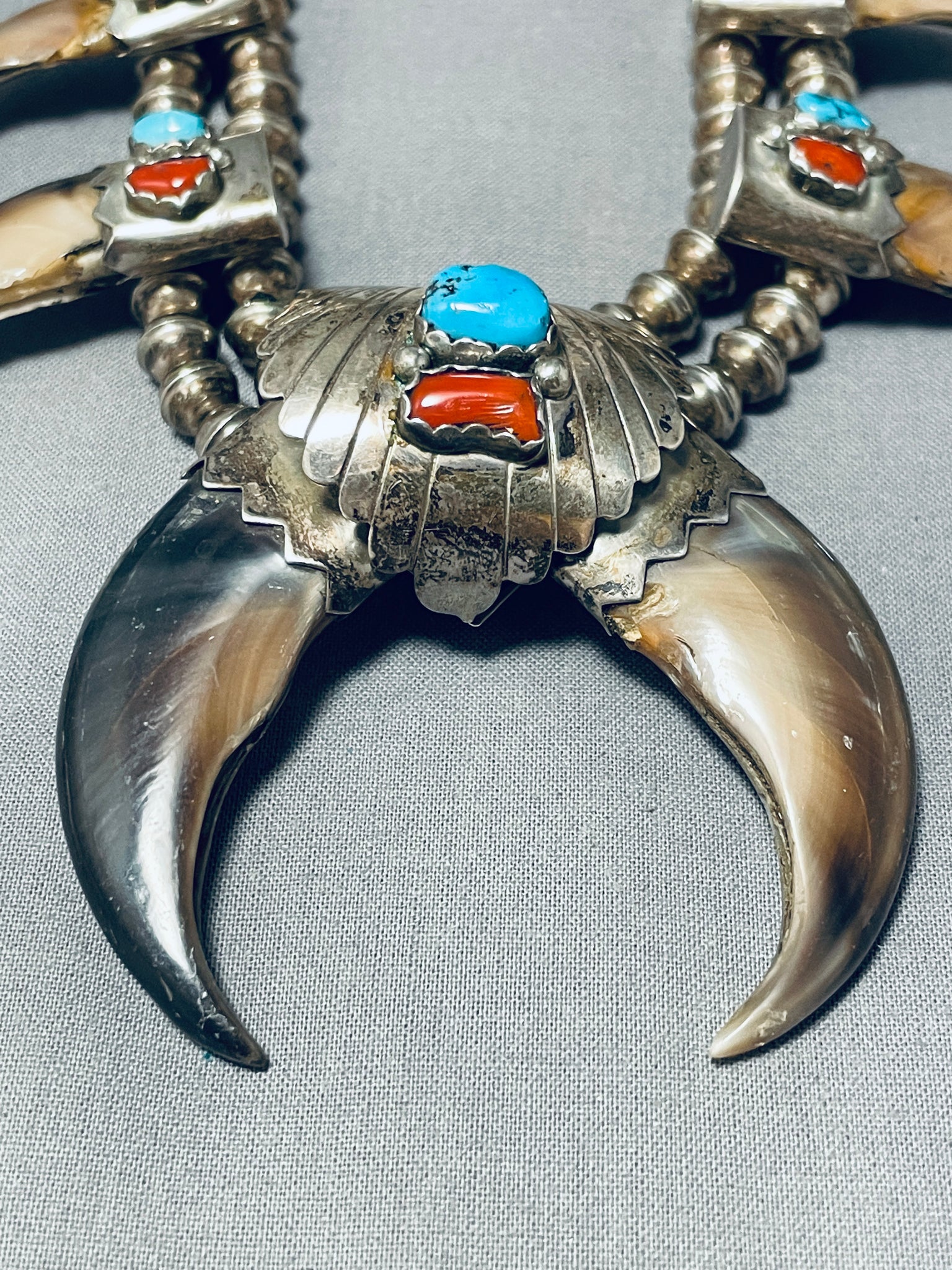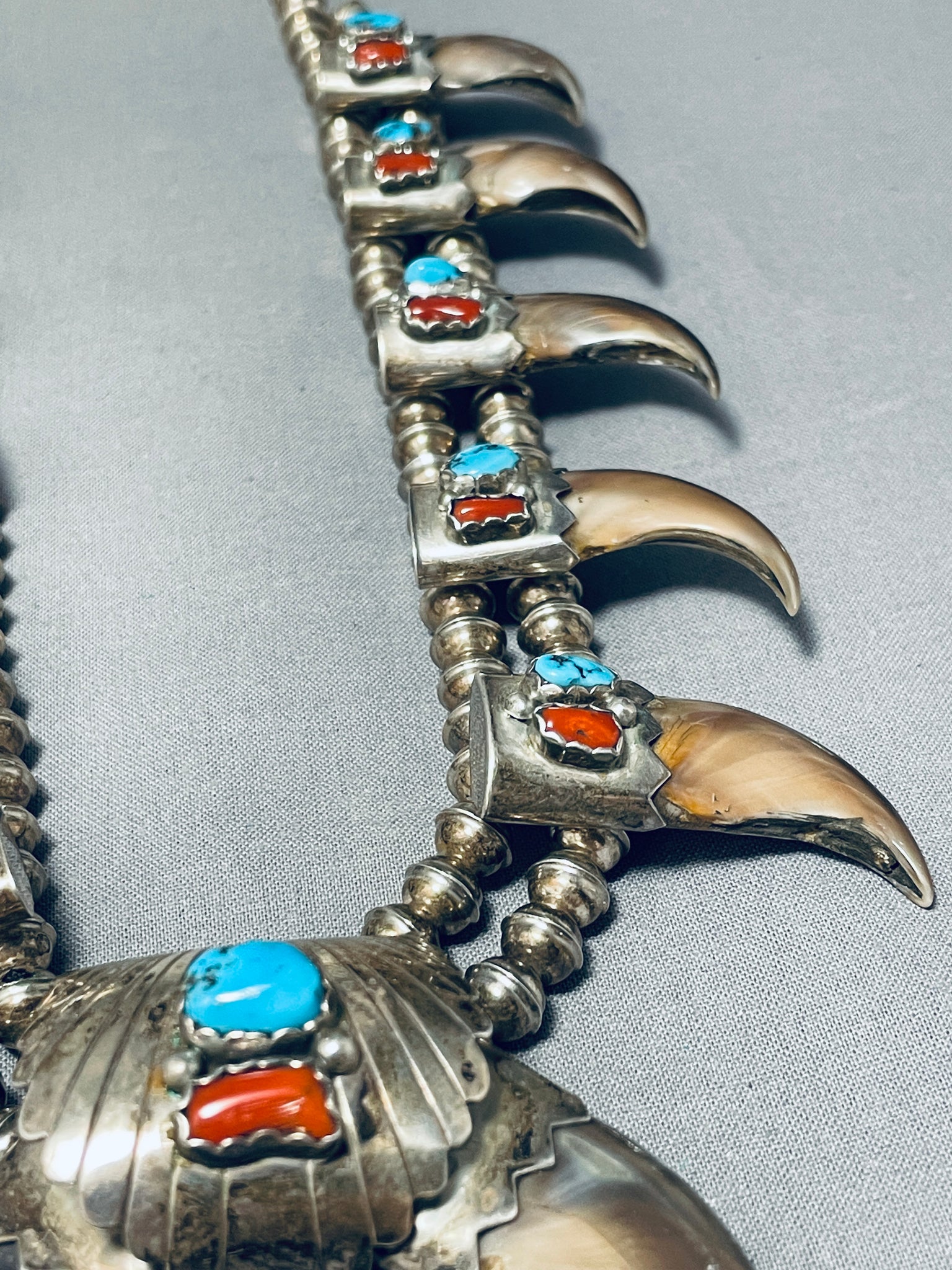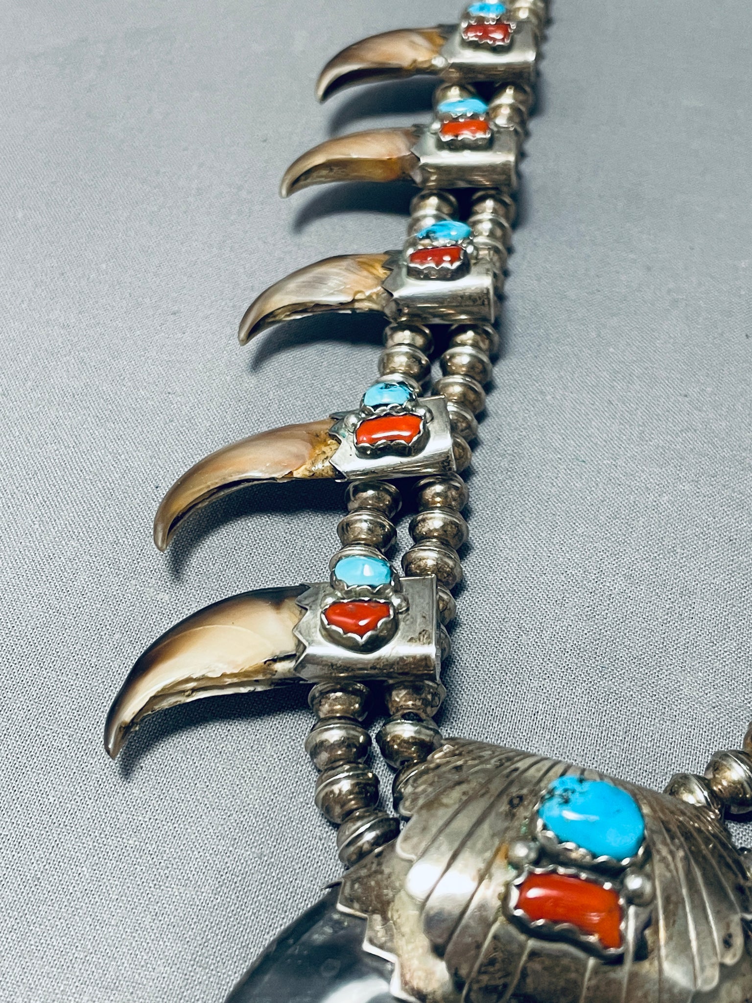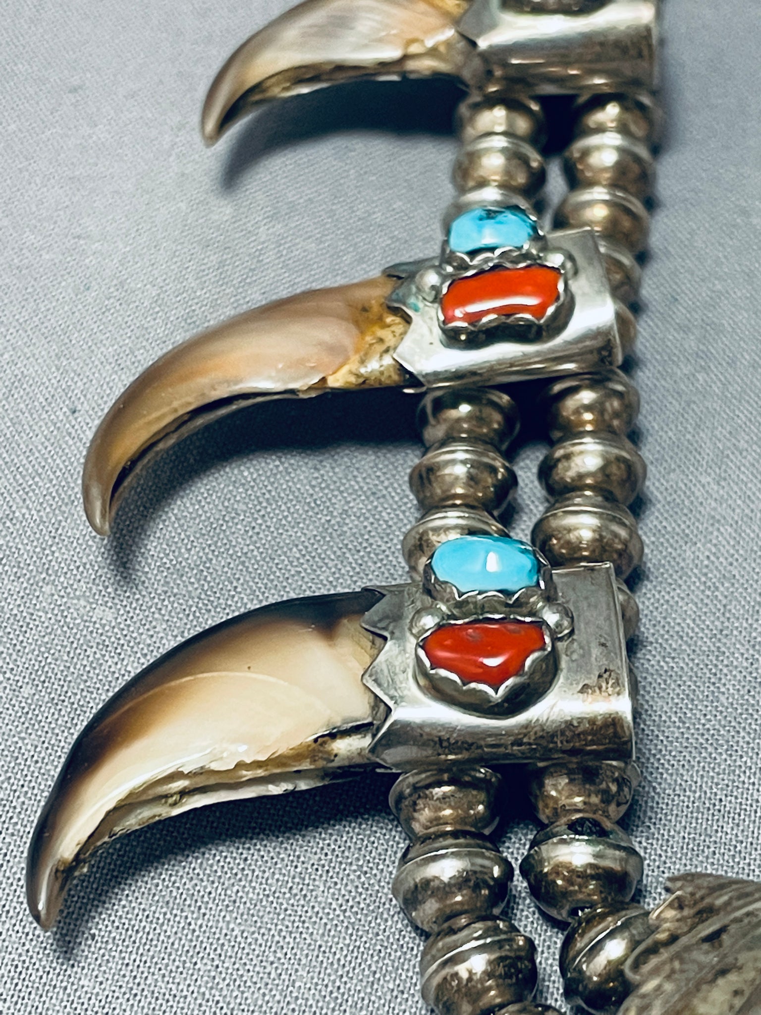Authentic Vintage Native American Navajo Bear Turquoise Sterling Silver Squash Blossom Necklace