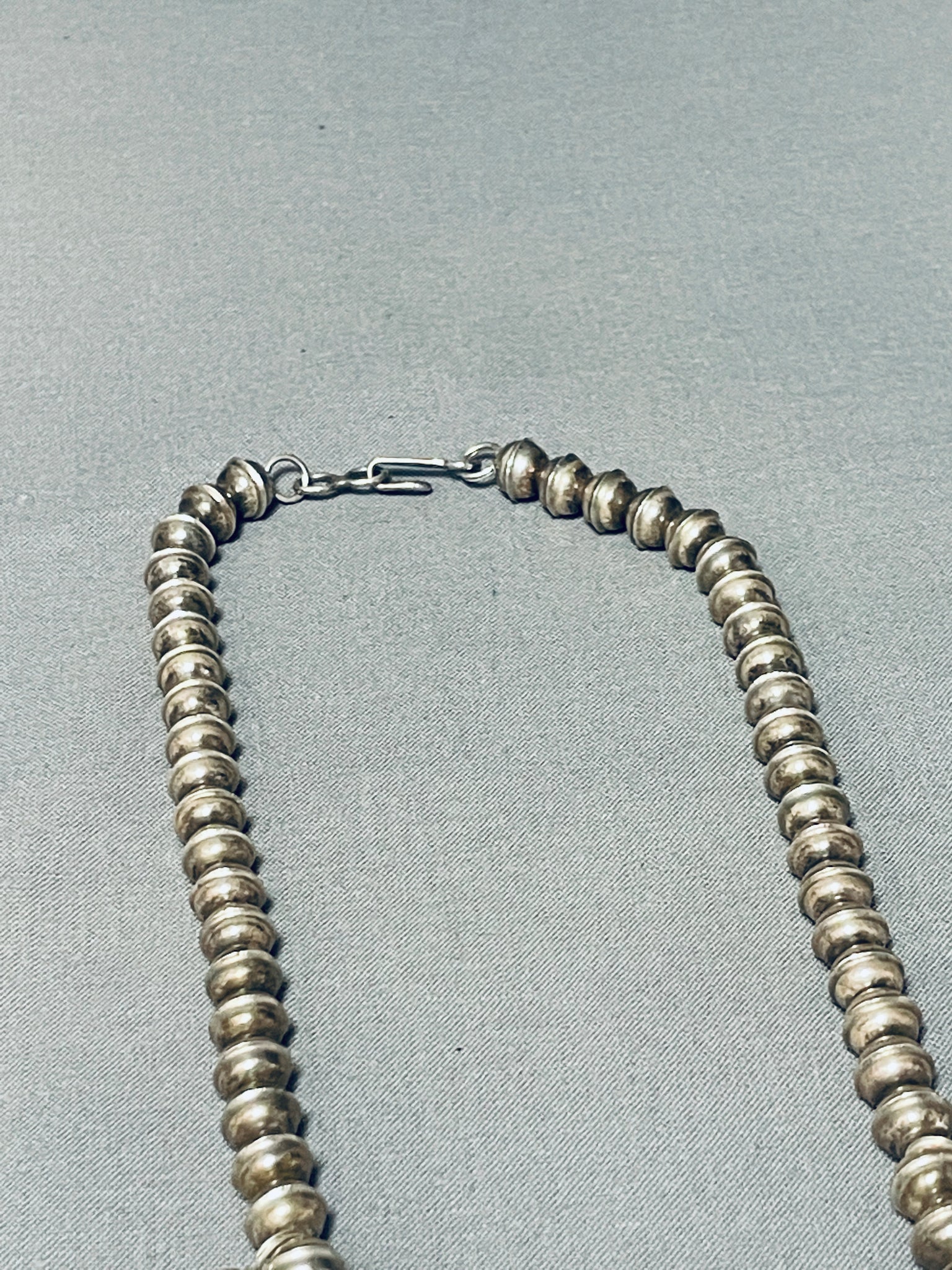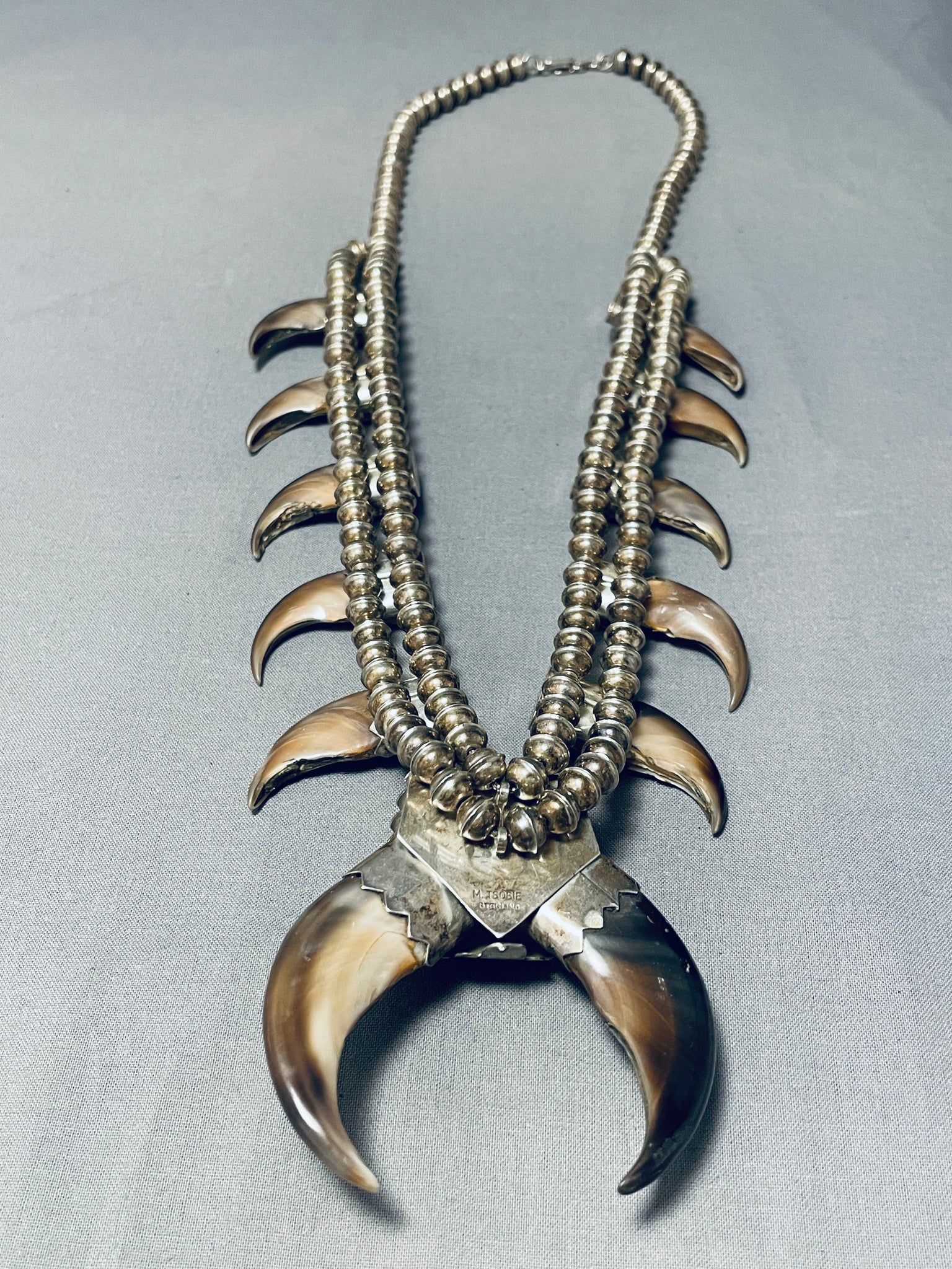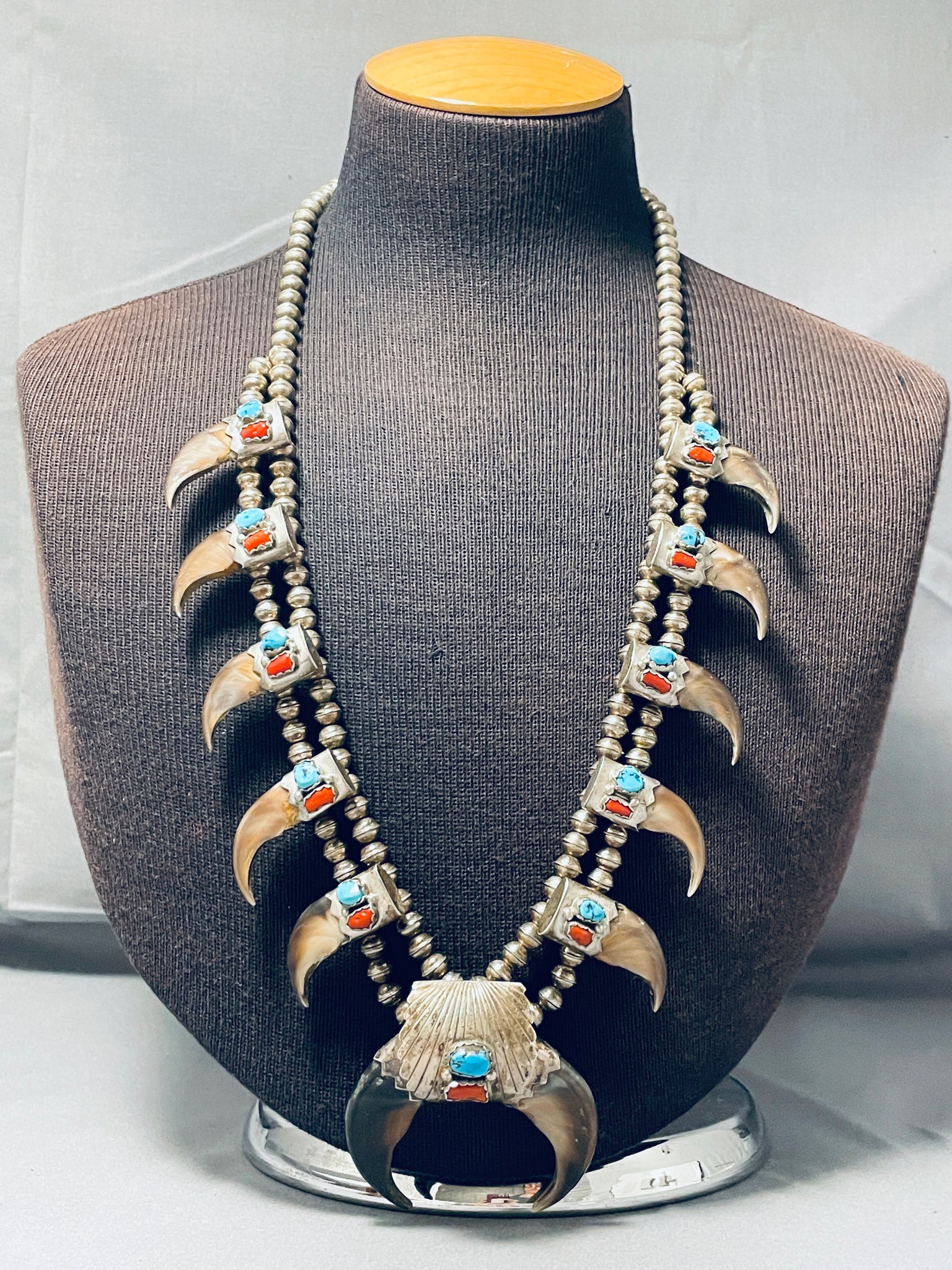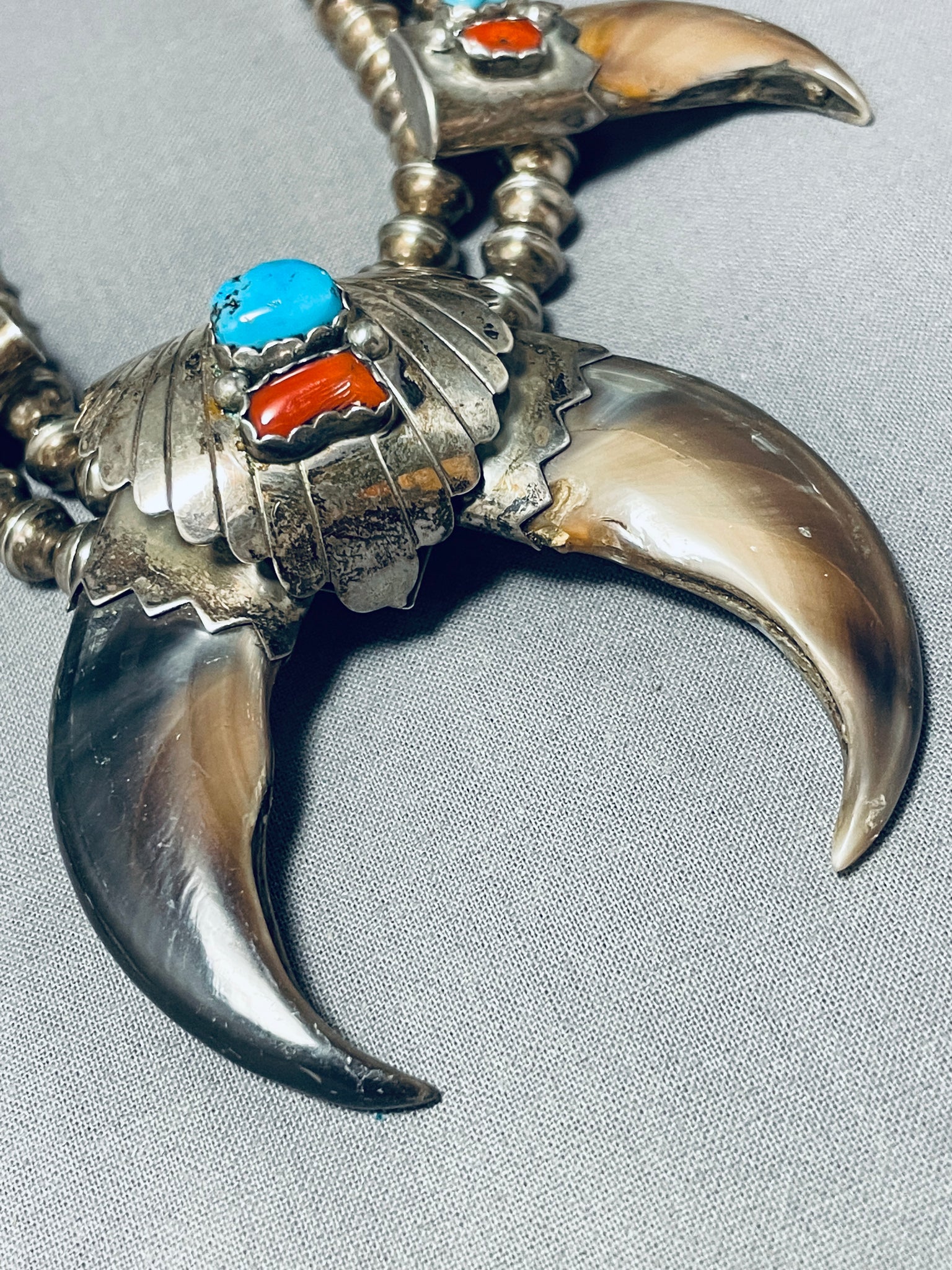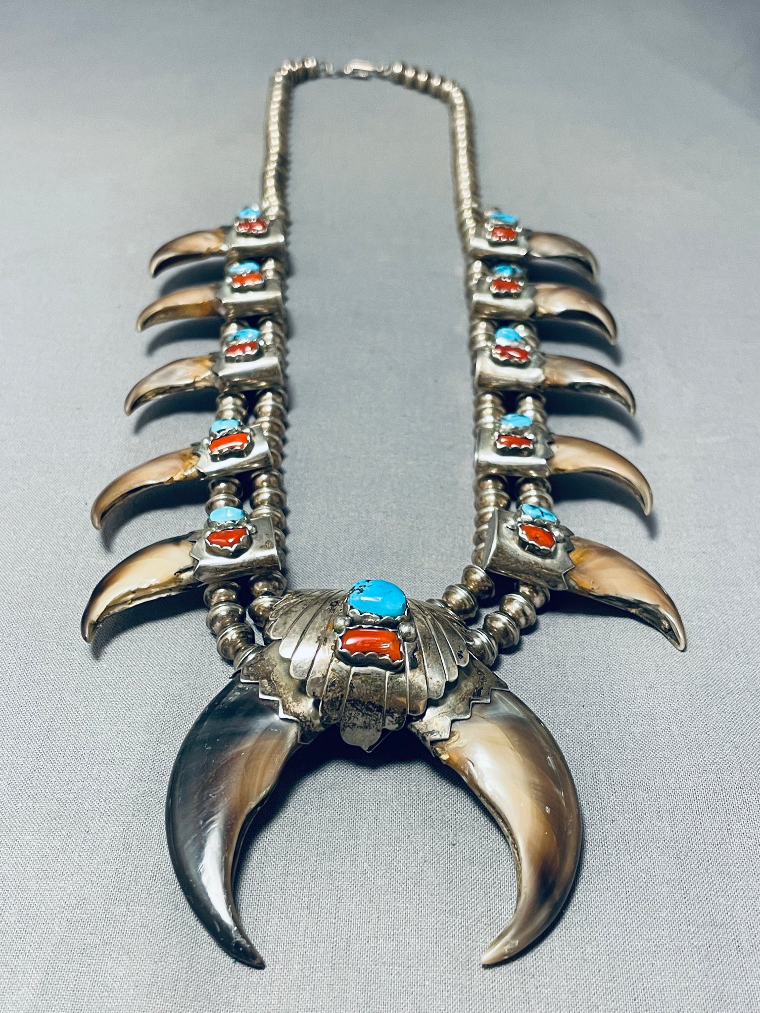 Authentic Vintage Native American Navajo Bear Turquoise Sterling Silver Squash Blossom Necklace