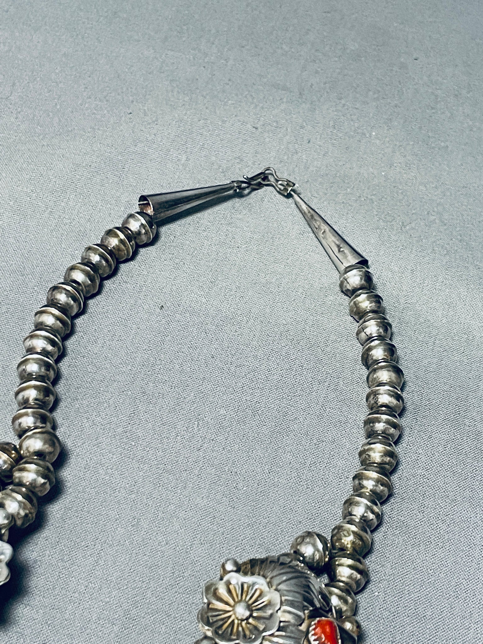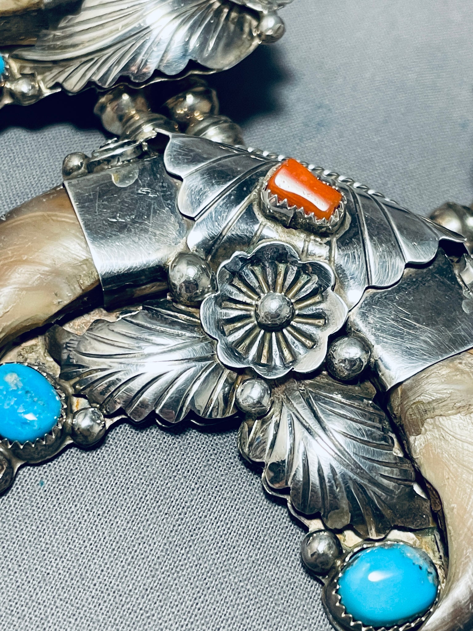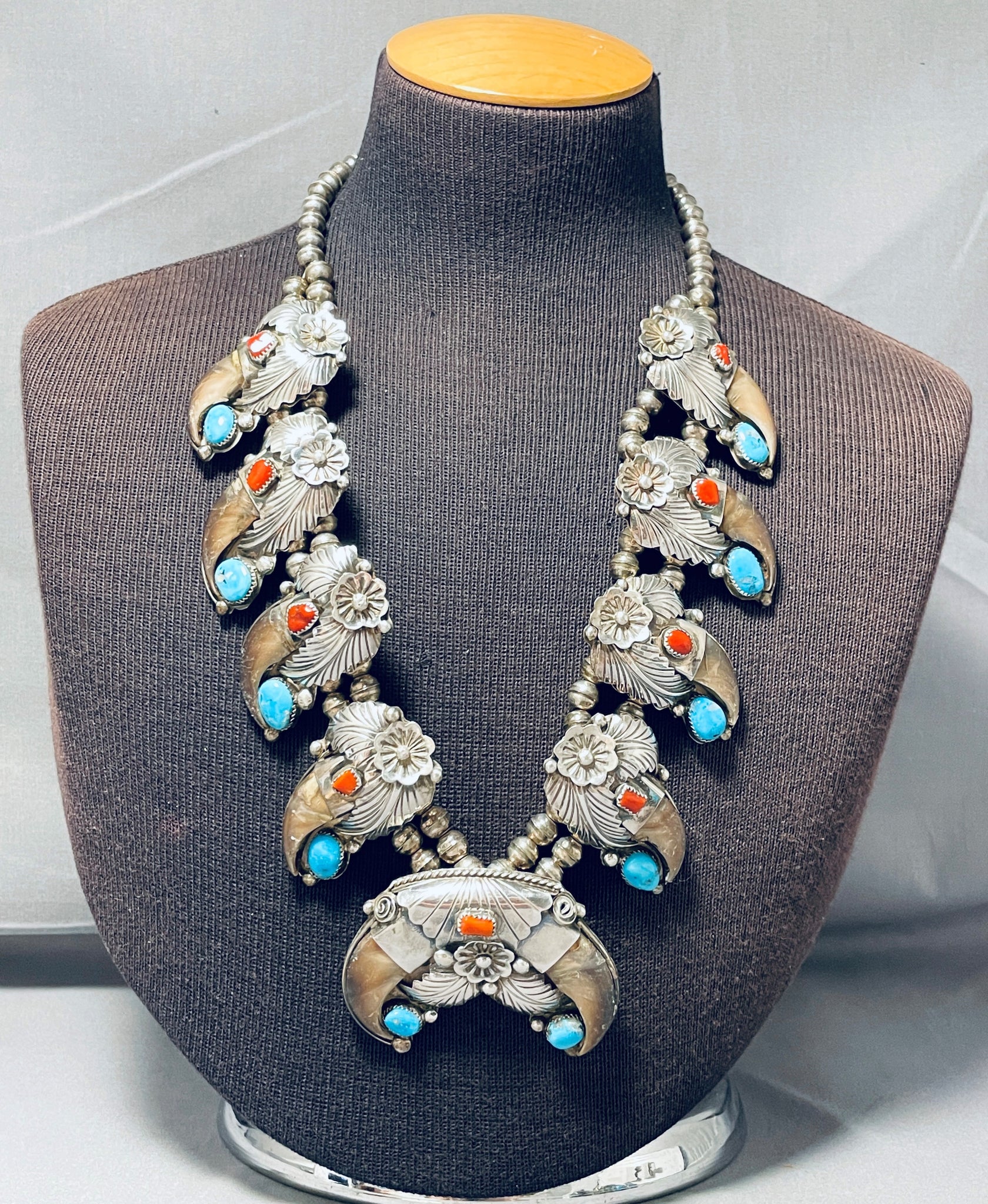 Authentic Vintage Native American Navajo Bear Turquoise Sterling Silver Squash Blossom Necklace