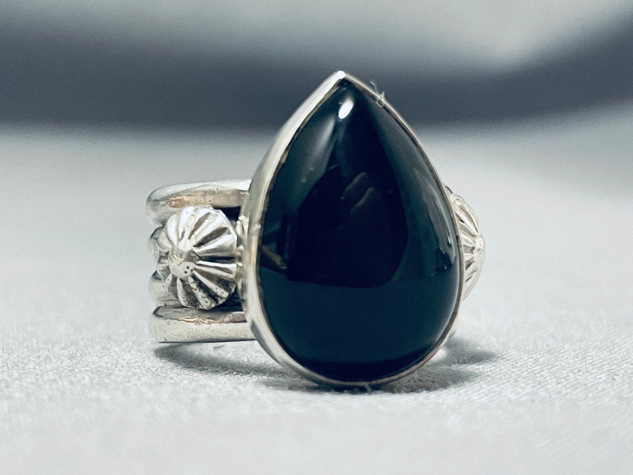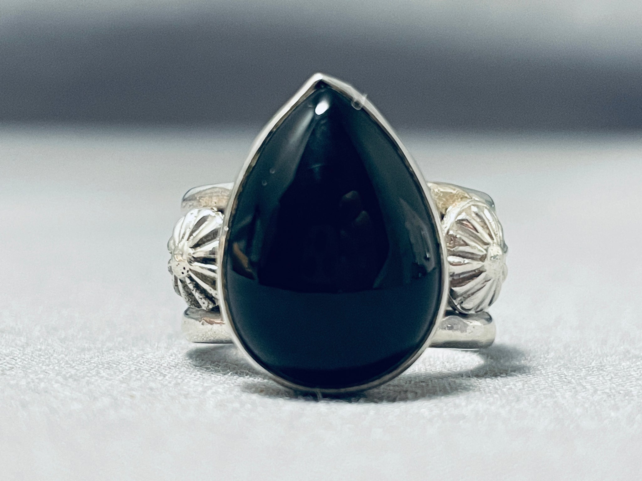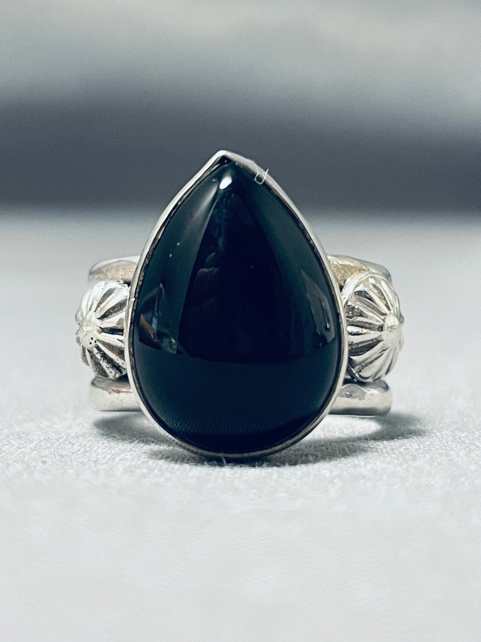 This is an exquisite Navajo single large black stone silver ring handmade by the famous artist, Ben Begaye. This remarkable ring contains a superior large teardrop shaped black onyx stone. The ring contains a marvelous sturdy and thick quadruple silver shank with two accenting large silver shells. The center stone measures around 3/4" x 1/2". The ring face measures around 3/4" x 1/2". Signed by Navajo artist, Ben Begaye. The ring size is around 8.5. Cir. 1980's+. Sterling silver, marked. Sturdy 12 grams.