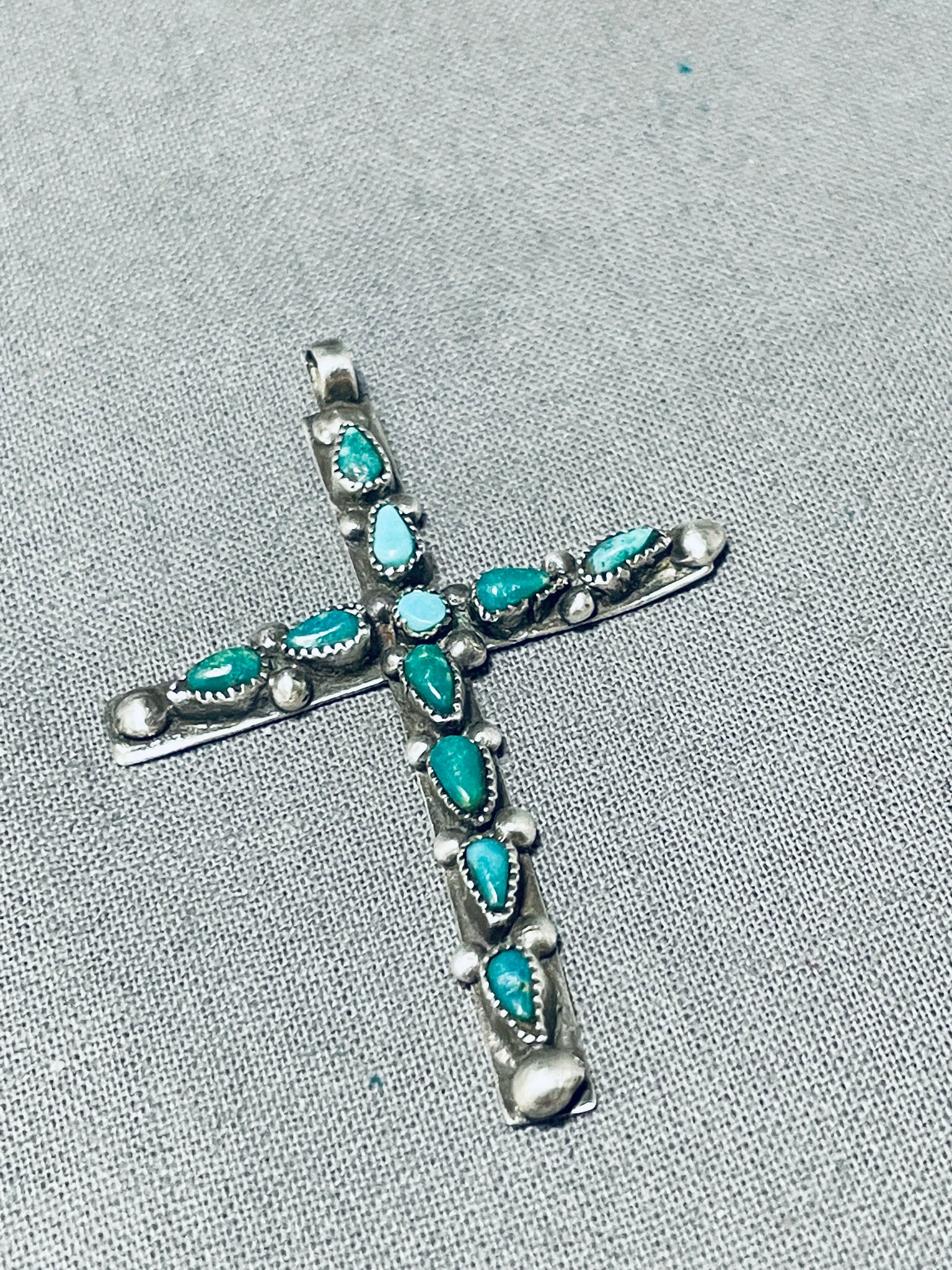 Authentic Vintage Native American Navajo Blue Green Turquoise Sterling Silver Cross Pendant