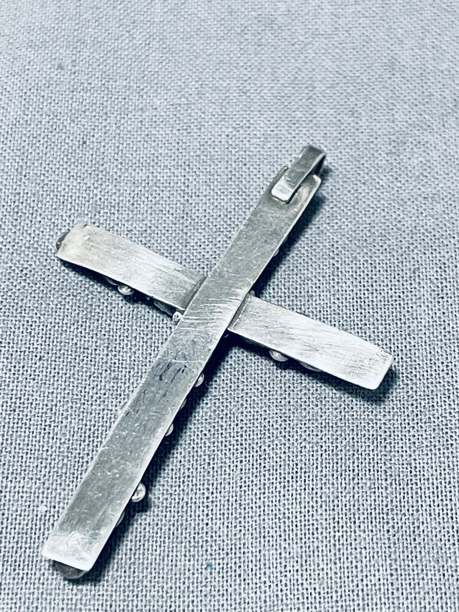 Up for sale is this amazing vintage Navajo sterling silver cross pendant! It features teardrop-shaped blue green turquoise stones that were intricately carved by hand, sterling silver beads, and a sterling silver bai! Absolutely Lovely! The stones measure around 1/8" x 1/8". Sterling silver. The pendant measures around 1-3/4" x 1-1/4". Sturdy 3 grams. Cir Mid Century.