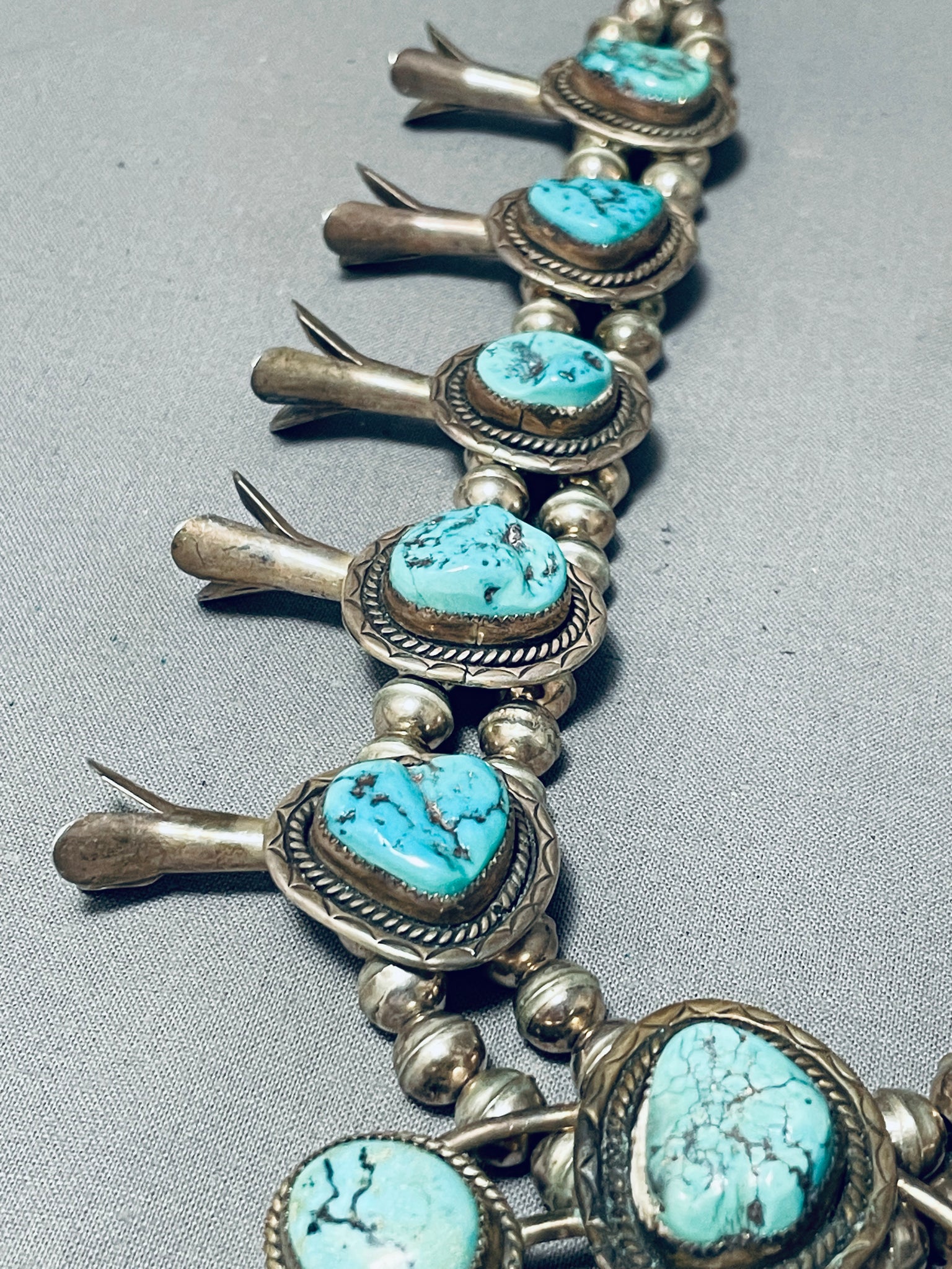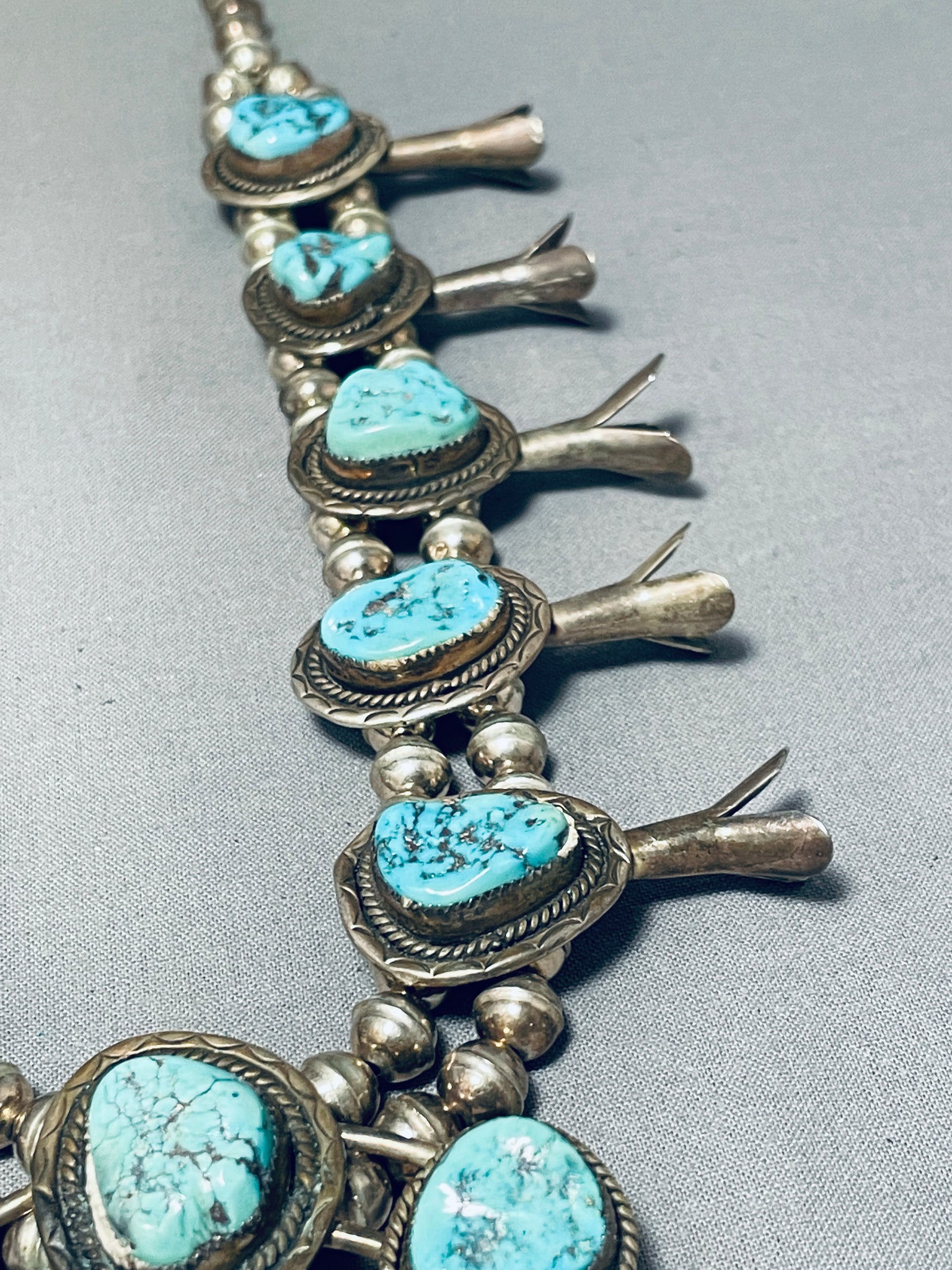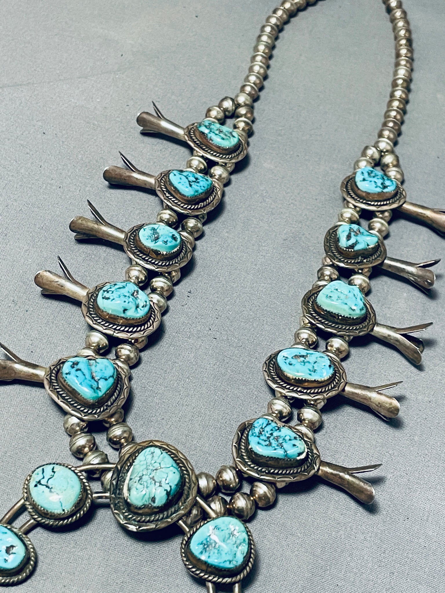 Authentic Vintage Native American Navajo Blue Turquoise Sterling Silver Squash Blossom Necklace