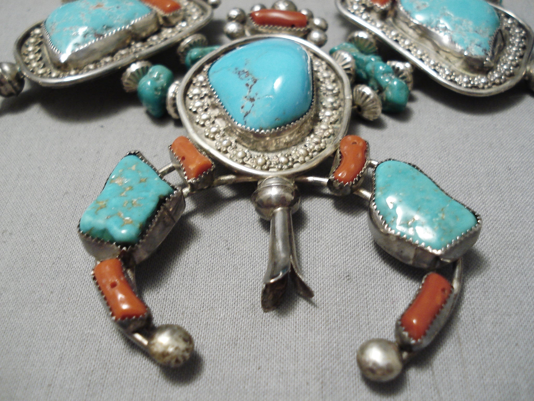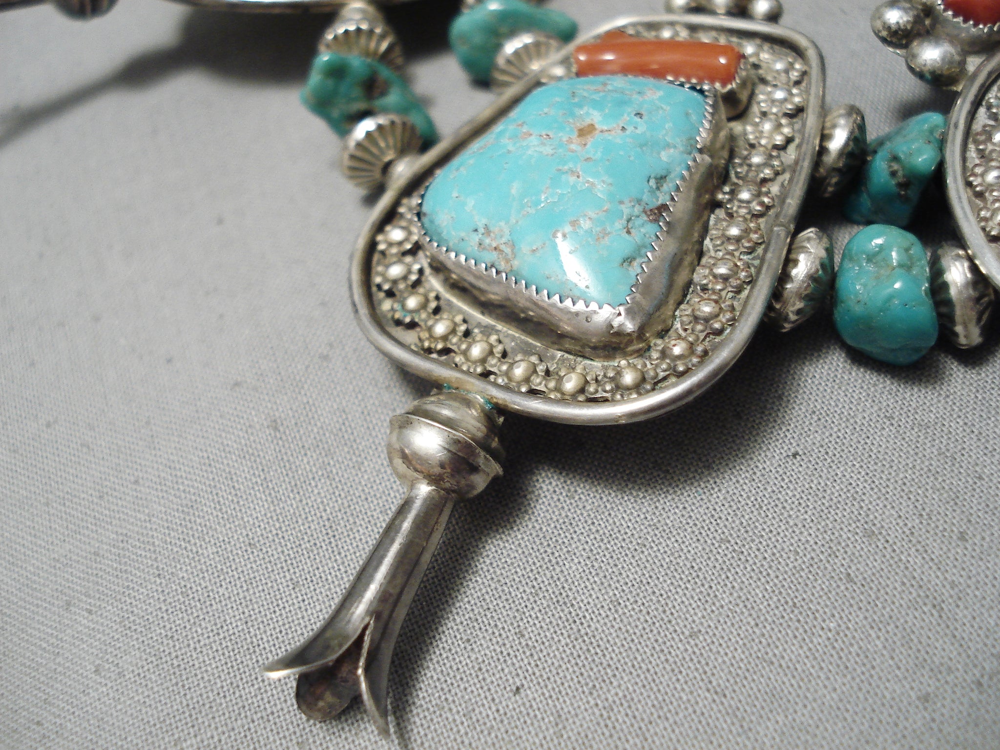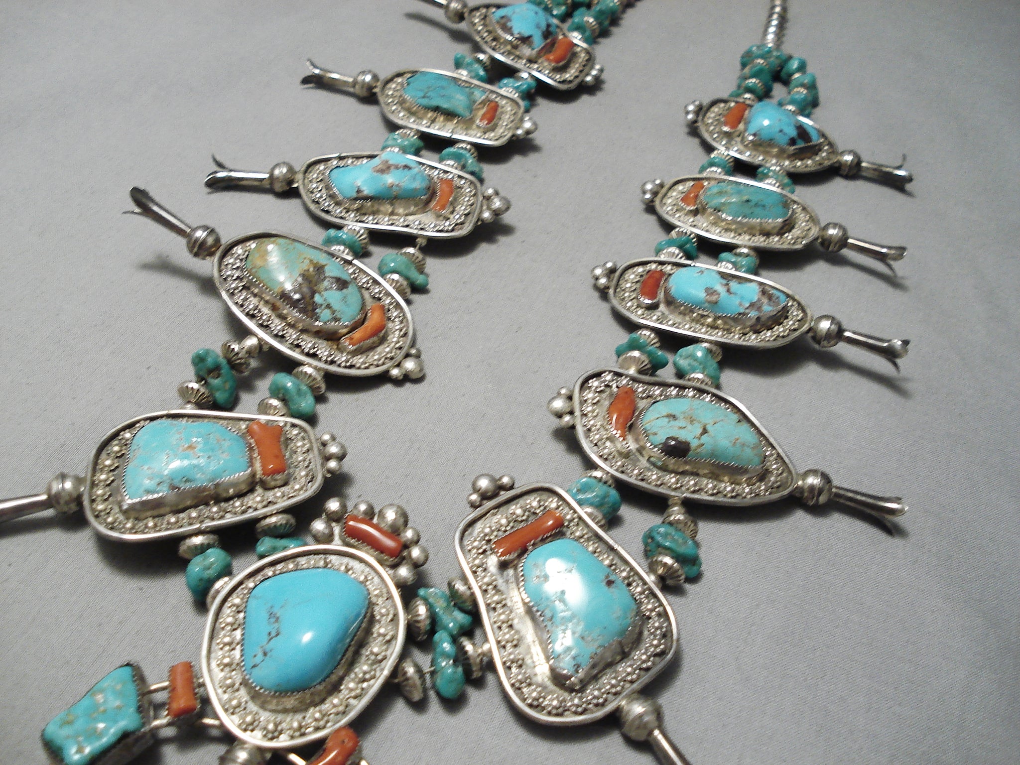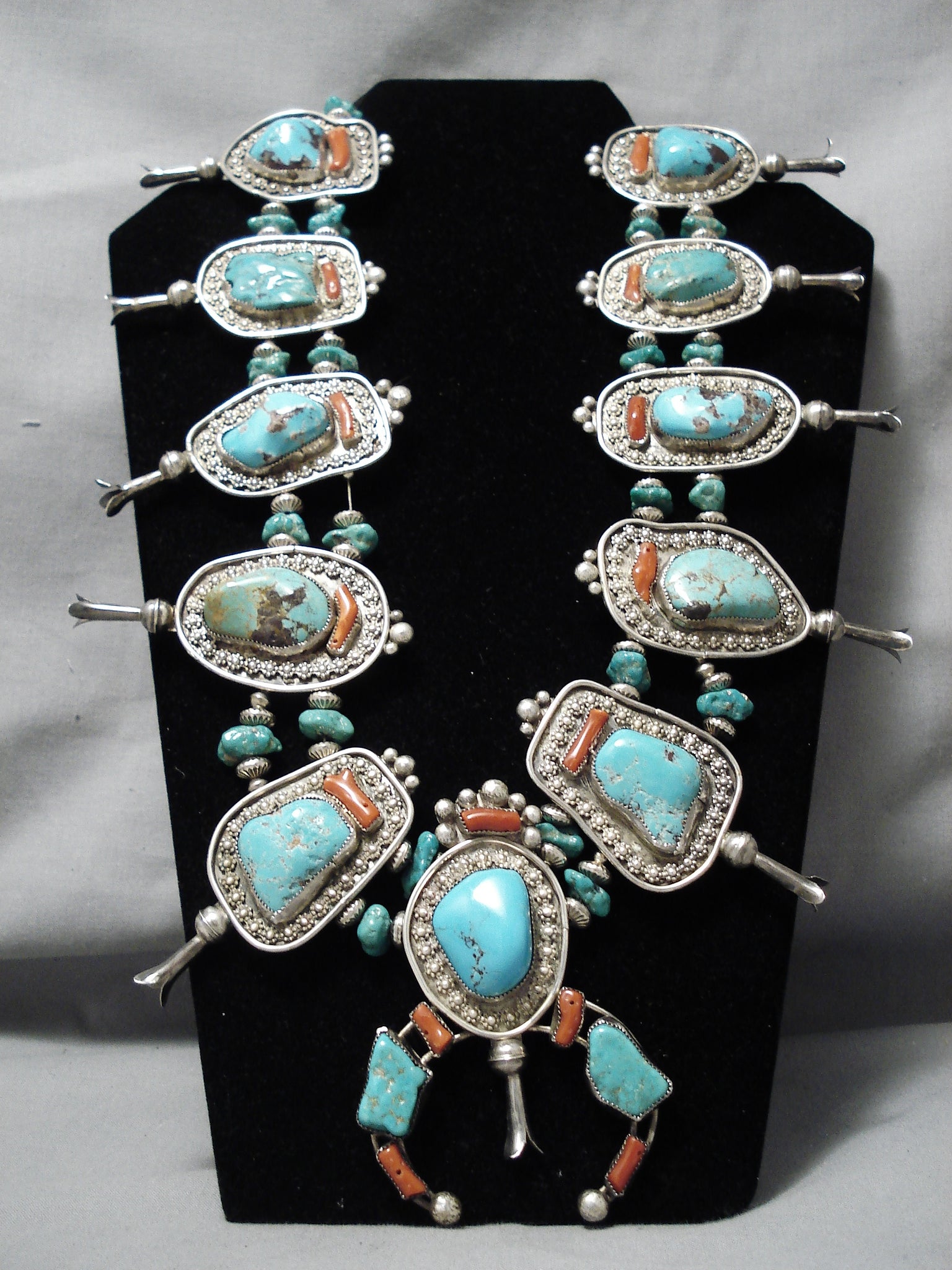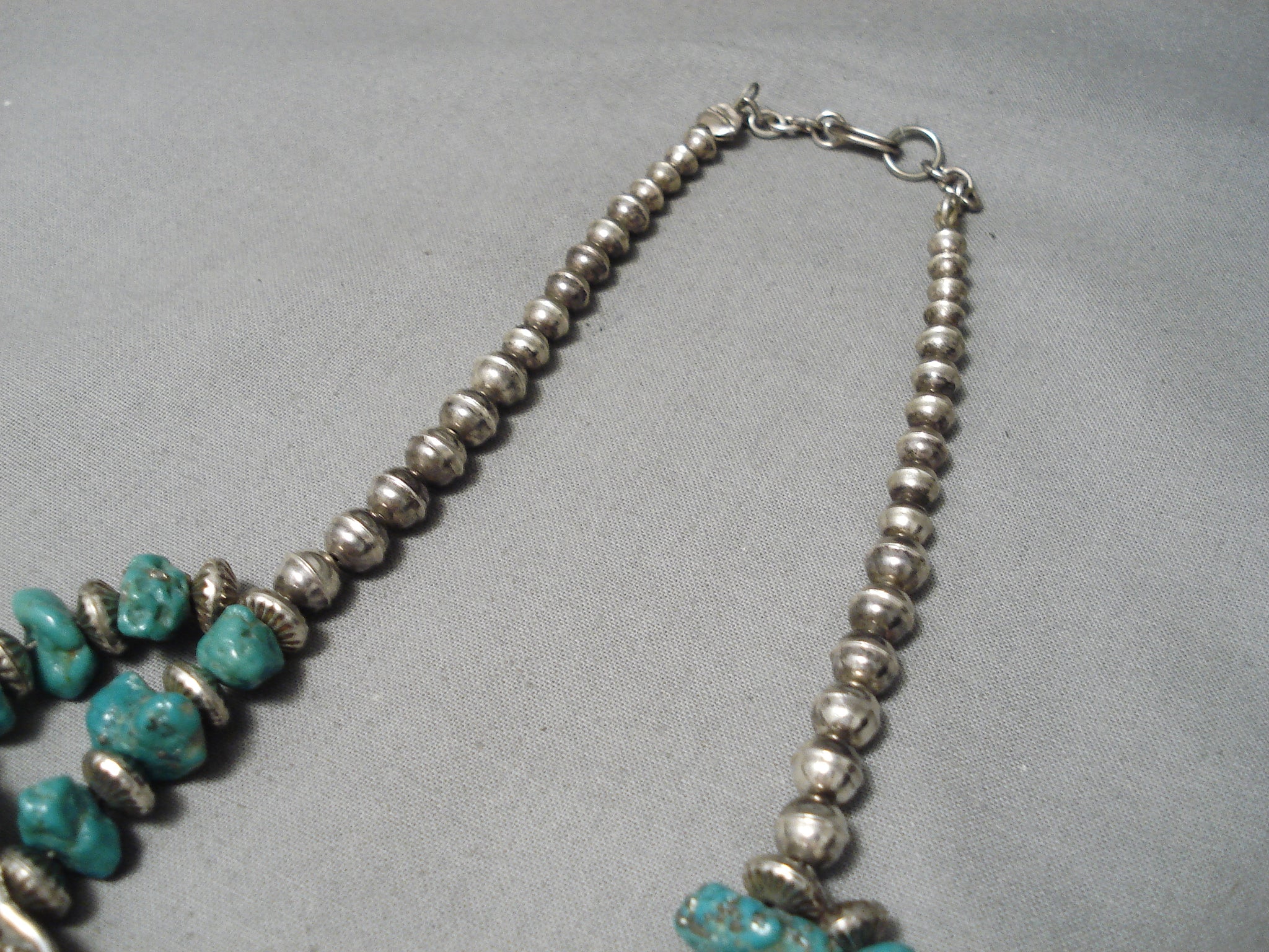 Authentic Vintage Native American Navajo Chunk Turquoise Sterling Silver Squash Blossom Necklace
