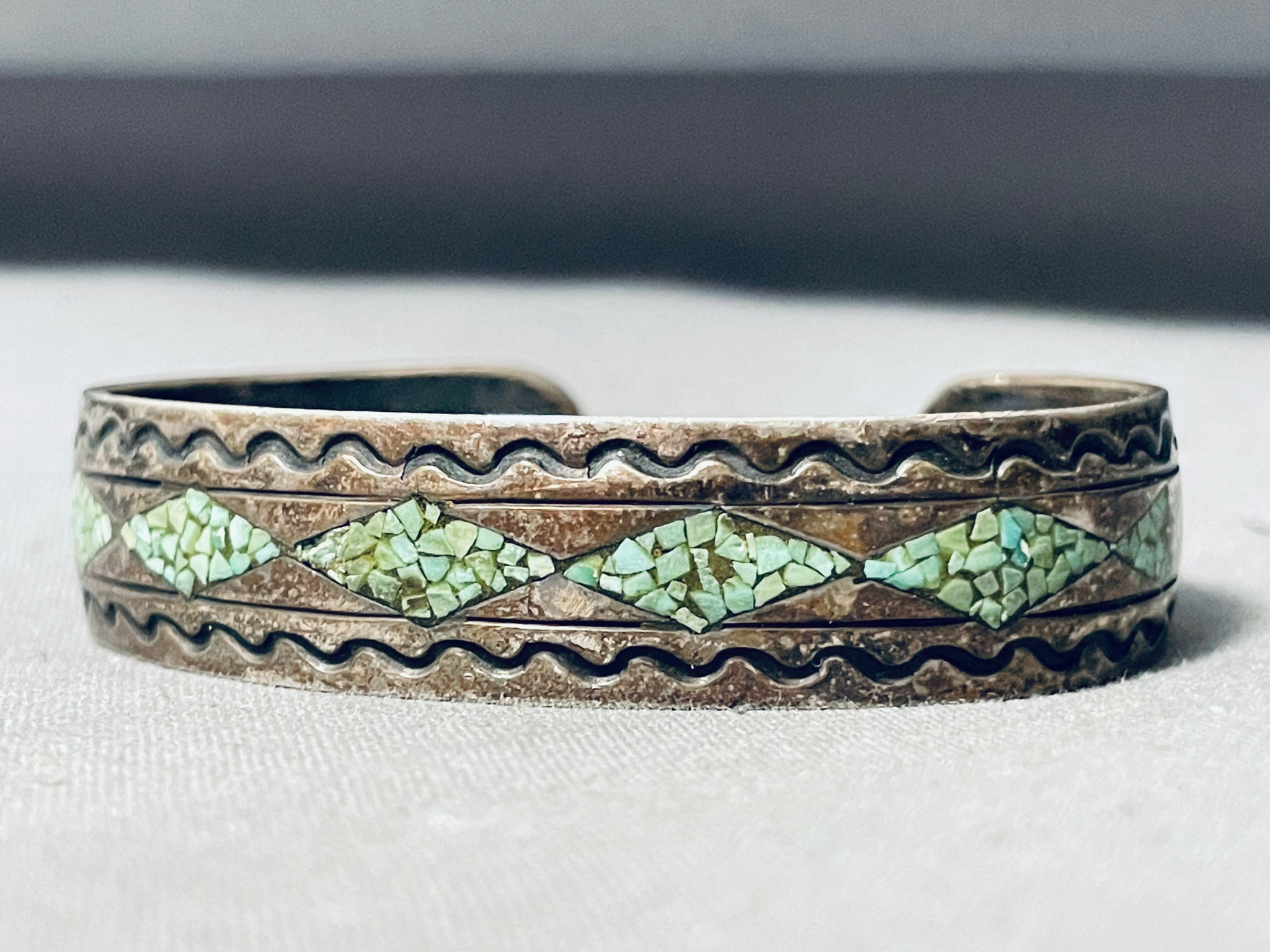 Authentic Vintage Native American Navajo Green Turquoise Inlay Sterling Silver Bracelet
