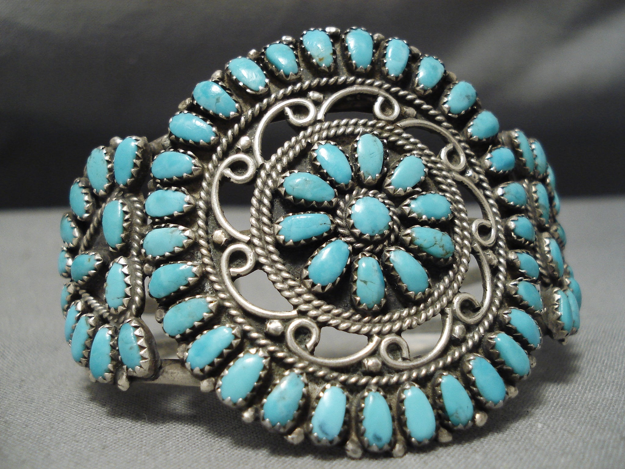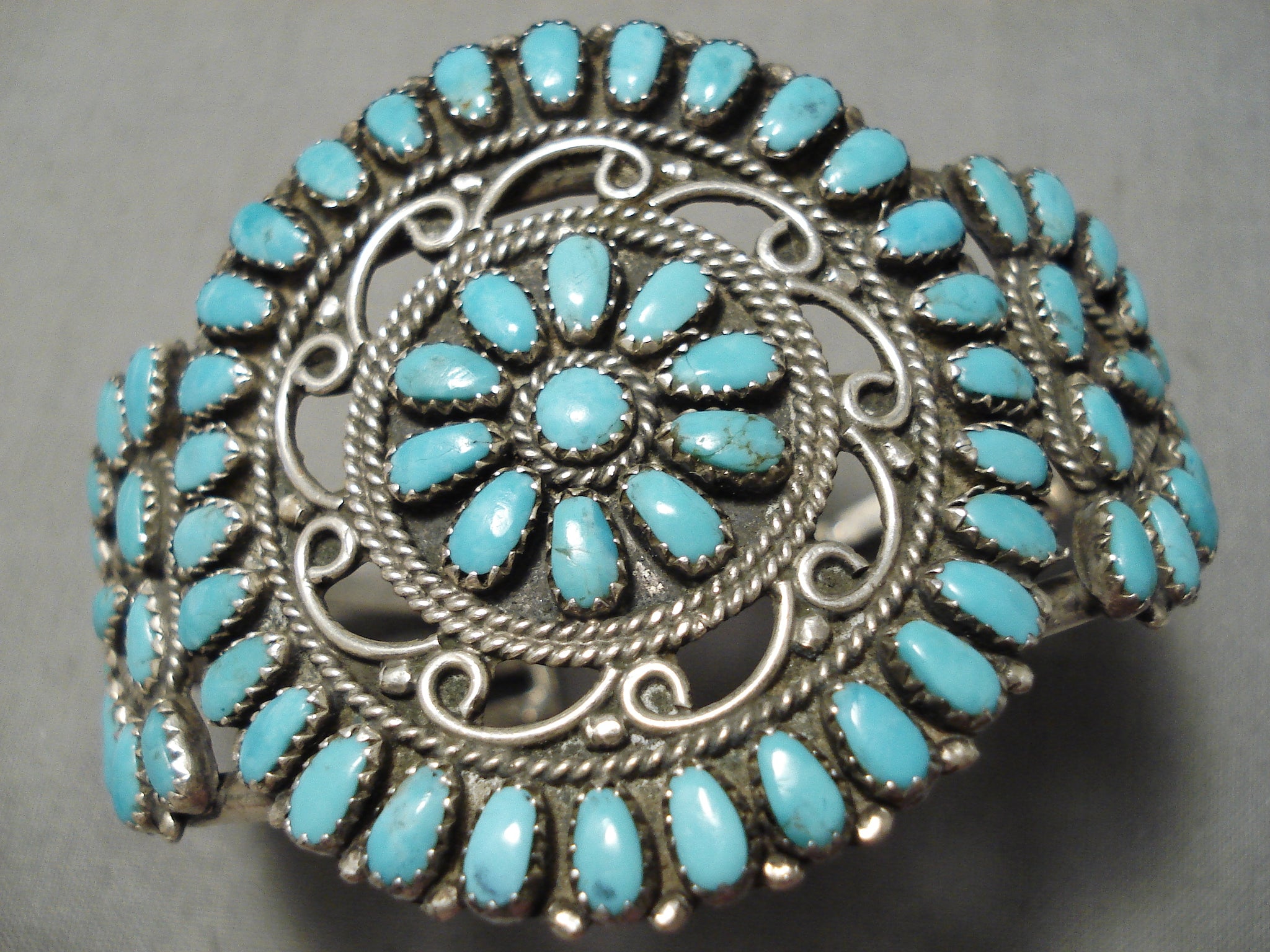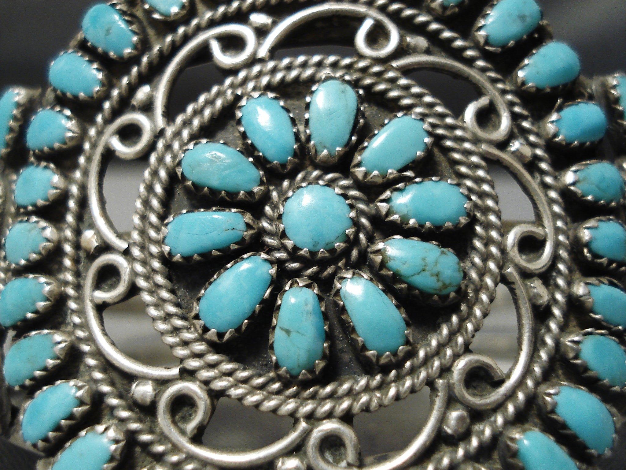 We are proud to offer this striking vintage Navajo silver bracelet..Wow! Love the design of this cluster turquoise bracelet – as 66 teardrop shape turquoise stones are fabulously arranged around the single 3/16” round turquoise - with an open design of silver swirls, rope and beads to create this masterful overall look! The stones measure around 1/4" x 1/8". The width of the bracelet measures around 2". Signed by Navajo artist, Larry Moses Begay. Sterling silver, marked. The inside end to end measures around 5-7/8" with an additional 1" gap. Sturdy 40 grams.