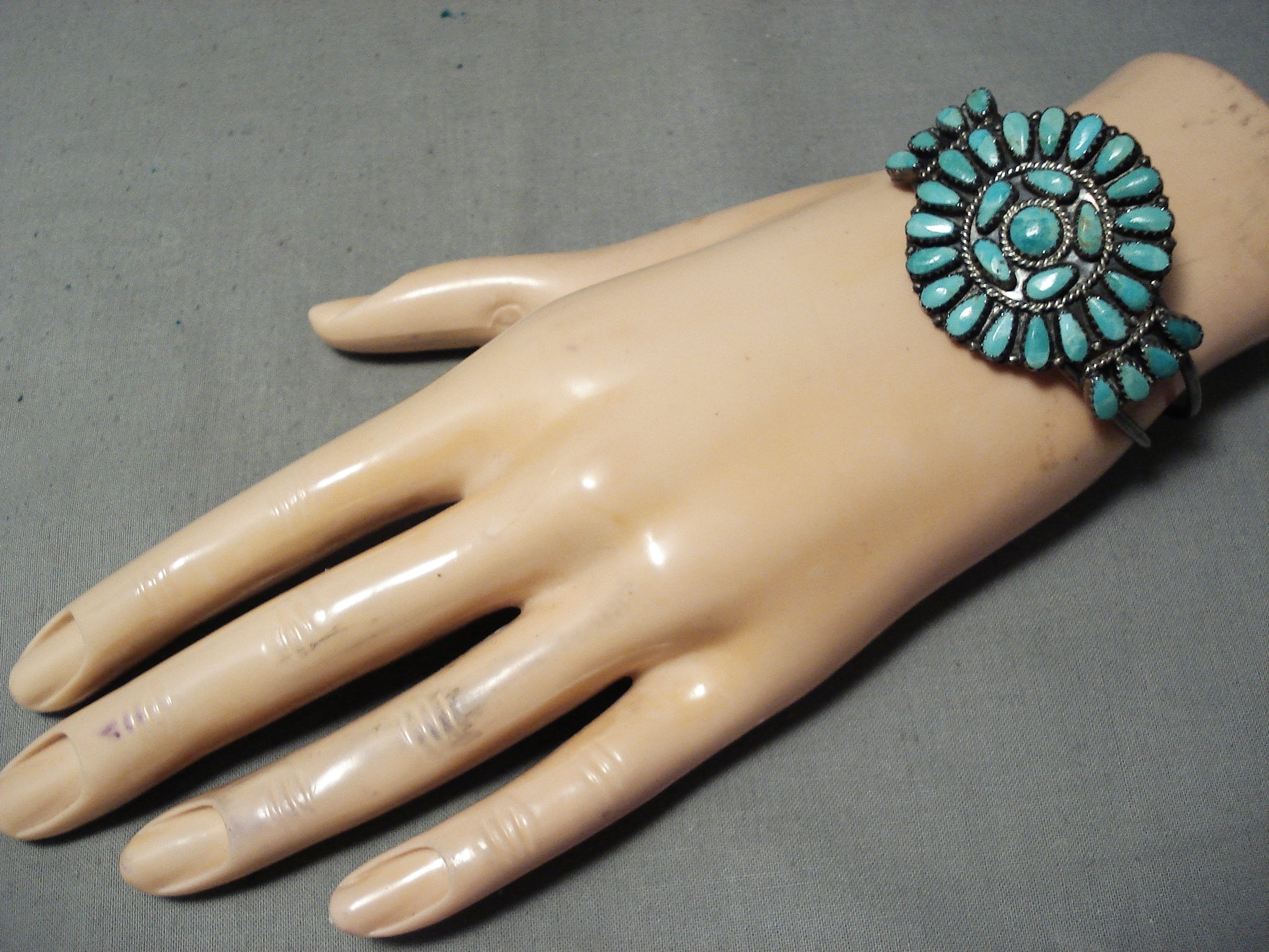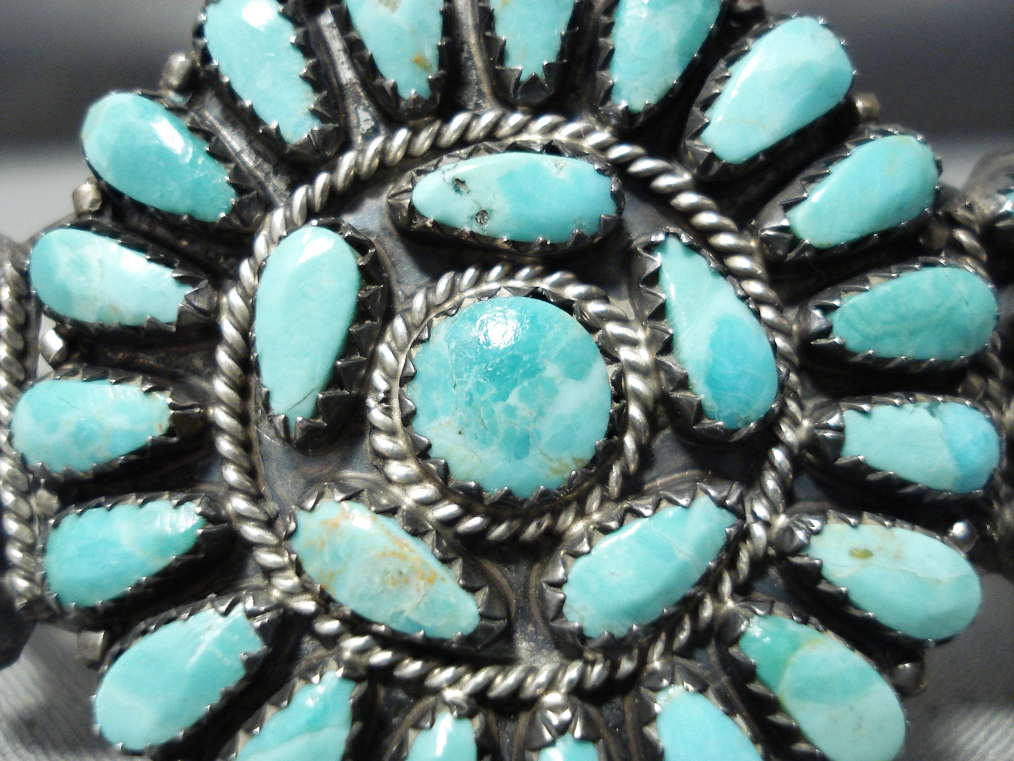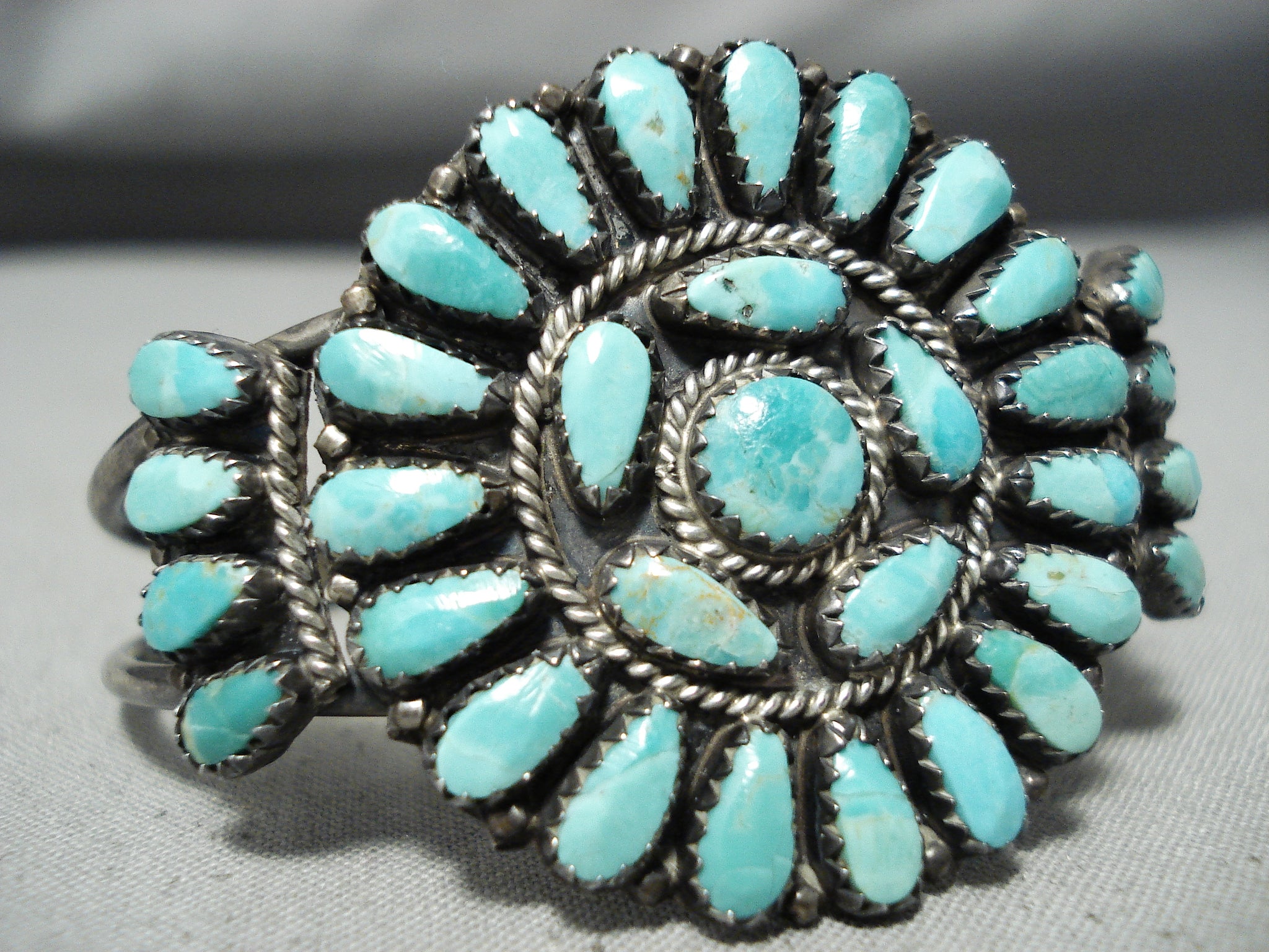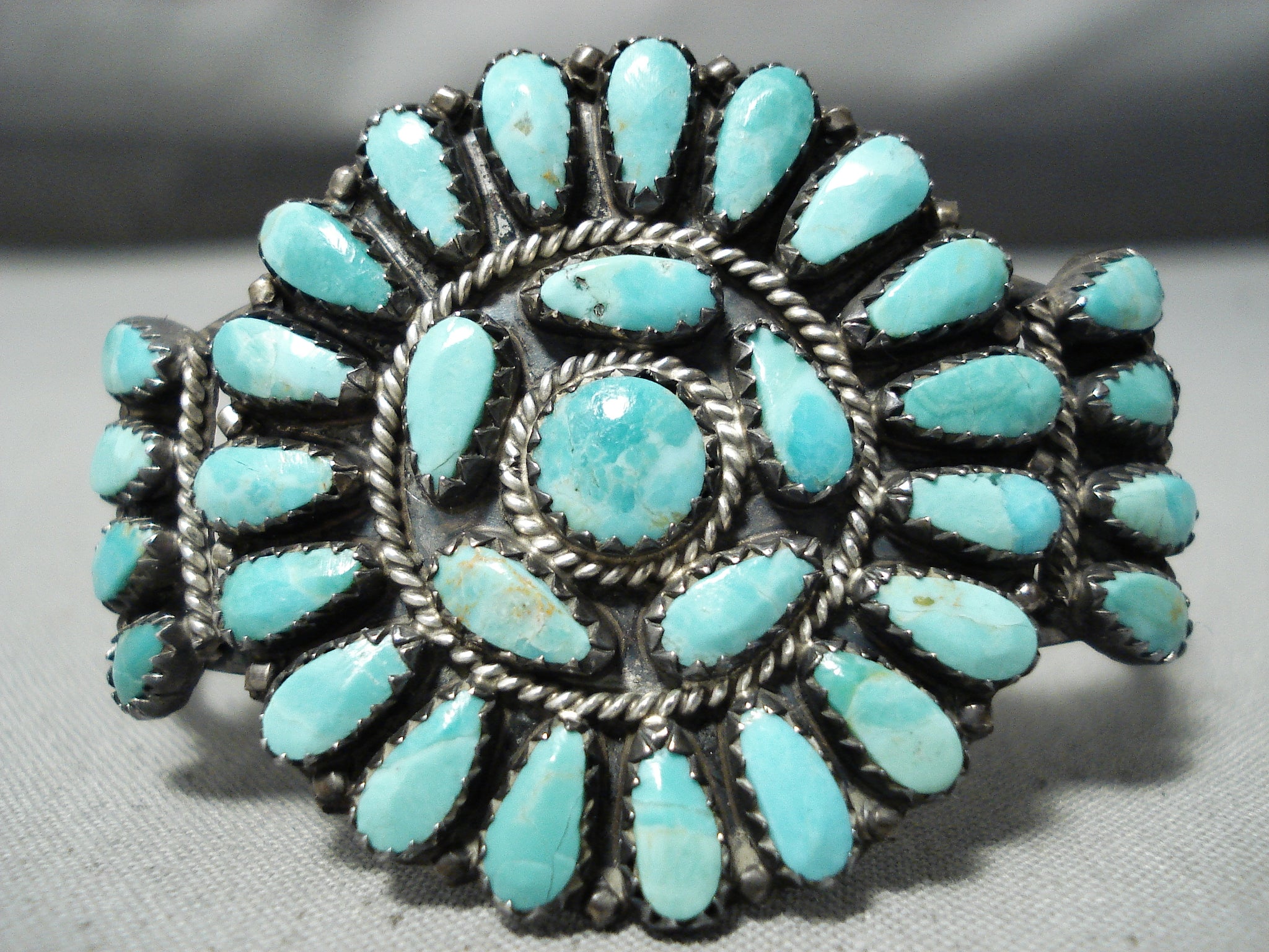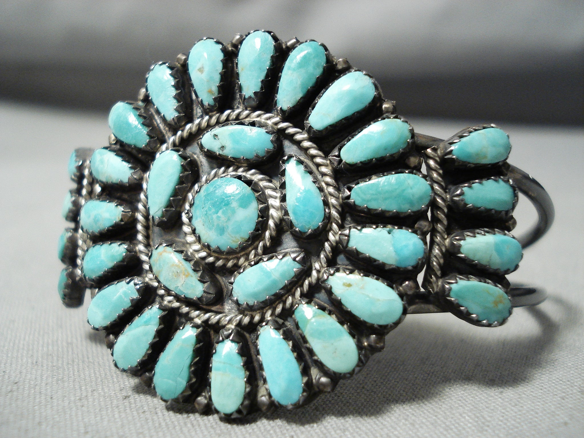 This is an impressive vintage important Navajo turquoise cluster bracelet handmade by the famous artist, Larry Moses Begay. This wonderful piece contains a beautiful cluster of Carico Lake turquoise stones. Surrounding the stones are amazing silver raindrops and ropes. This bracelet includes a superior double silver shank cuff that is rounded for a more comfortable fit. The old natural patina on the bracelet is just magnificent. The center stone measures around 1/4" x 1/4". The width of the bracelet measures around 3/4". Signed by Navajo artist, Larry Moses Begay . Sterling silver, marked. Cir. 1970's+. The inside end to end measures around 5-1/4" with an additional 1" gap. Sturdy 18 grams.