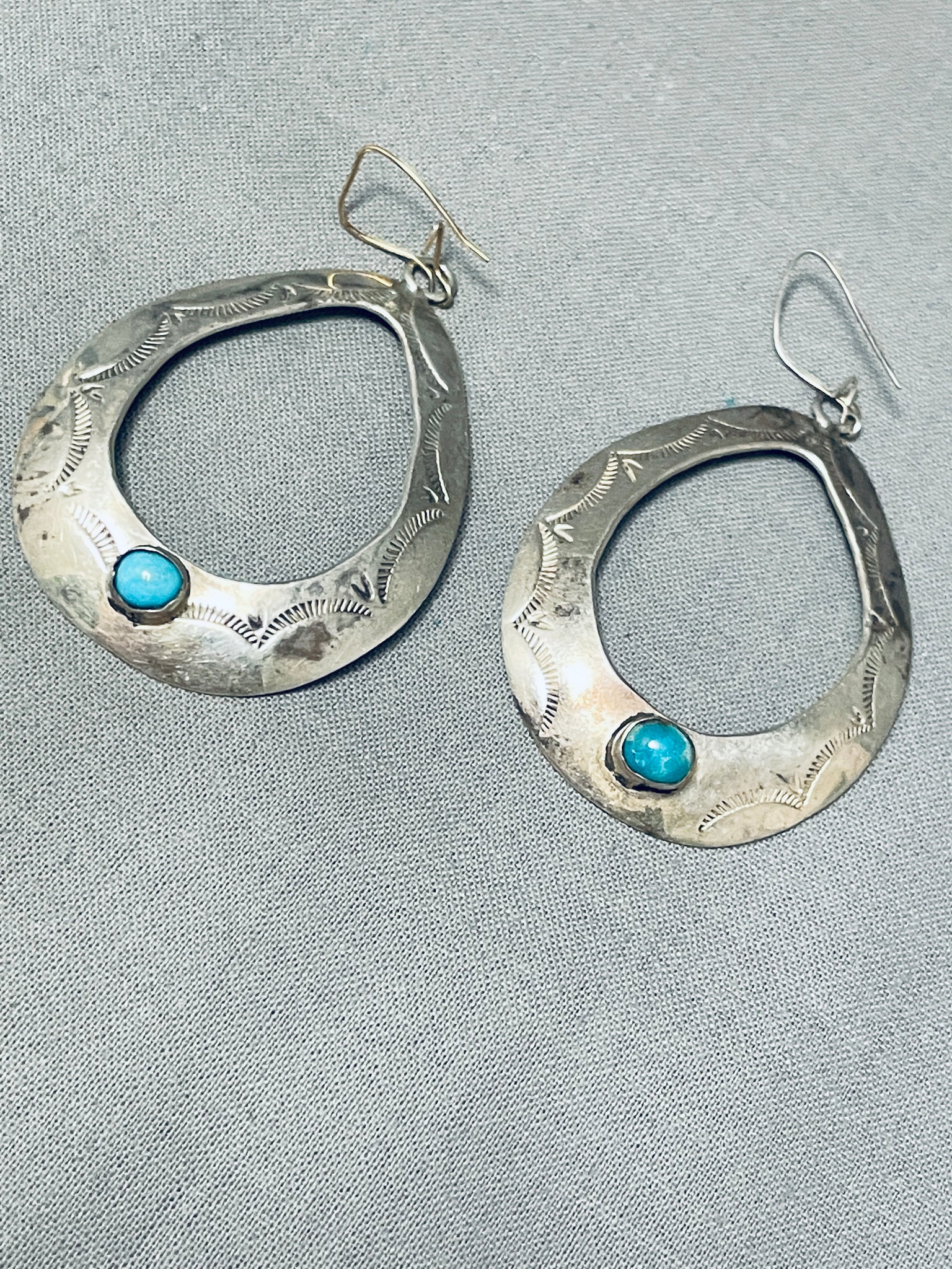 This is a splendid pair of vintage Navajo earrings! They feature hand stamped silver teardrop-shaped hoops with Old Kingman turquoise rounds and silver hooks for pierced ears! Add them to your collection today! Sterling silver. Each earring measures 1-3/4" long and 1-3/8" wide. The earrings weigh around 9 grams.