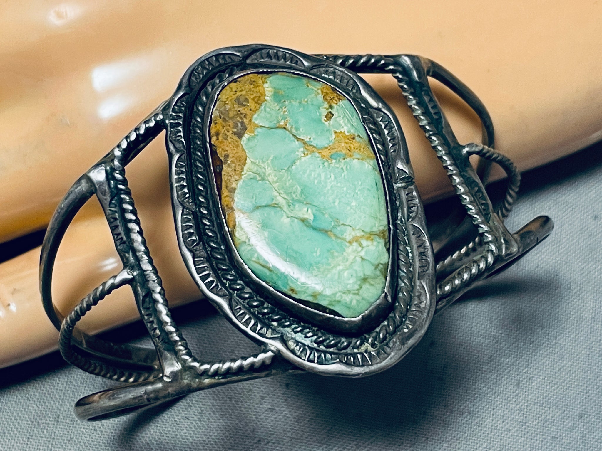 This is an impressive vintage Navajo silver bracelet. Silver rope and handstampings have beautifully accented this expressive Royston turquoise stone set at the very heart of the bracelet! The center stone measures around 1-1/4" x 3/4". The width of the bracelet measures around 1-5/8". Sterling silver. The inside end to end measures around 5-1/4" with an additional 1-1/8" gap. Sturdy 24 grams. Cir Mid Century