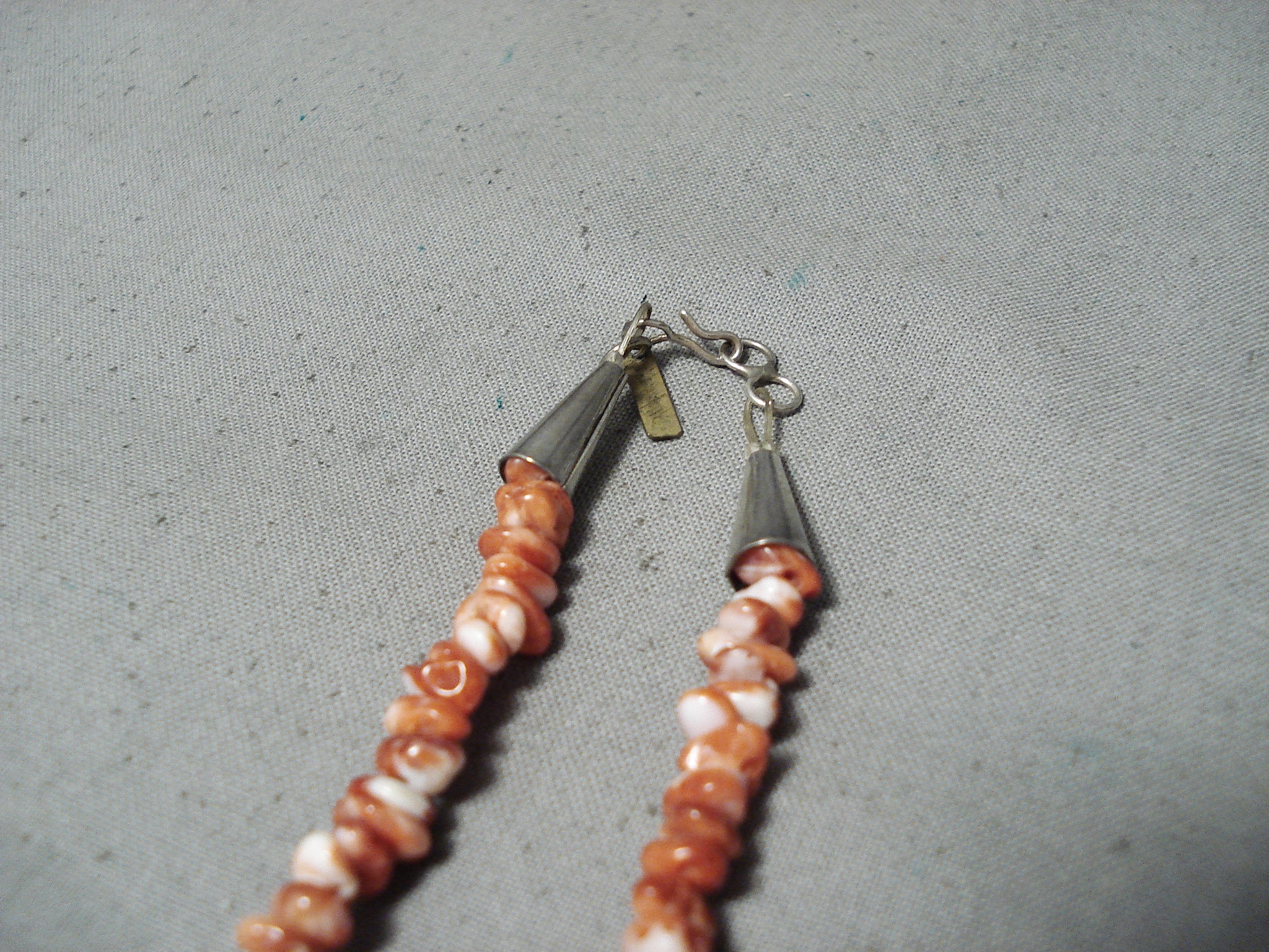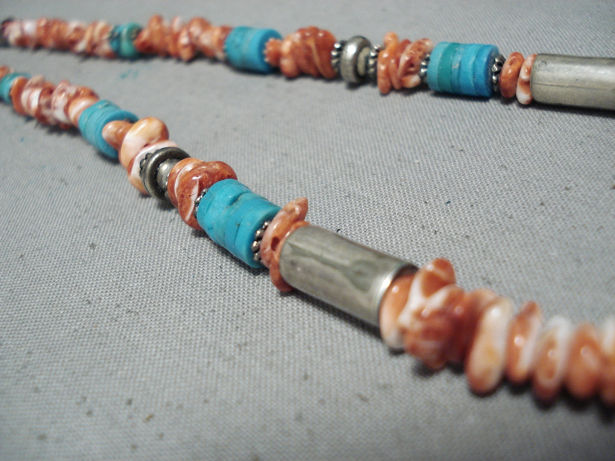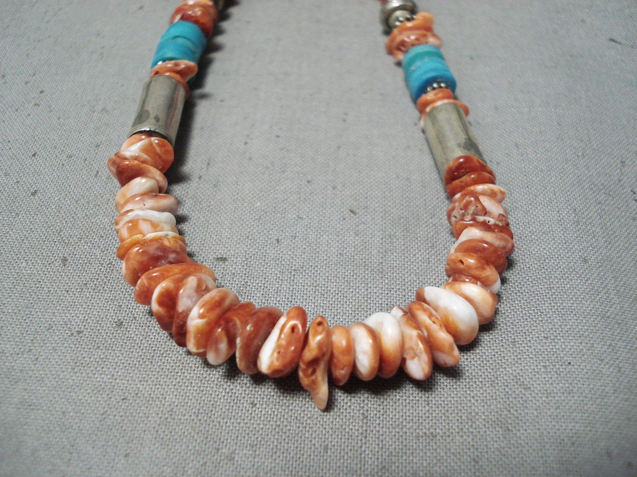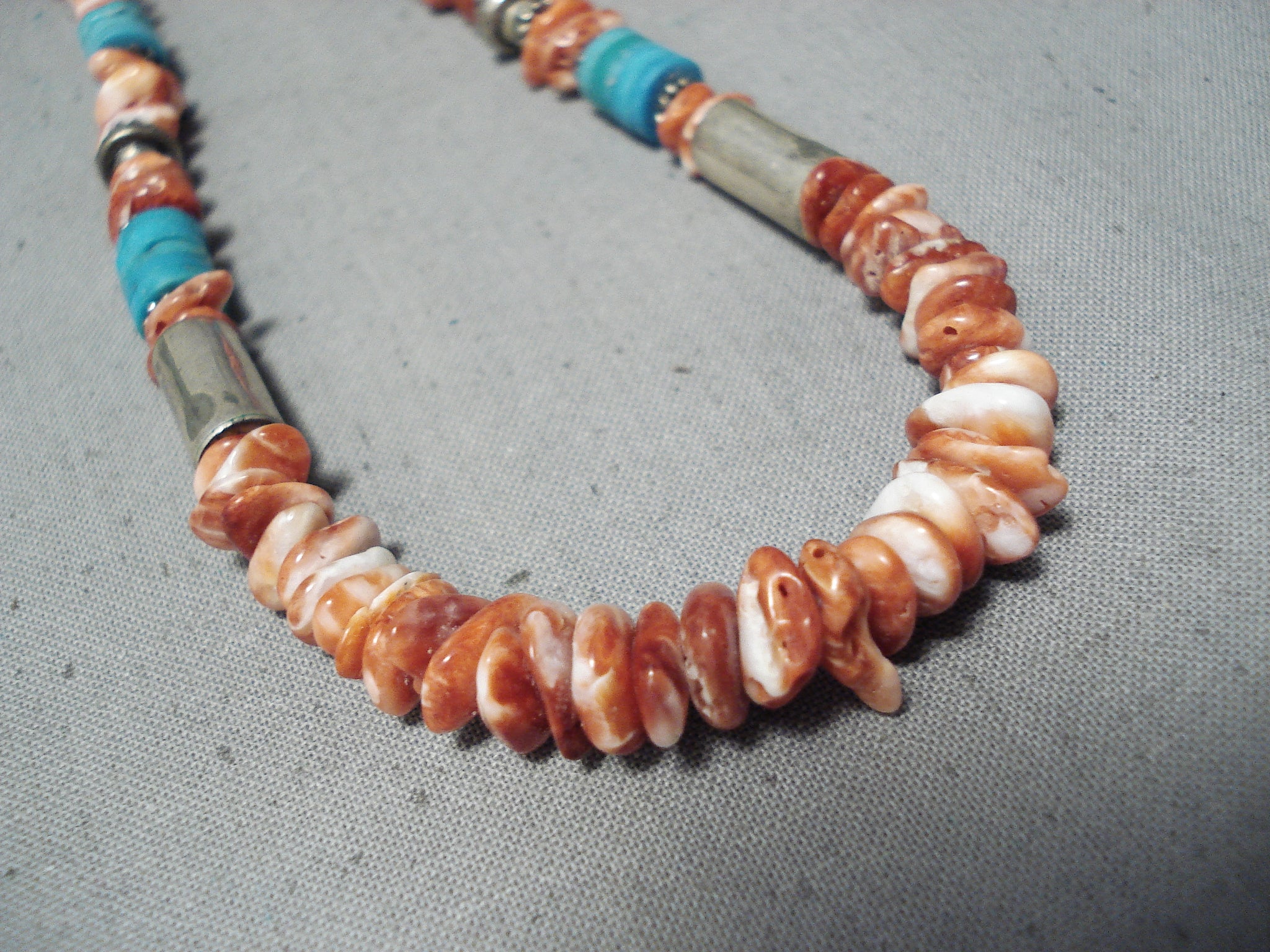 This is an exquisite vintage Navajo turquoise and shell silver necklace handmade by the famous artist, Thomas Singer. This is an authentic Thomas Singer necklace, please be careful of the fakes. This necklace is comprised of superior spiny oyster shells with accenting old Blue Gem turquoise heishi and silver beads. Resting at the ends are incredible silver ocnes with a traditional silver clasp. What makes this necklace even more unique is the fact that it is signed. Sterling silver. Cir. 1970's+. Signed by Navajo artist, Thomas Singer. The length of the necklace measures around 15". Sturdy 23 grams.