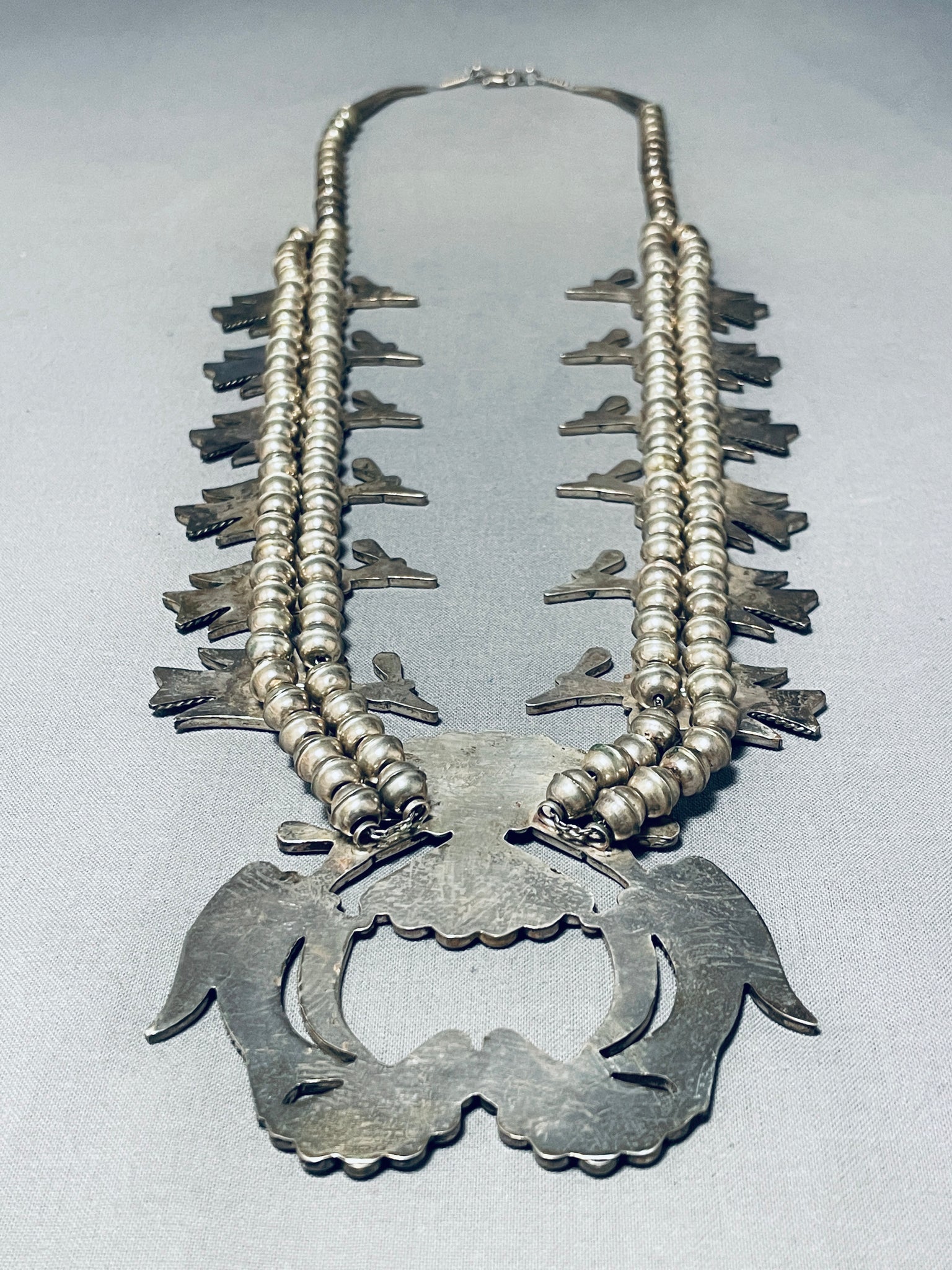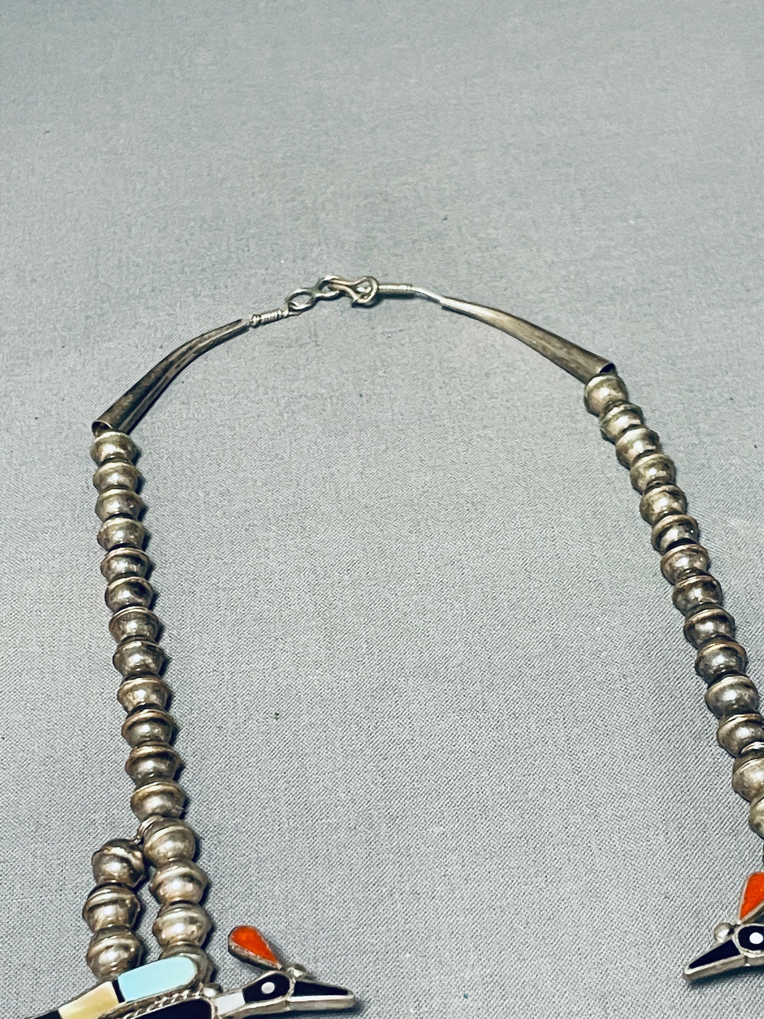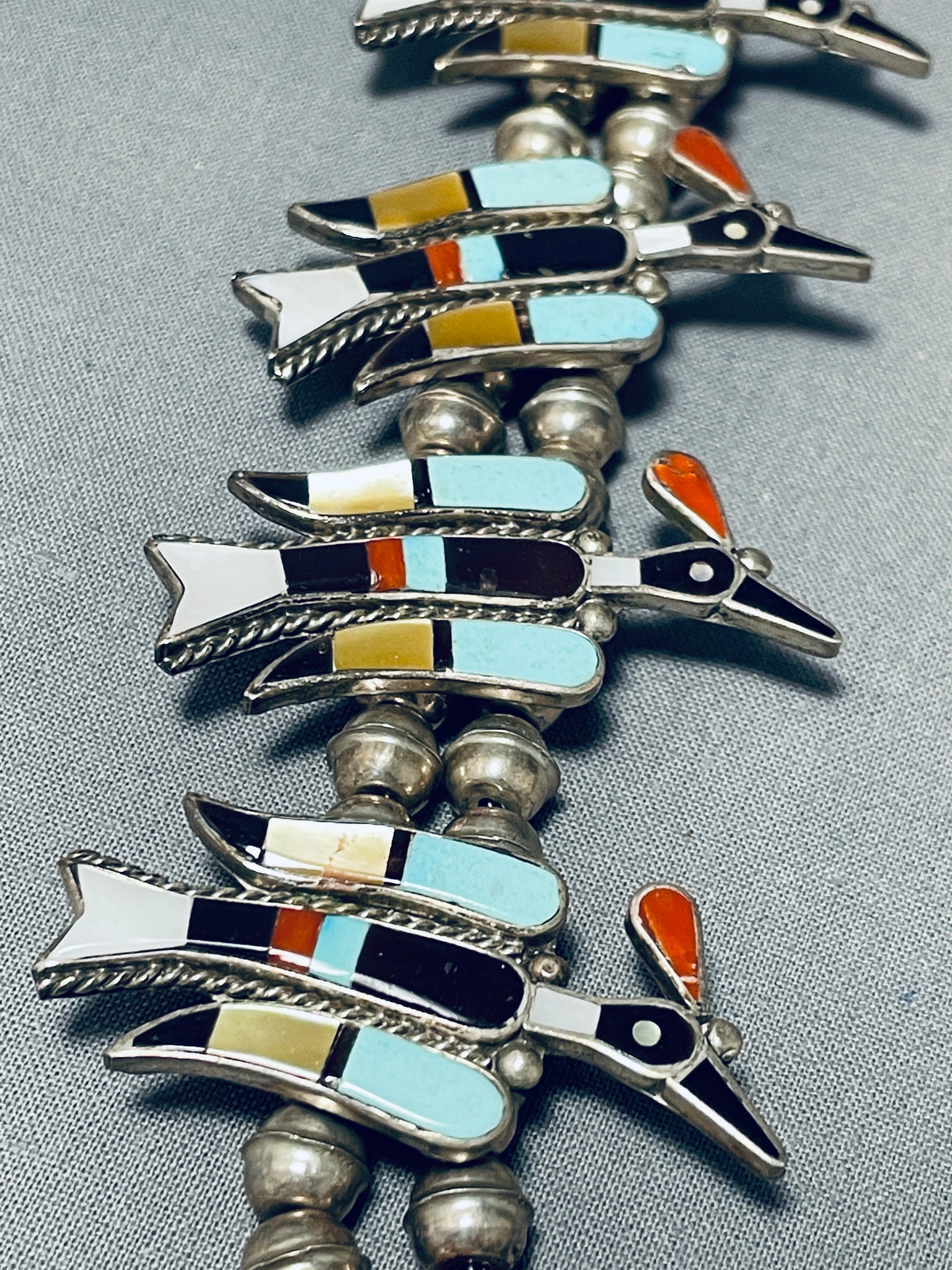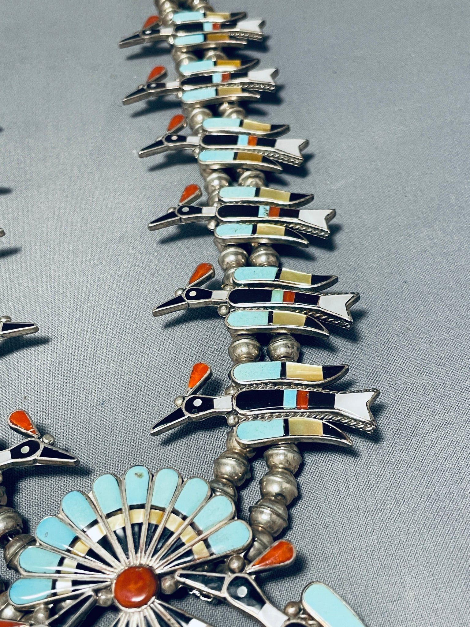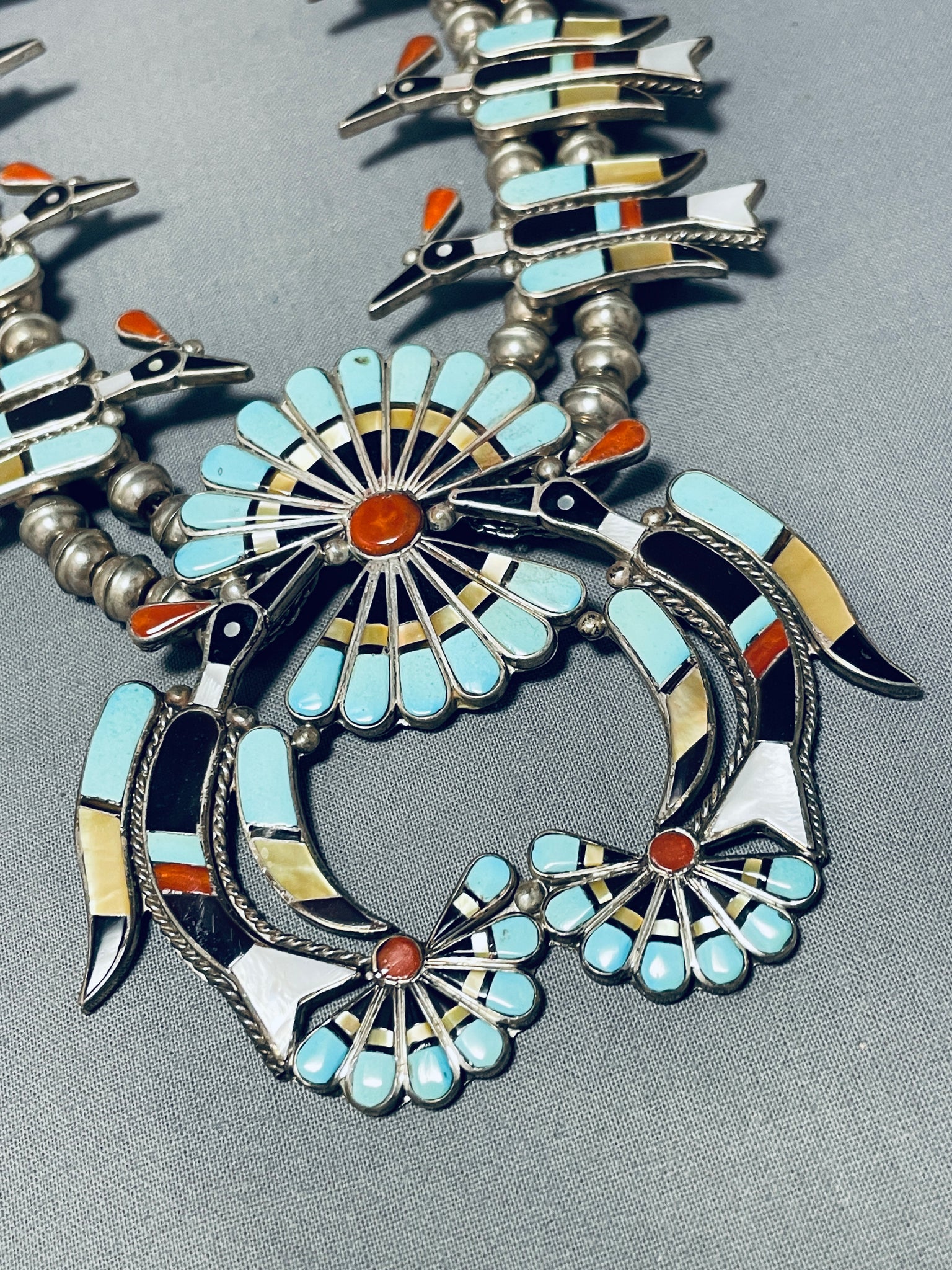 Authentic Vintage Native American Zuni Turquoise Sterling Silver Inlay Squash Blossom Necklace