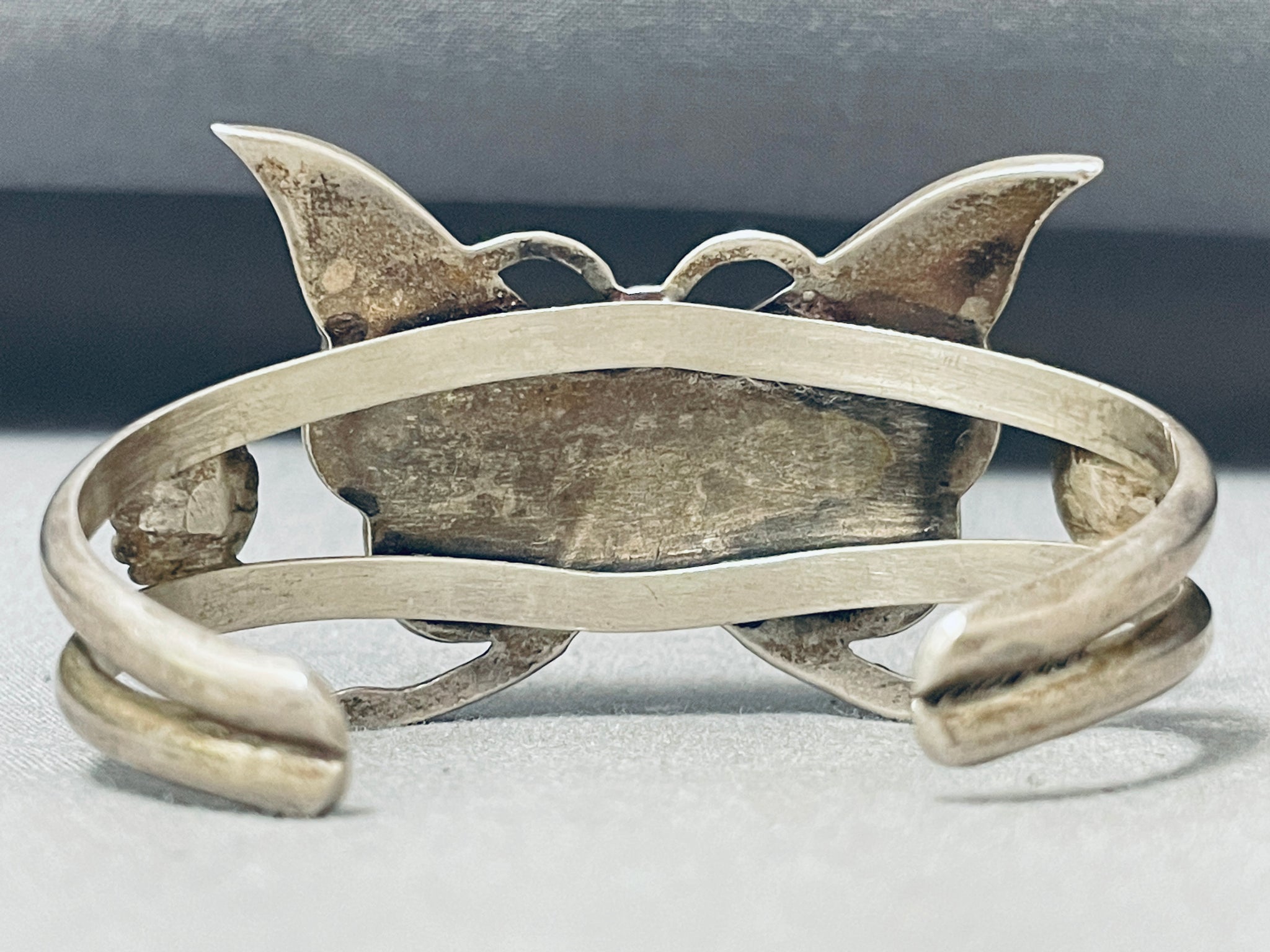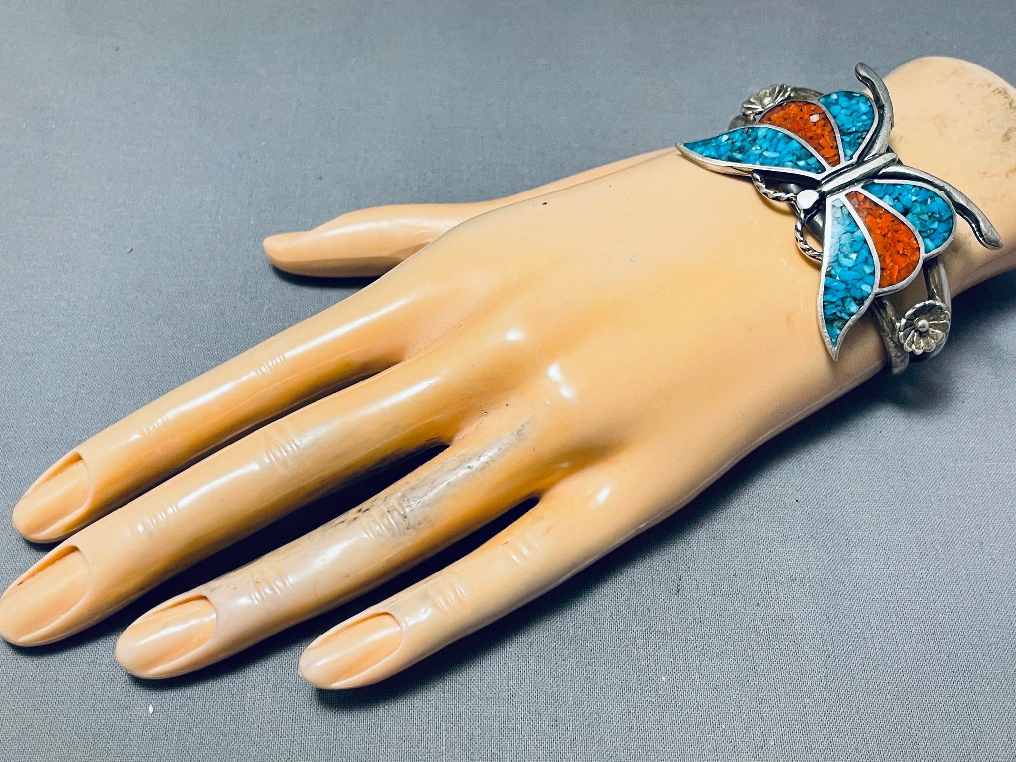Awesome Native American Navajo Turquoise Coral Chip Inlay Sterling Silver Butterfuly Bracelet