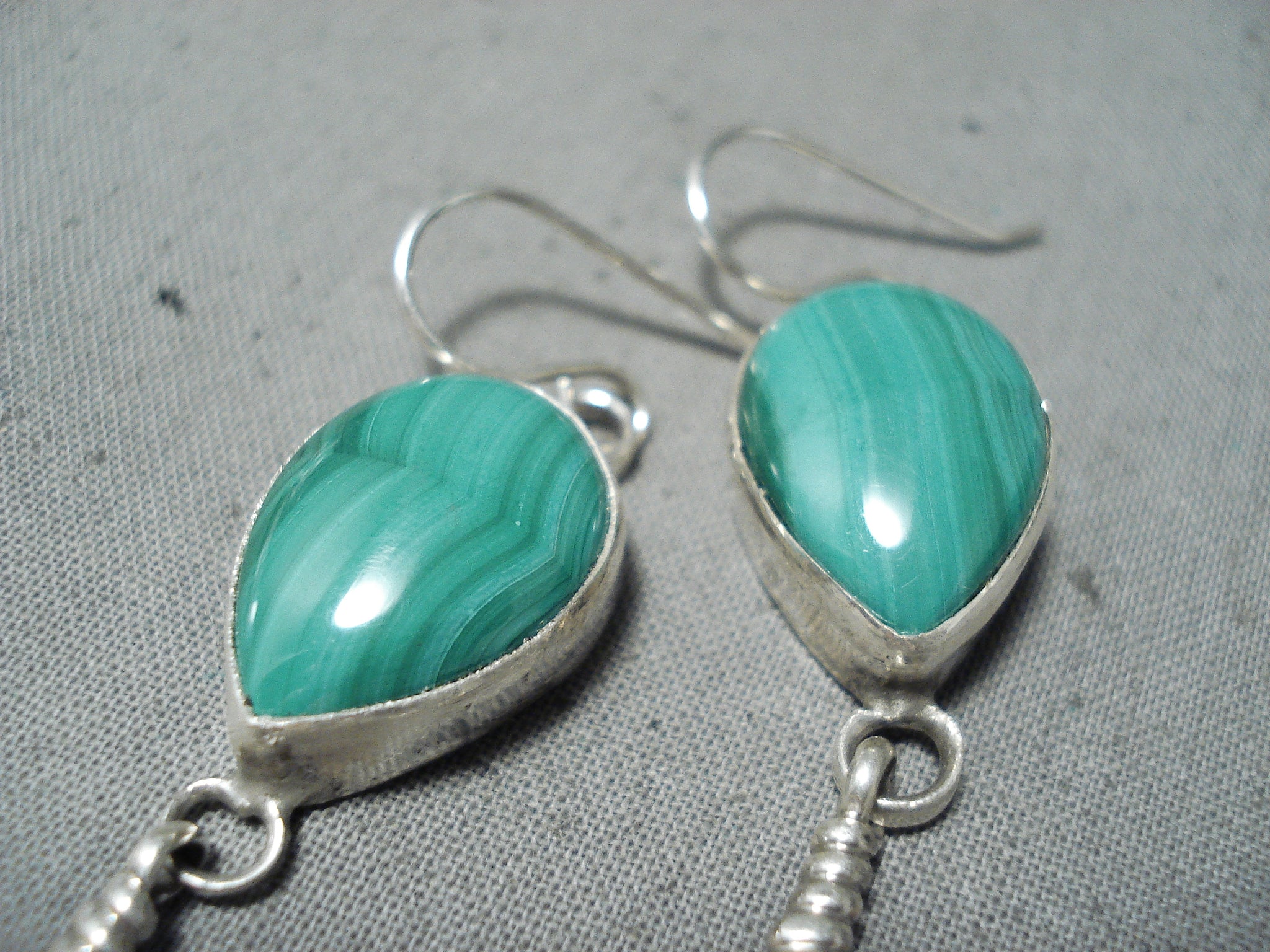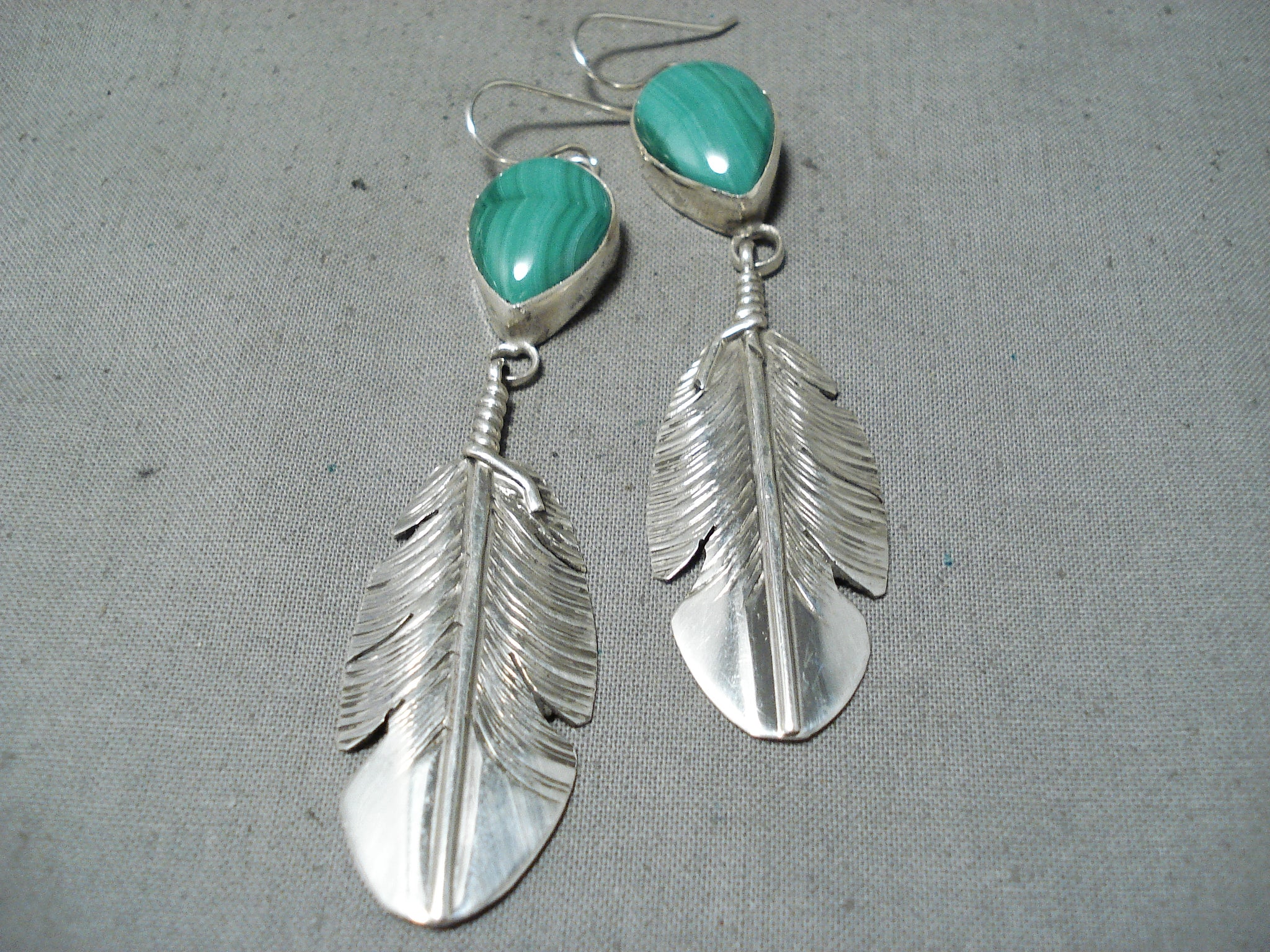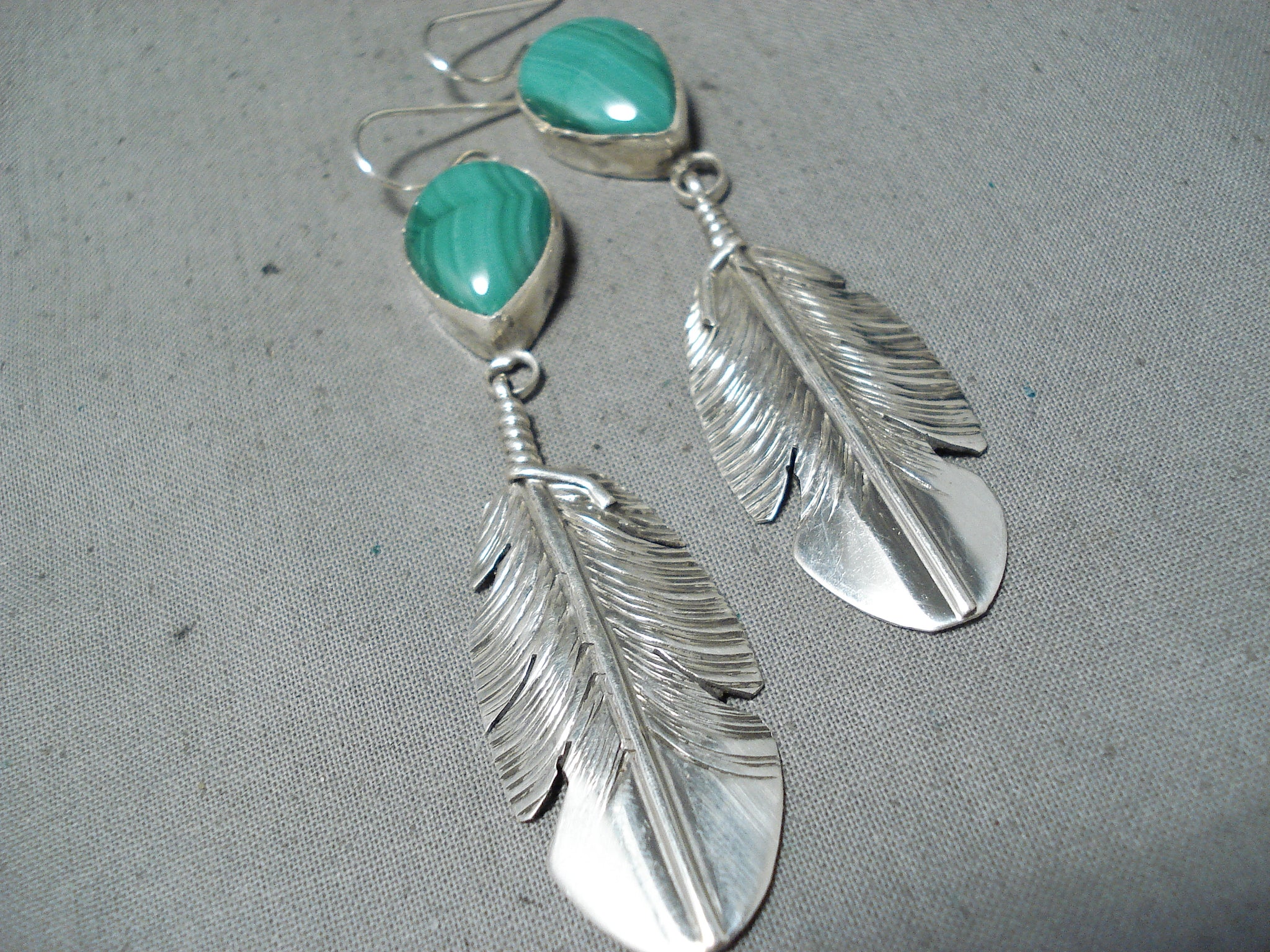 Awesome Navajo Native American Malachite Sterling Silver Feather Earrings