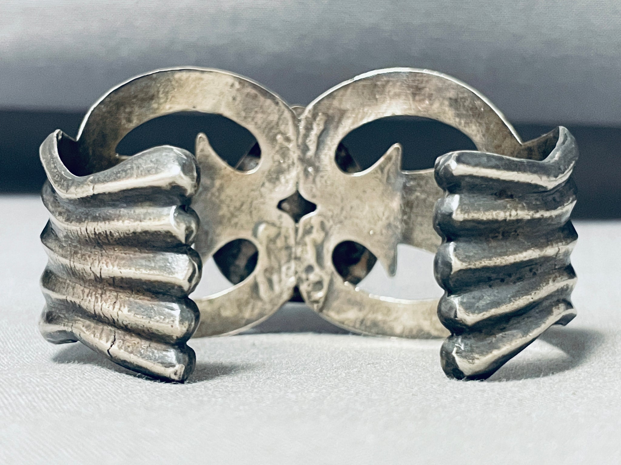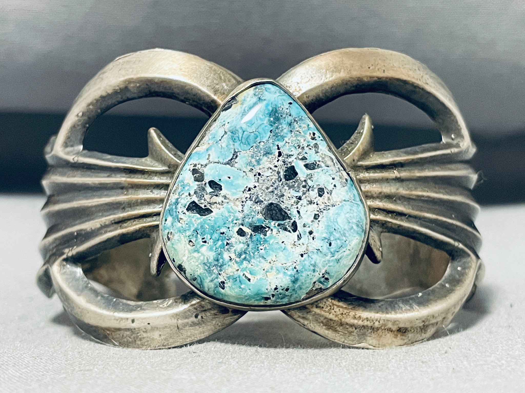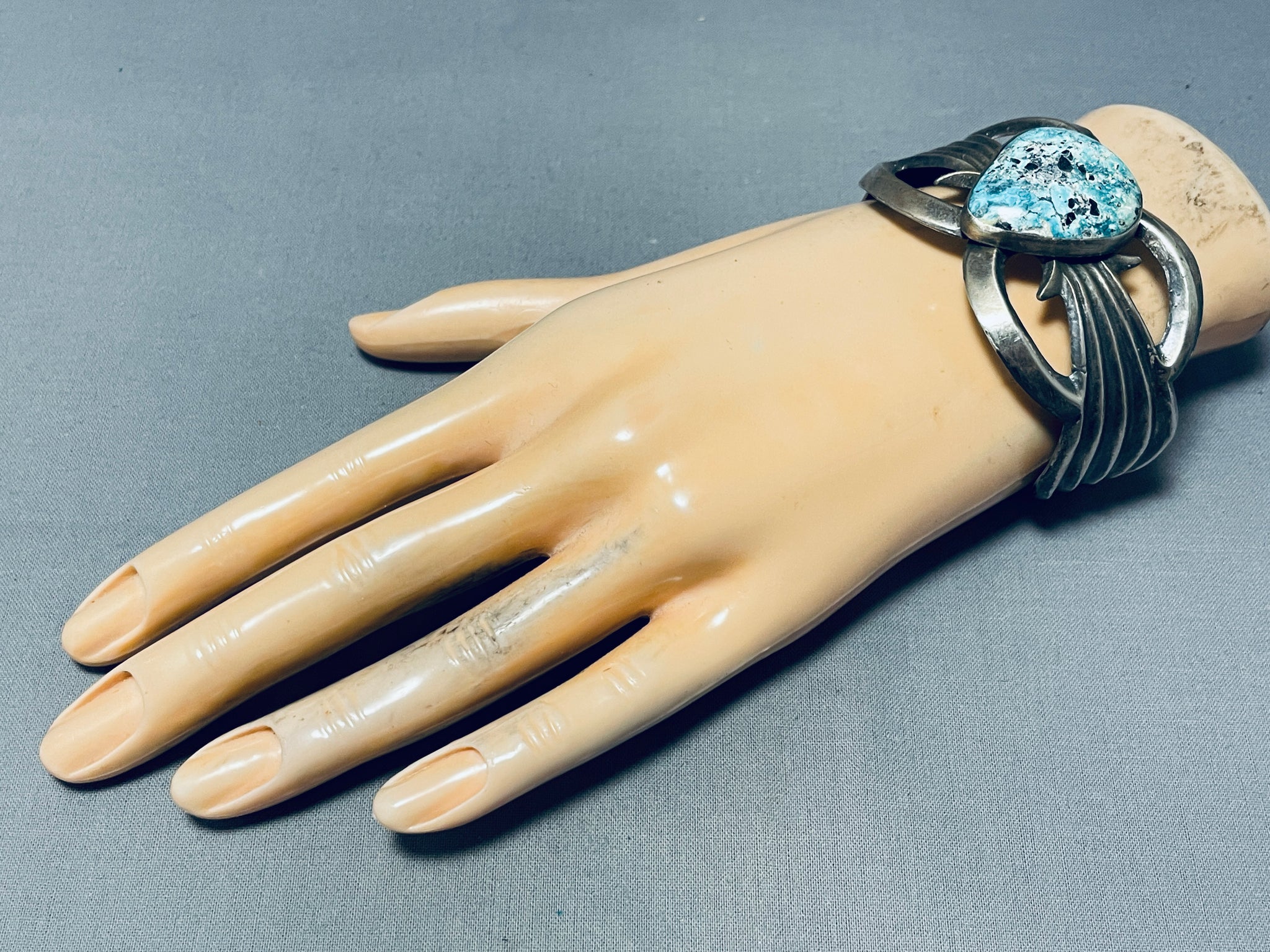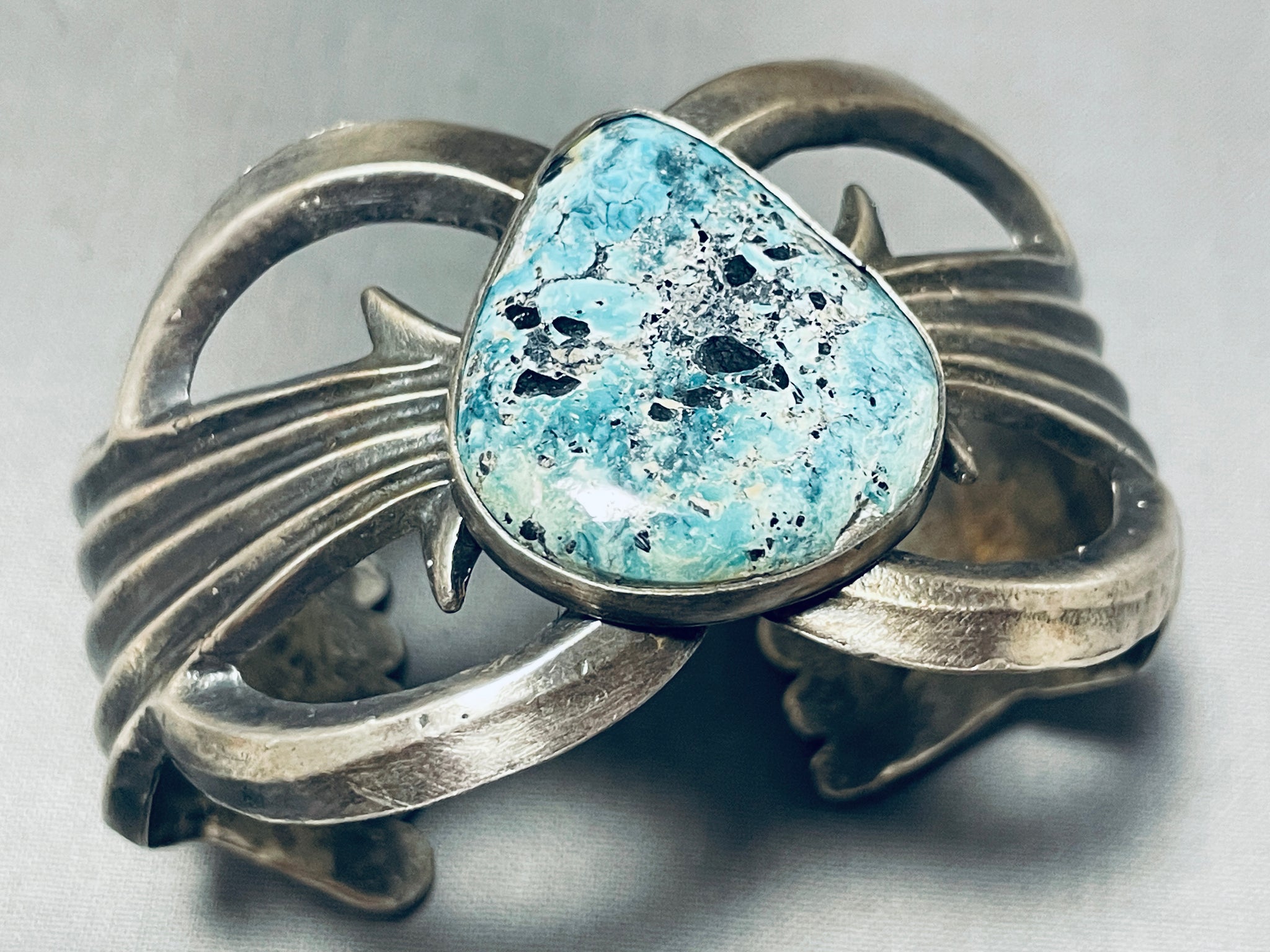 Up for sale is this magnificent vintage Navajo silver bracelet having a handcarved silver butterfly shape with a large Blue Diamond turquoise teardrop center and handcarved silver fan flanks that form a solid silver cuff! Truly Exceptional Piece!