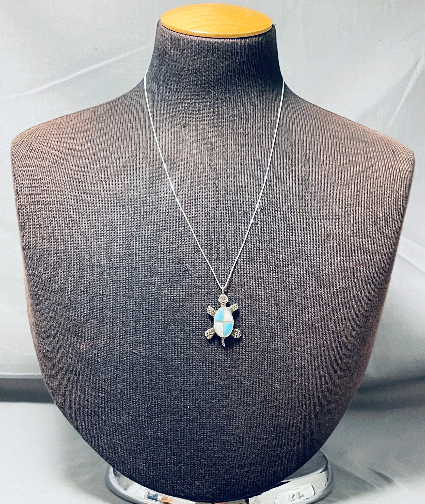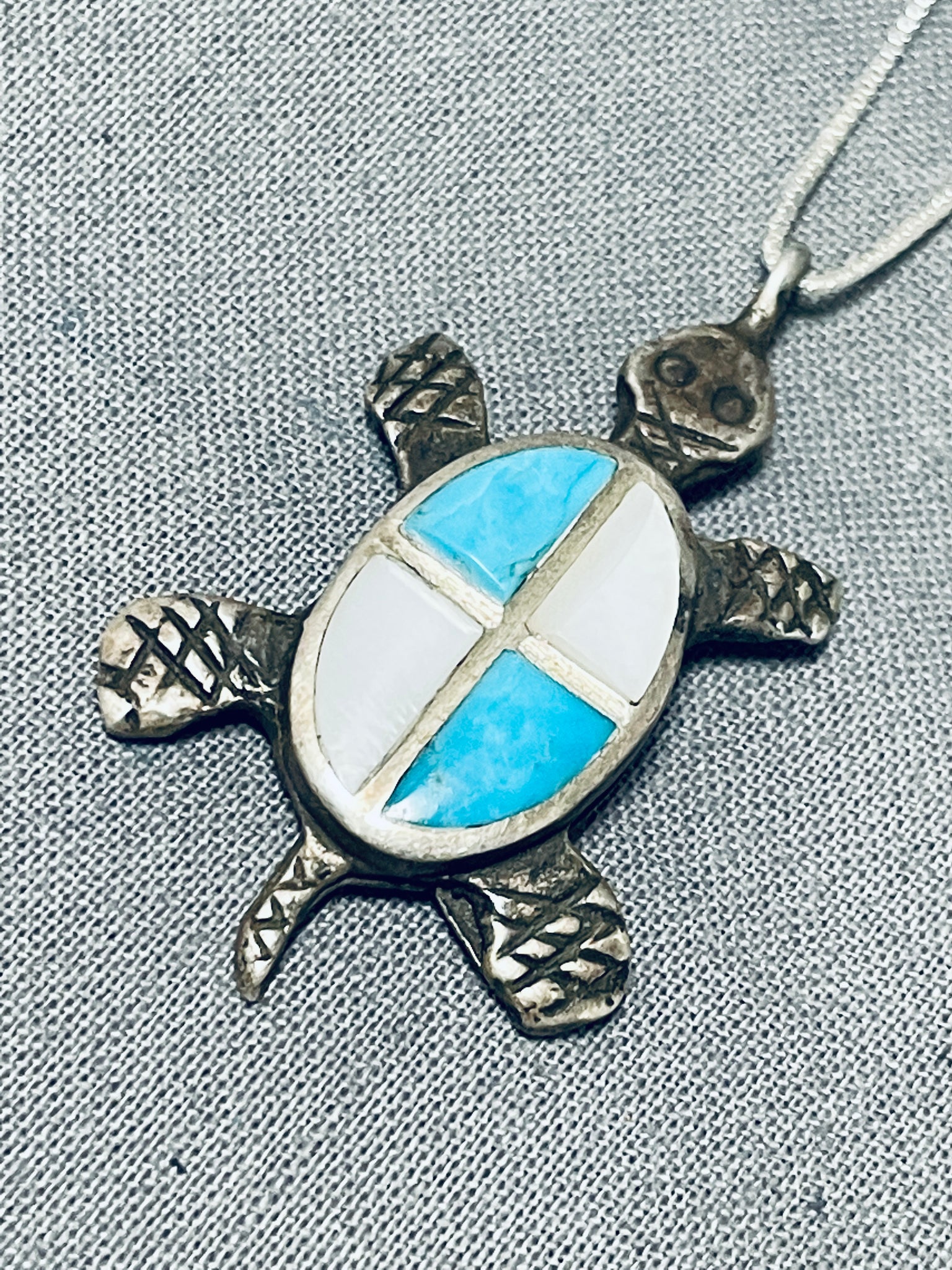 Awesome Vintage Native American Zuni Blue Gem Turquoise Mother Of Pearl Inlay Turtle Necklace
