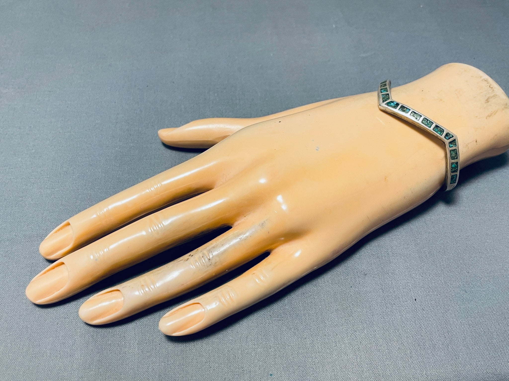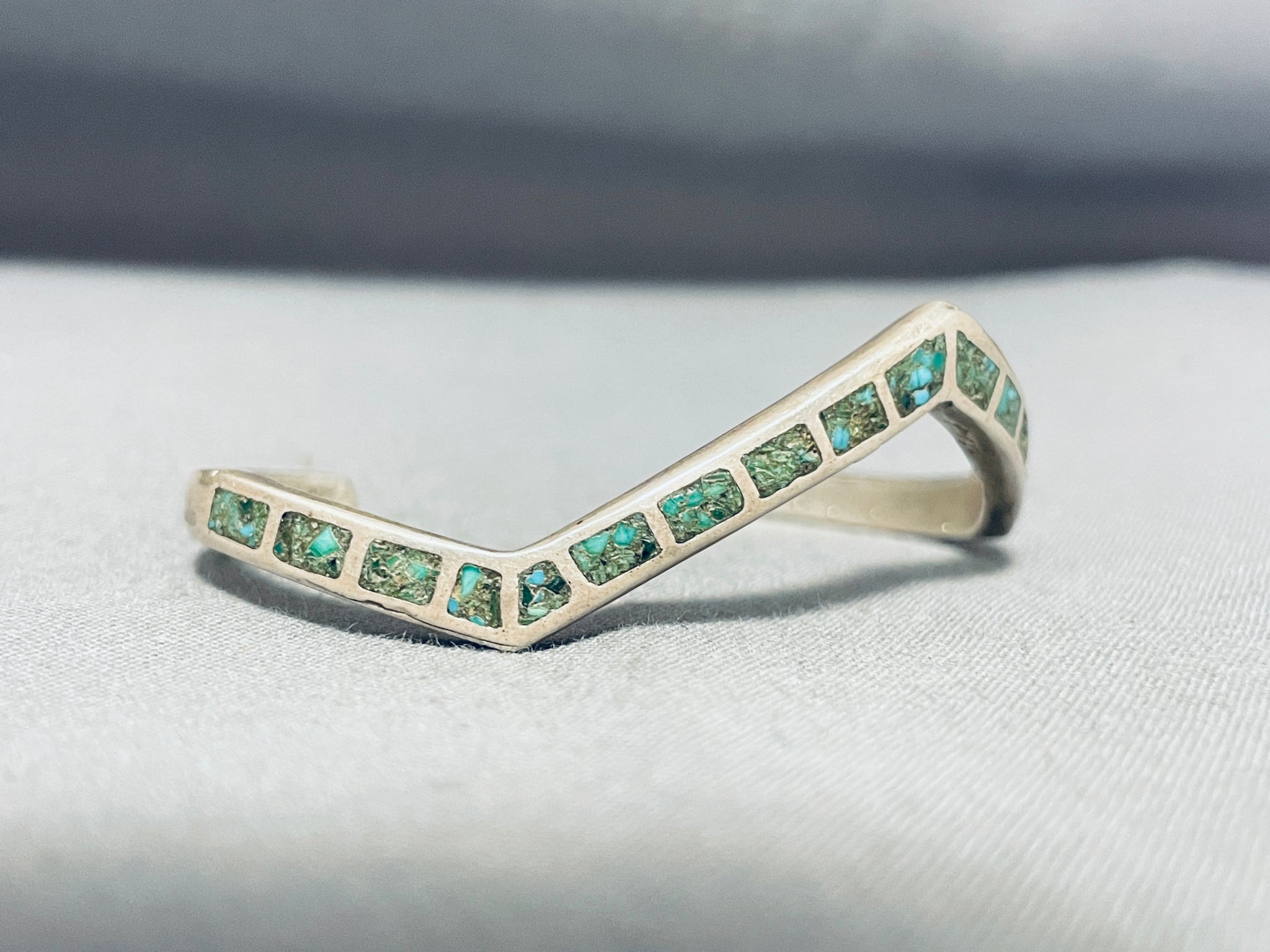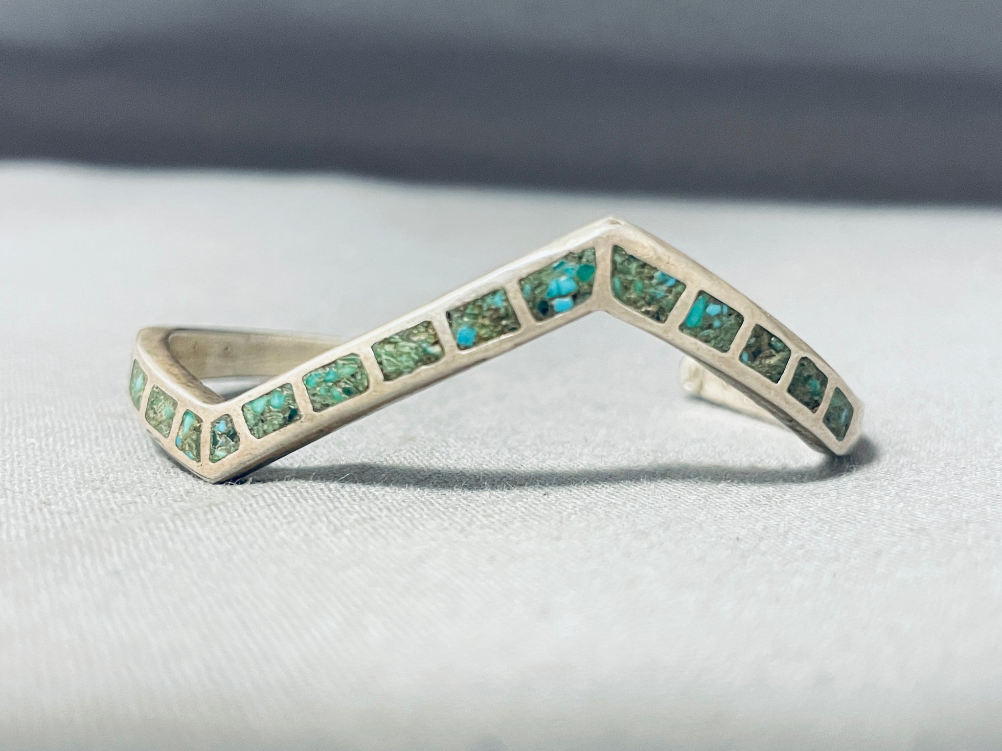 Awesome Vintage Native American Zuni Inlay Turquoise Sterling Silver Angled Bracelet