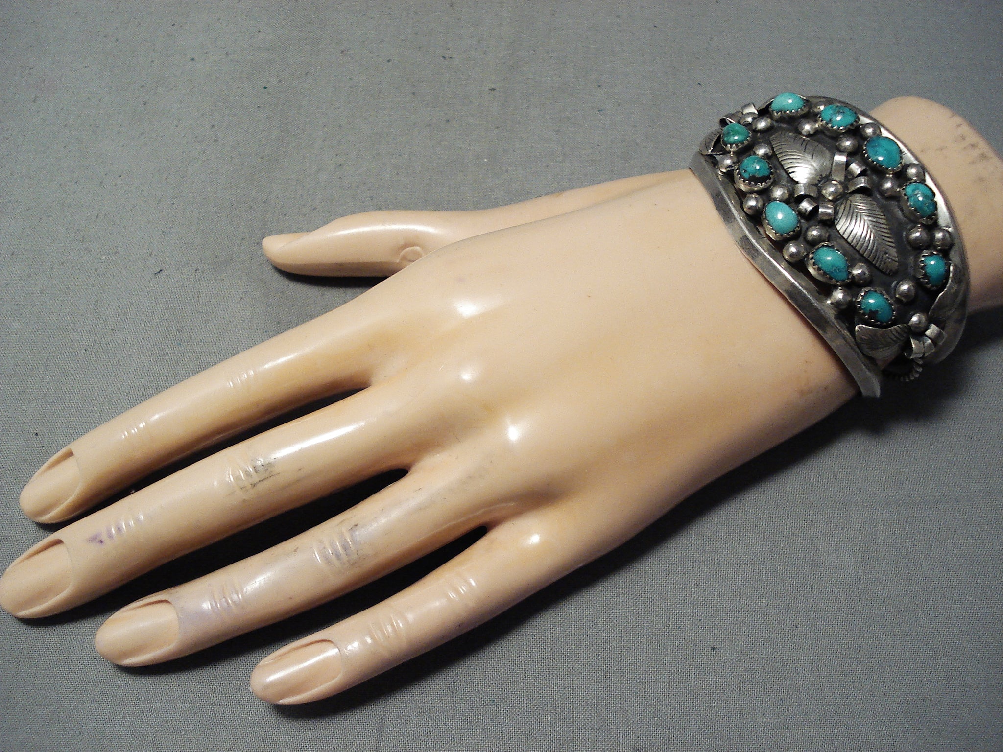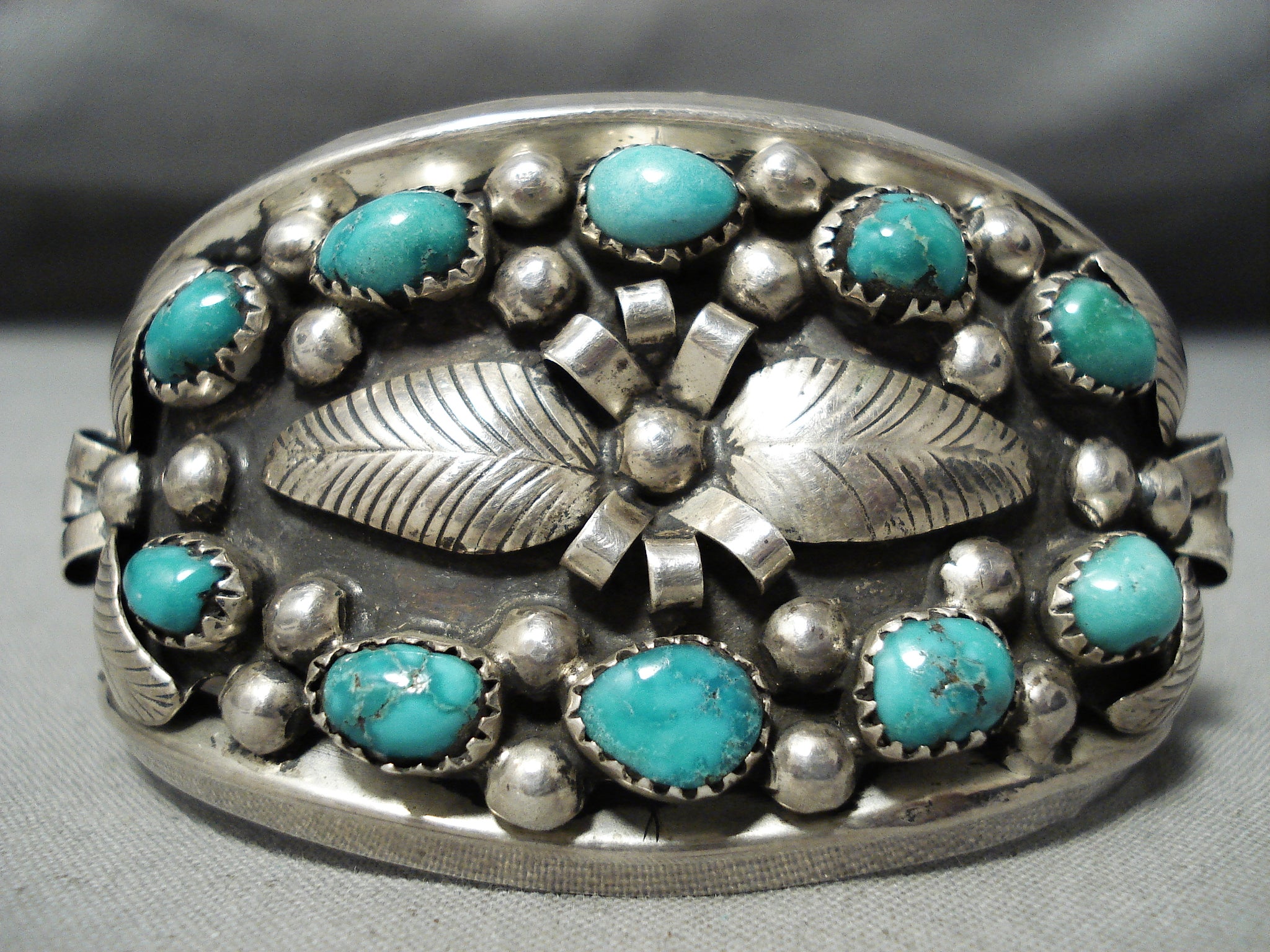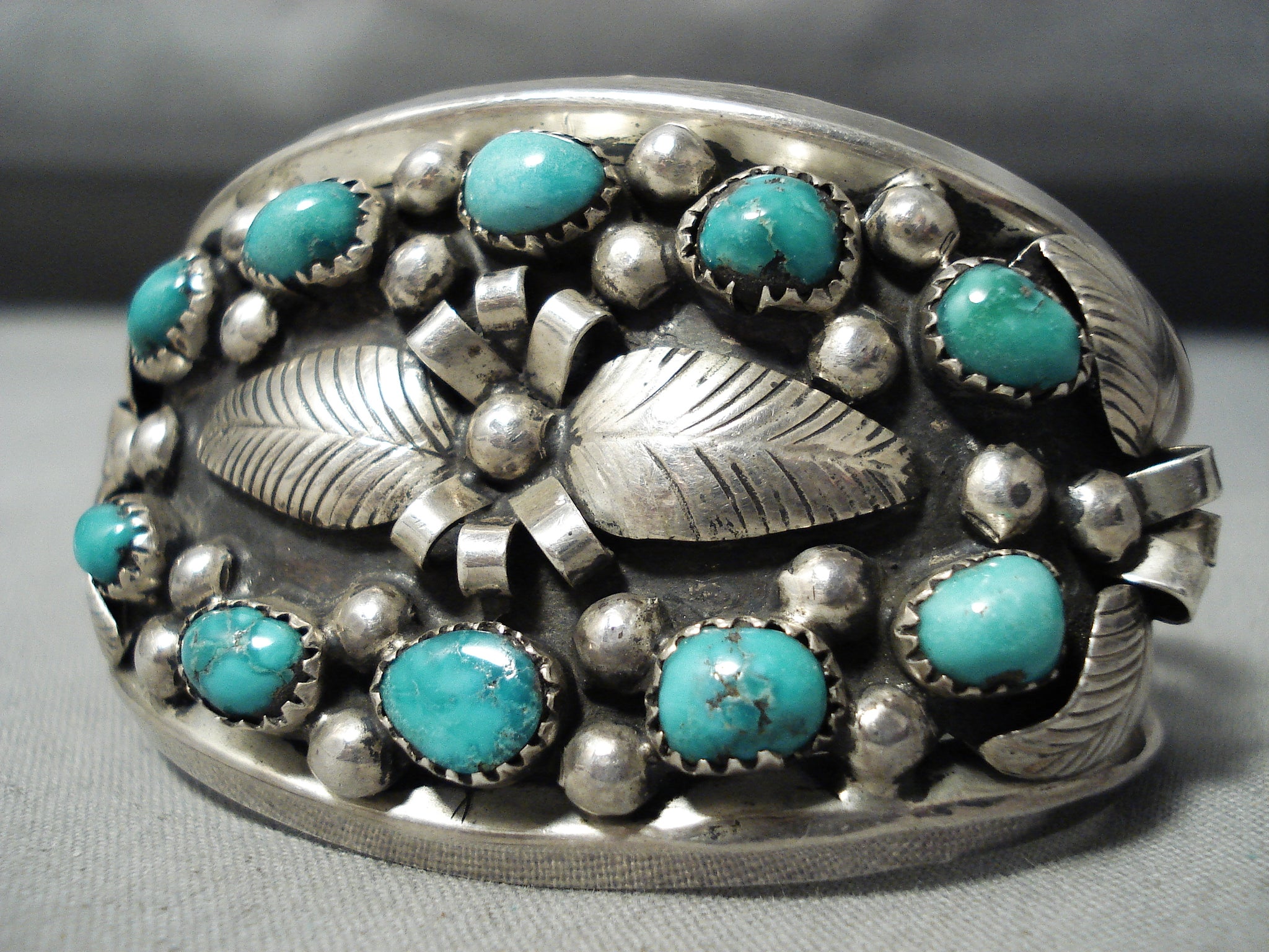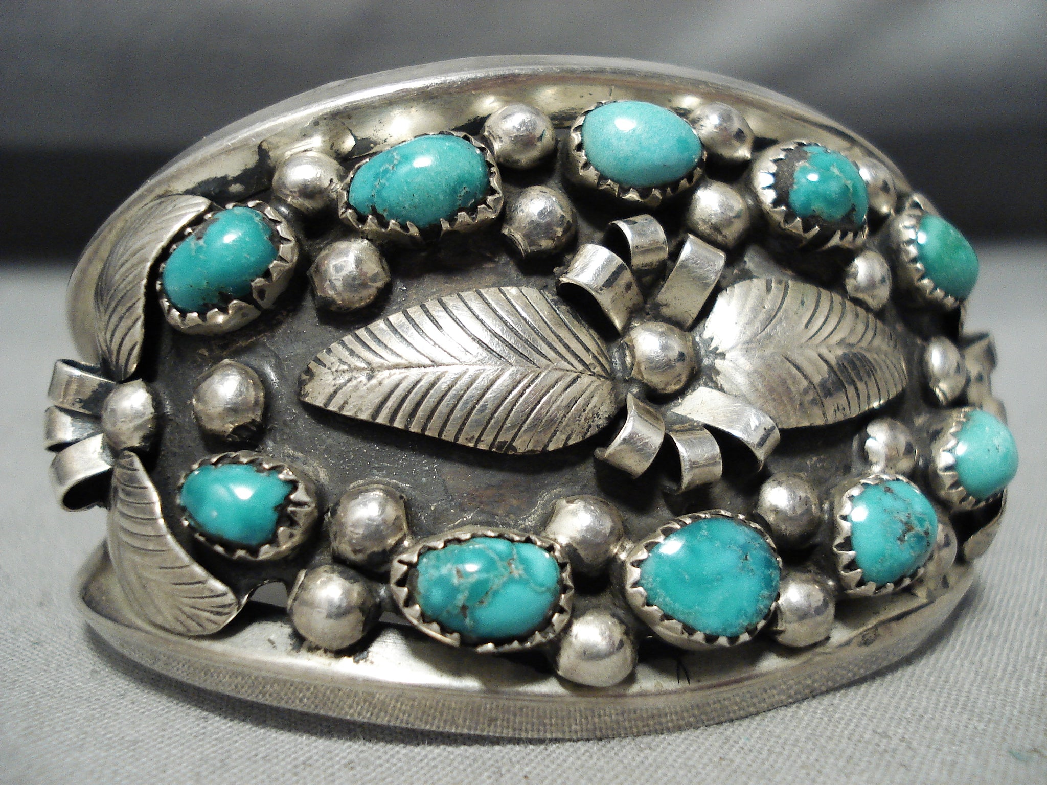 This is a stunning vintage Navajo multiple stone silver leaf bracelet. This remarakble piece contains 10 stunning old Carico Lake turquoise stones that are all surrounded by wonderful hand carved silver leaves. Accenting the leaves and stones are amazing silver bridges and raindrops. This bracelet consists of a sturdy triple silver shank cuff with the center shank being coiled. The stones measure around 1/4" x 3/16". The width of the bracelet measures around 1-5/8". Signed by Navajo artist, Darlene Thomas. Sterling silver. Cir. 1960's+ . The inside end to end measures around 5-1/4" with an additional 1-1/4" gap. Sturdy 47 grams.