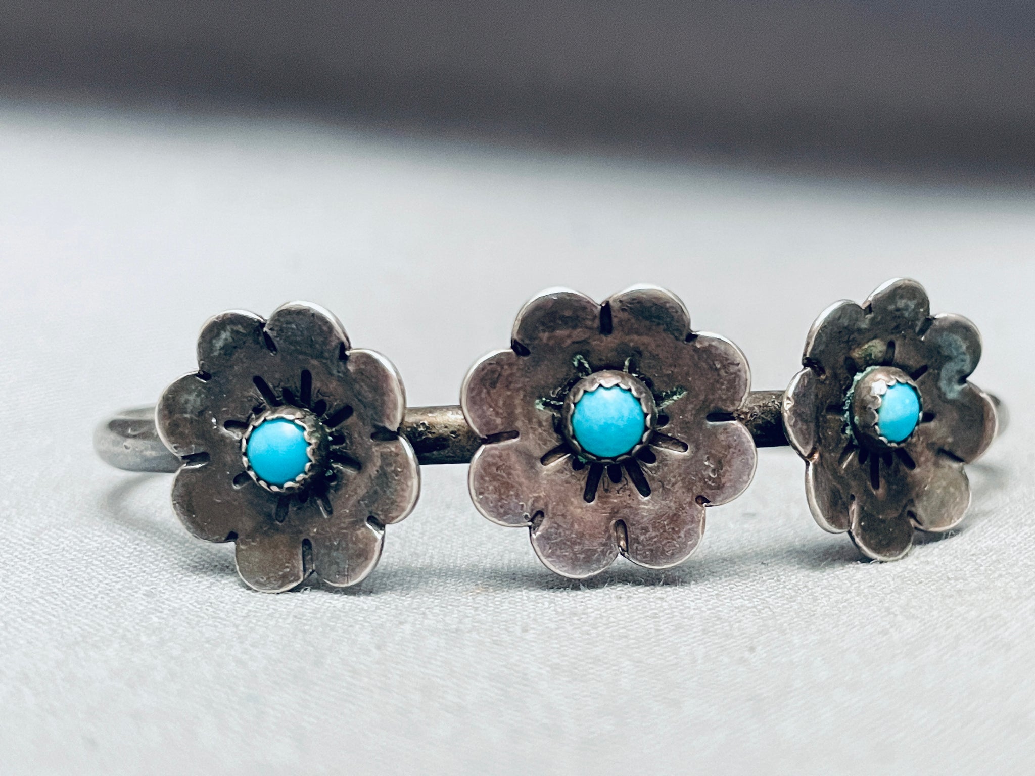 Beautiful Flowers Vintage Native American Navajo Turquoise Sterling Silver Bracelet