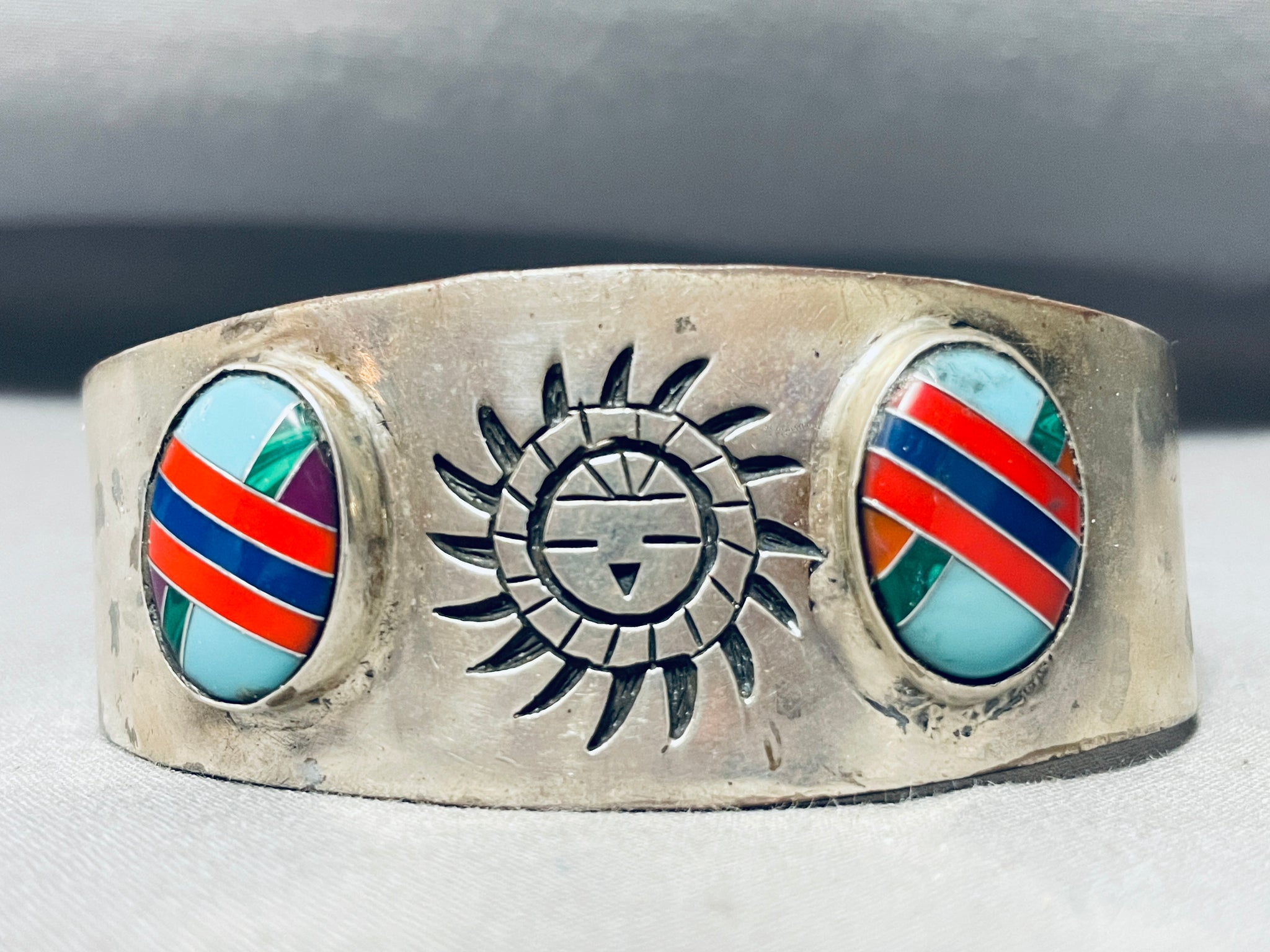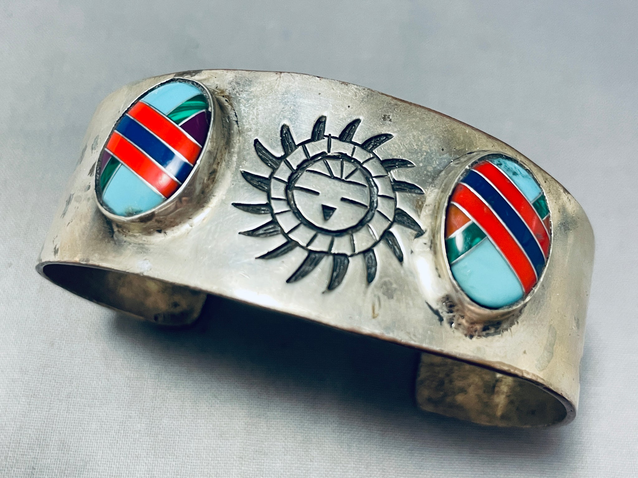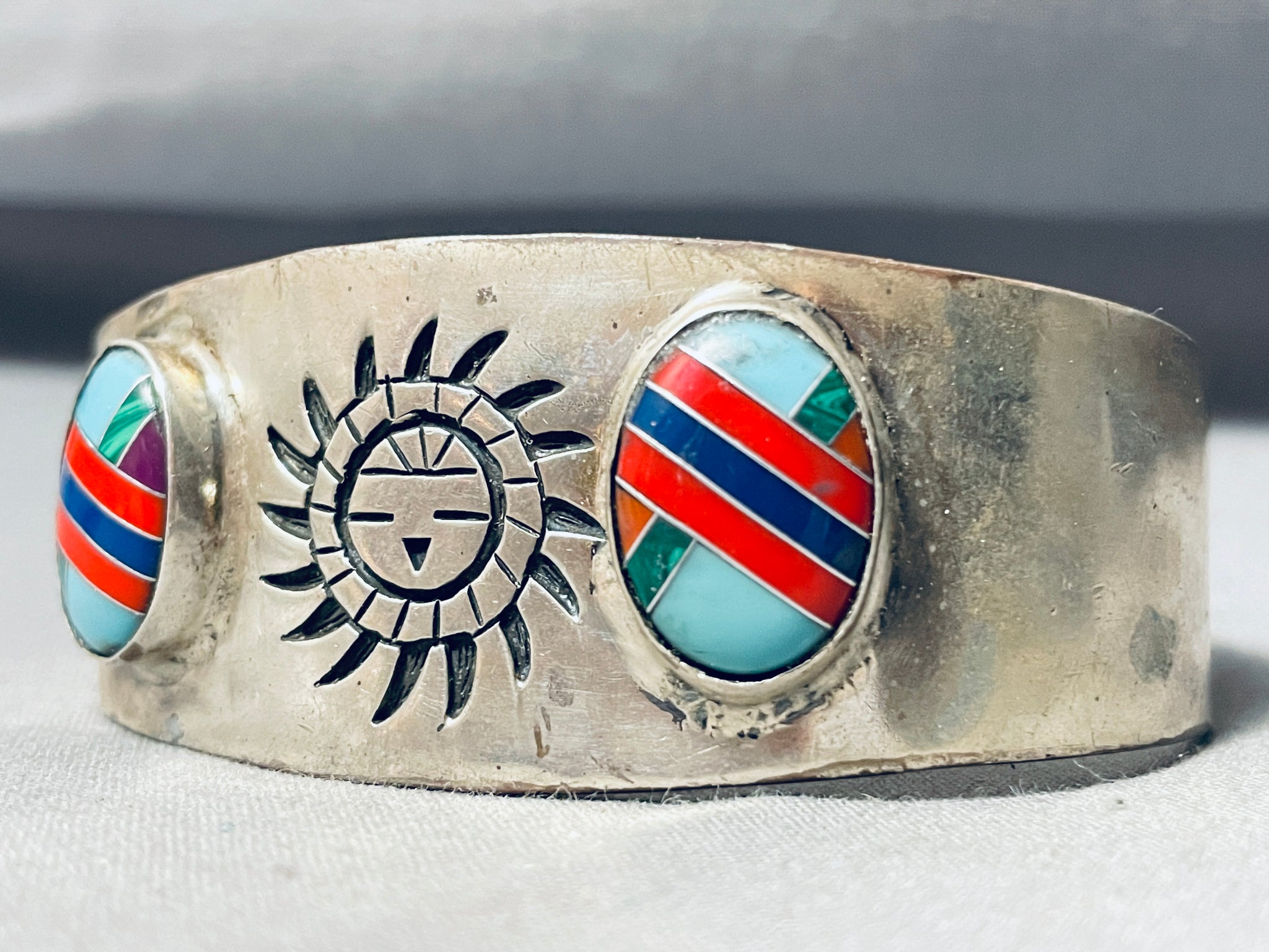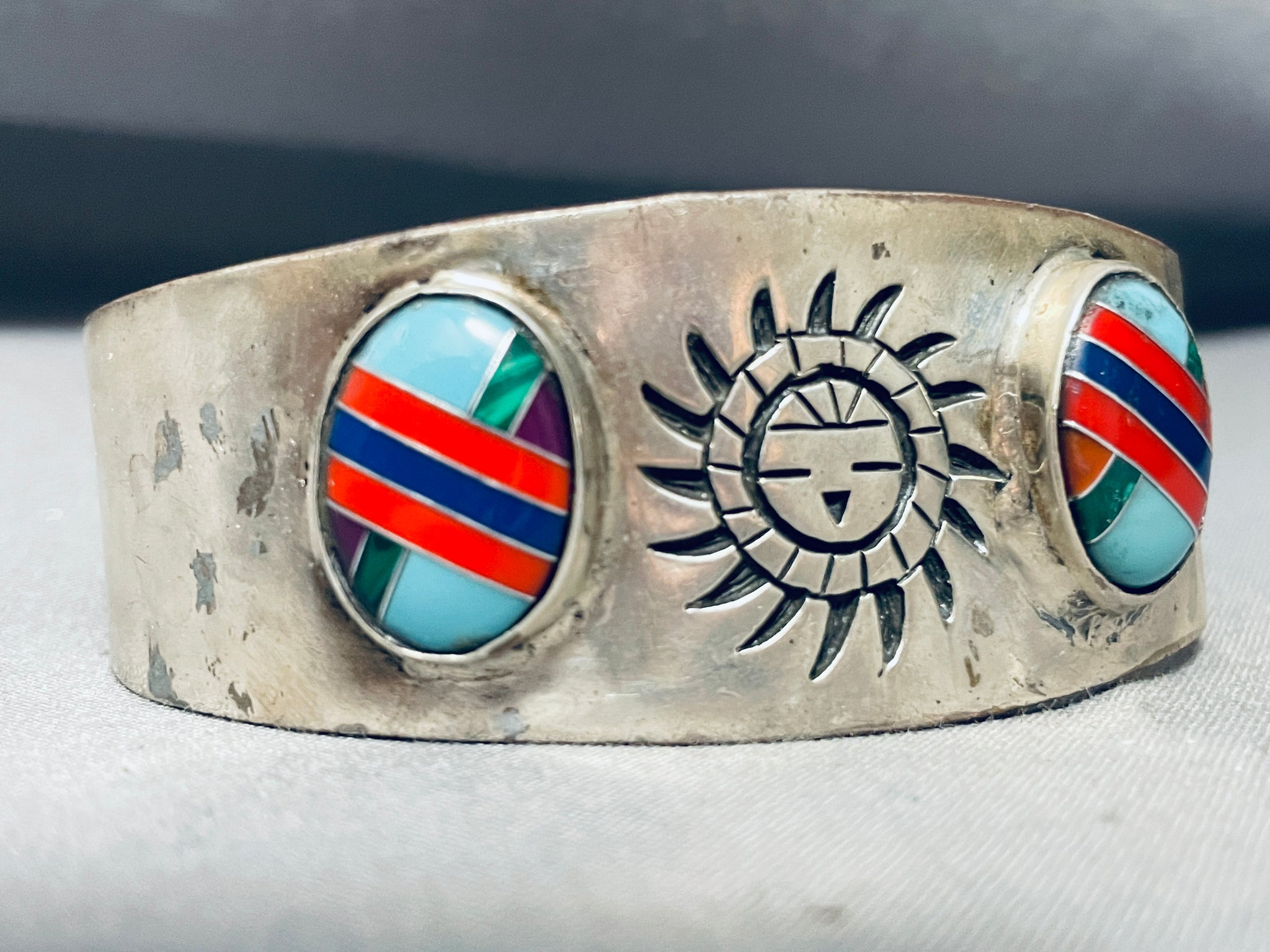 Beautiful Intricate Vintage Southwestern Sterling Silver Inlay Bracelet