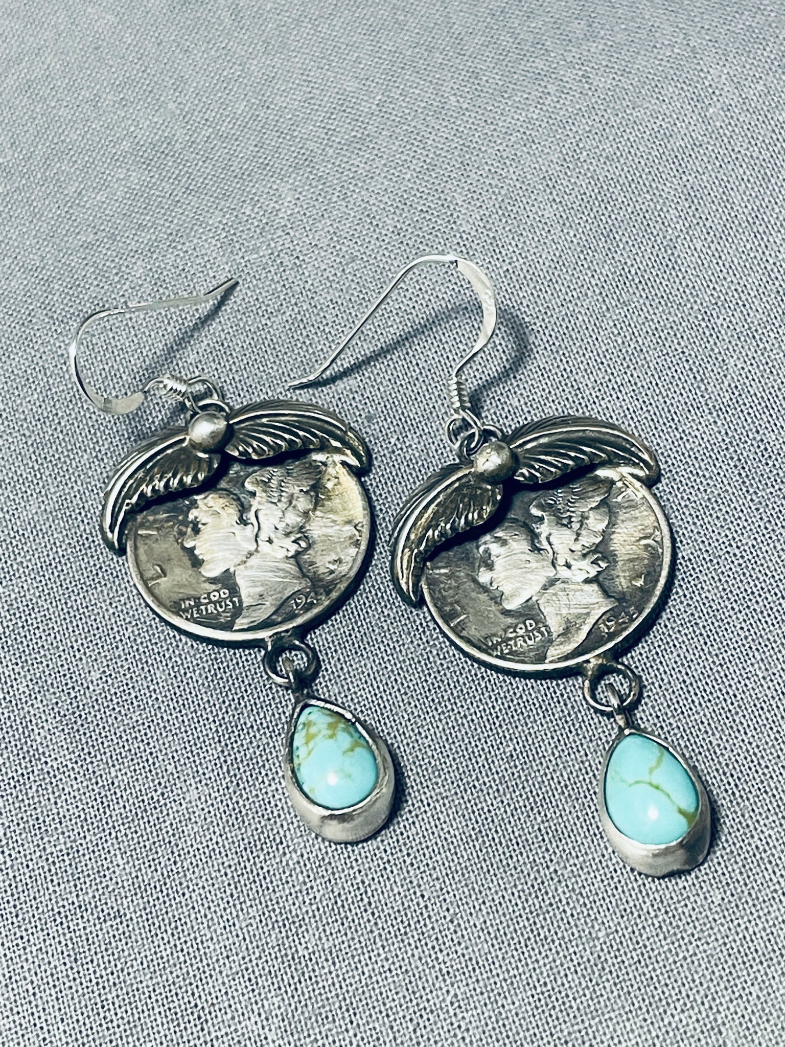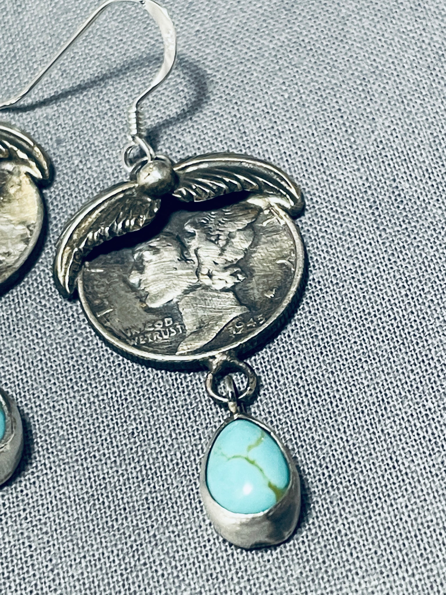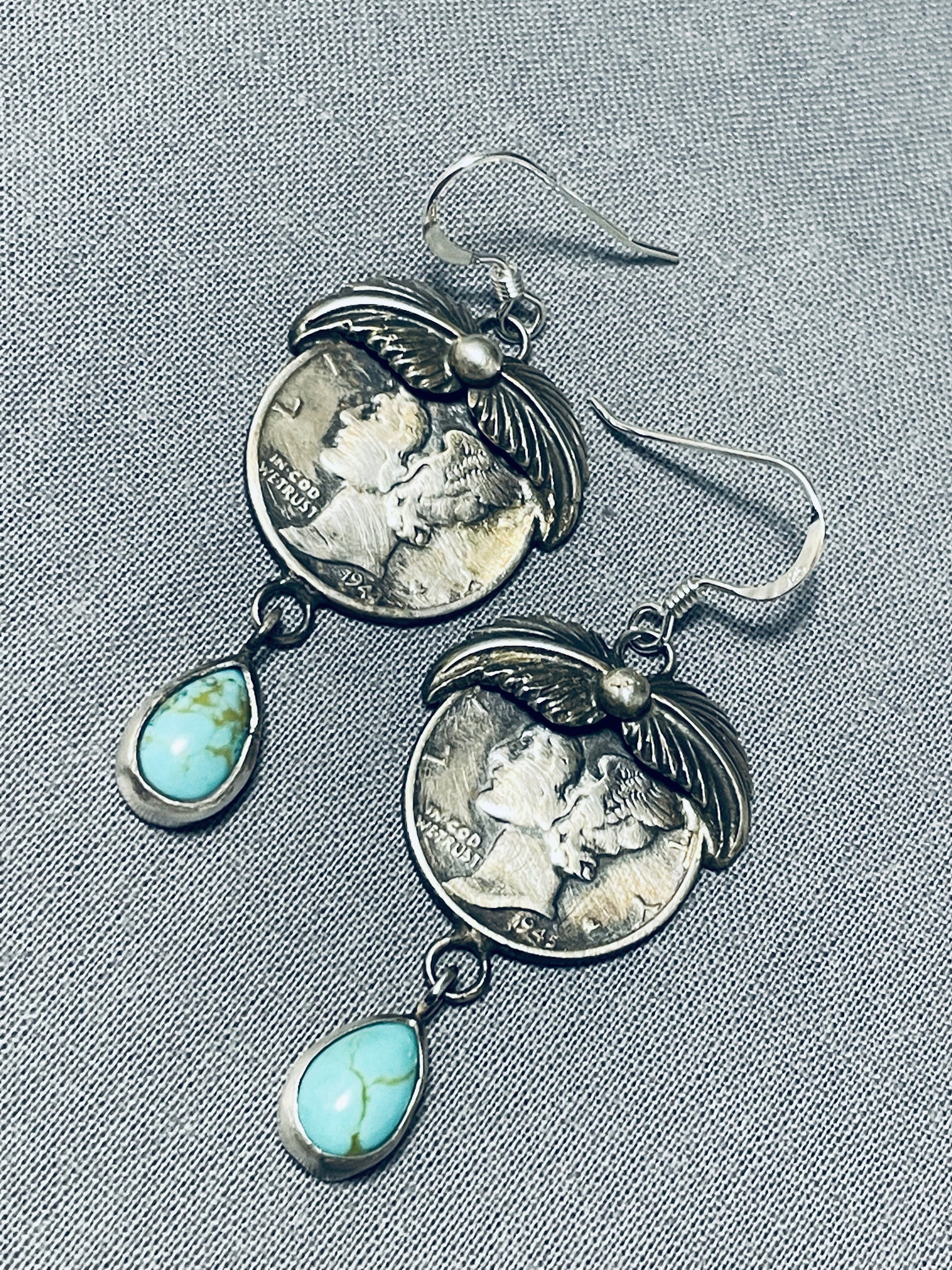 Beautiful Native American Navajo Kingman Turquoise Sterling Silver Dime Earrings