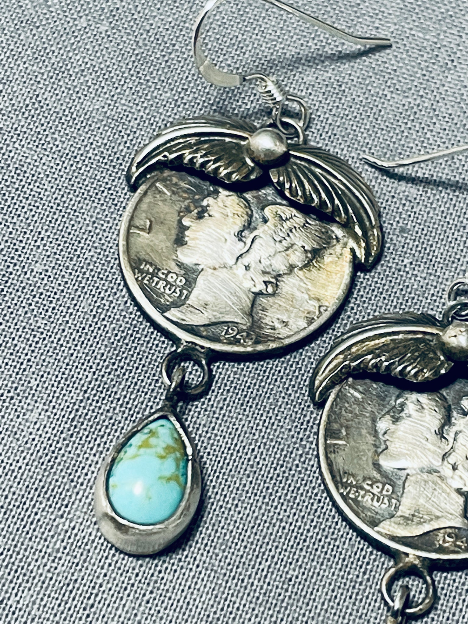 A wonderful Navajo silver pair of earrings. This is such a marvelous pair of pierced wire dangle earrings! Above each of the 1944 and 1945 Mercury dimes is a crown of 2 silver leaves and a berry! And then dangling below is the beautiful Blue Gem turquoise teardrop! Wonderful movement here! Sterling silver, marked. Signed by Navajo artist, JT. Each earring measures 2" long and 3/4" wide. The earrings weigh around 8 grams.