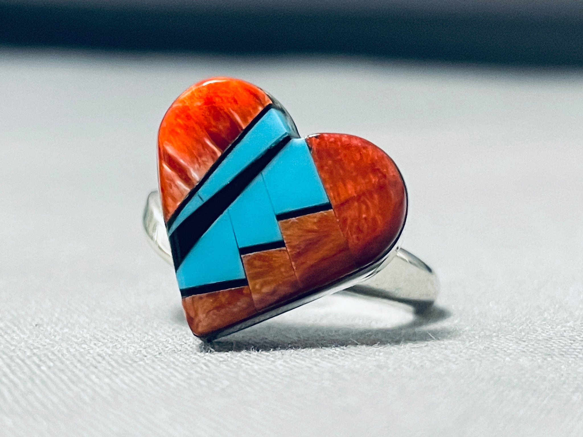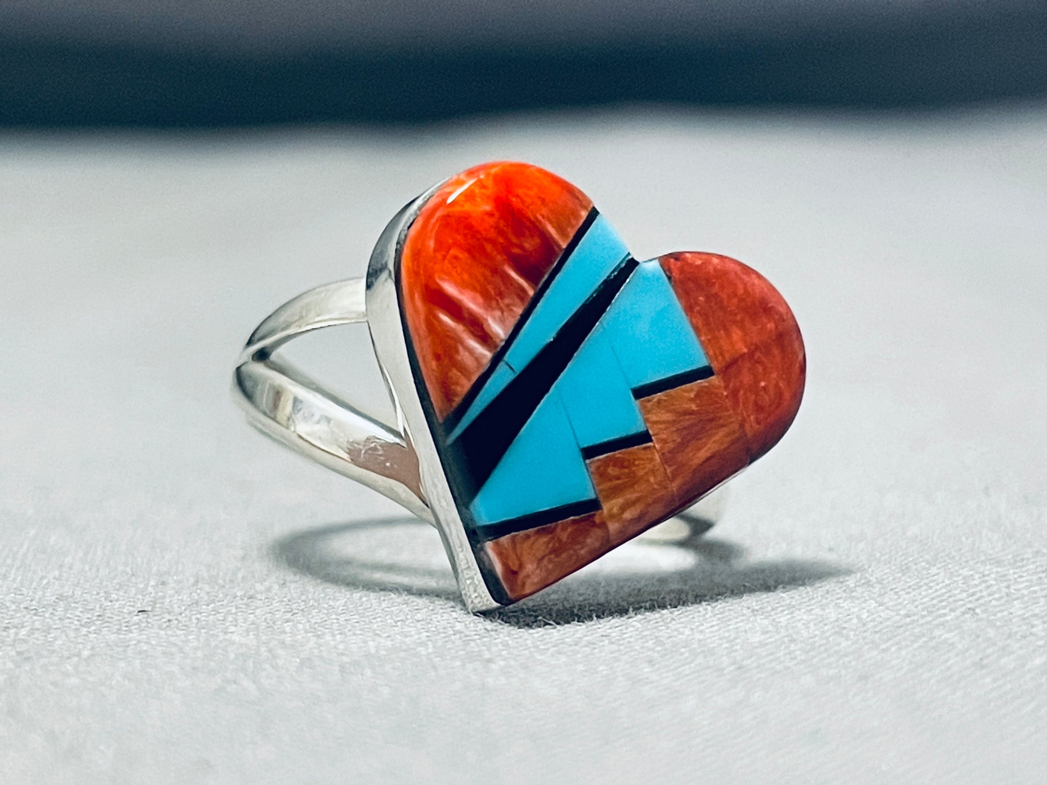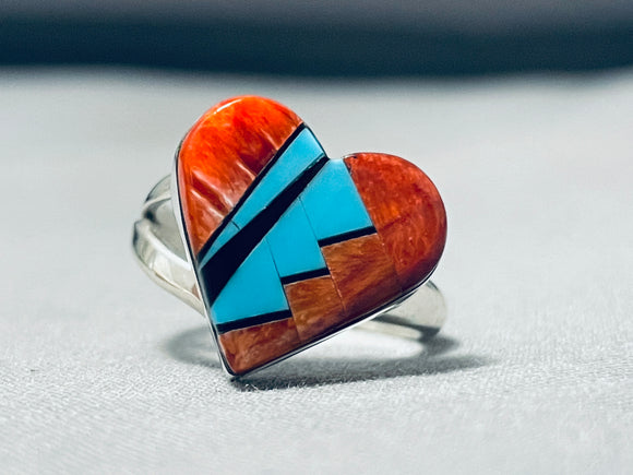 Here we have an exquisite Navajo silver ring. This incredible dual rail ring is all heart! The large heart is created of vibrant spiny oyster and turquoise! Lovely! The ring face measures around 5/8" x 7/8". Signed by Navajo artist, CW. The ring size is around 8. Sterling silver, marked. Sturdy 8 grams.