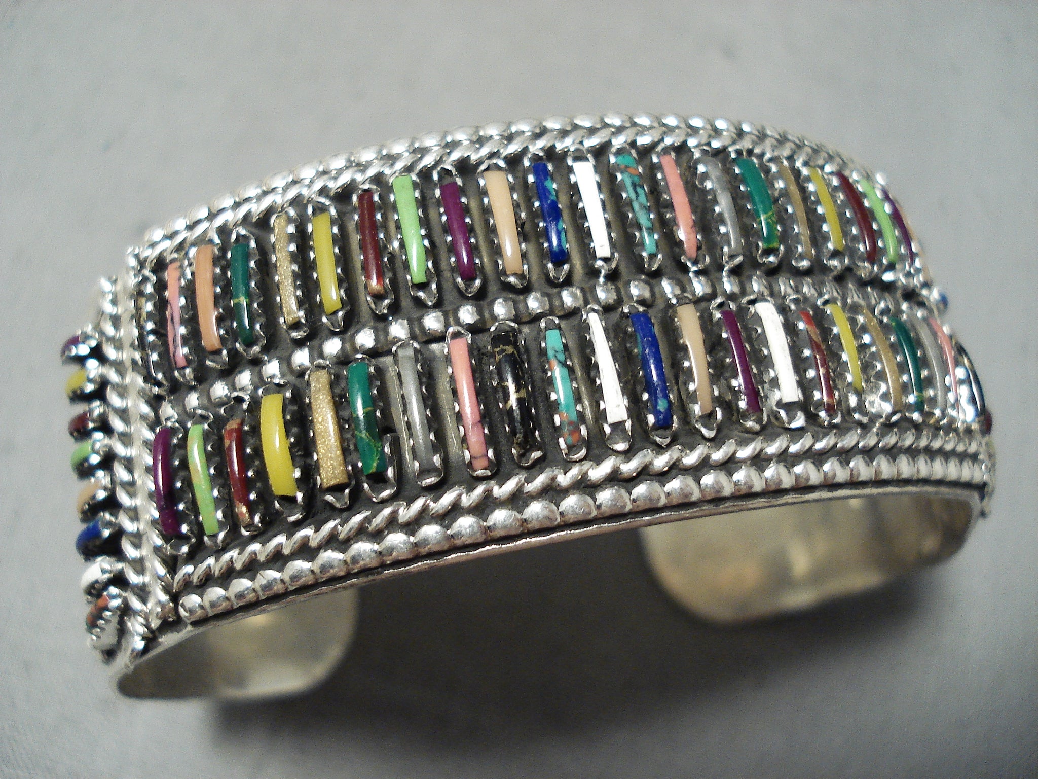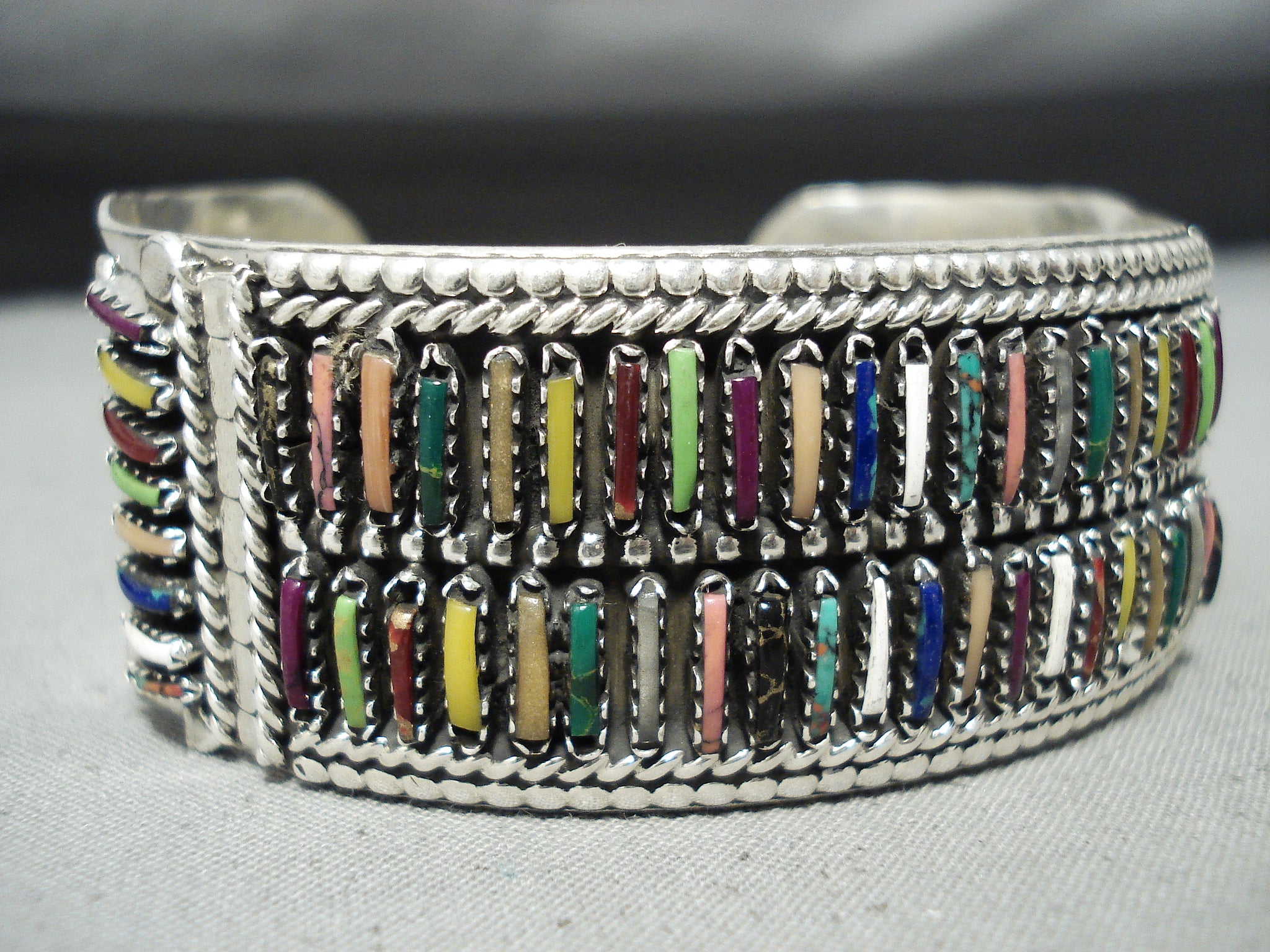 This is an amazing vintage Navajo multiple colored stone silver bracelet. This outstanding piece contains two rows of impresive multiple colored stones with accenting multicolored stones on each end as well. The stones consist of tigers eye, pink shell, lapis, turquoise, green stone, purple shell, and white stones. The unique detailing of the stones and silver works is just impeccable. Located throughout the stones are stunnin gsilver raindrops and ropes. The ends of the cuff bracelet are incredible and consist of beautiful sun bursting silver works with accenting flattened raindrops. The width of the bracelet measures around 1". Signed by Navajo artist, Cel Yazzie . Sterling silver, marked. Cir. 1970's+. The inside end to end measures around 5-3/4" with an additional 1" gap. Sturdy 46 grams.