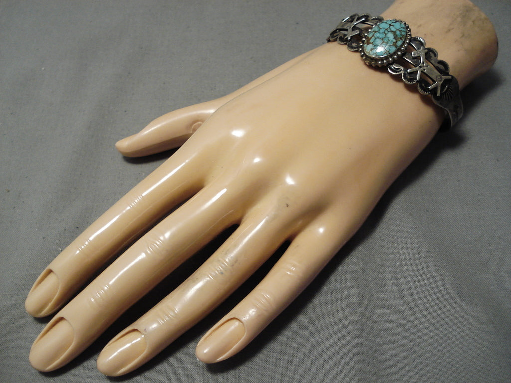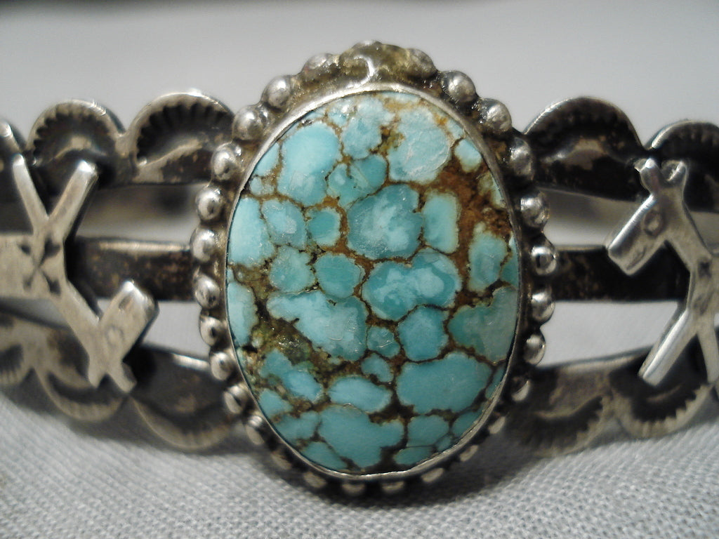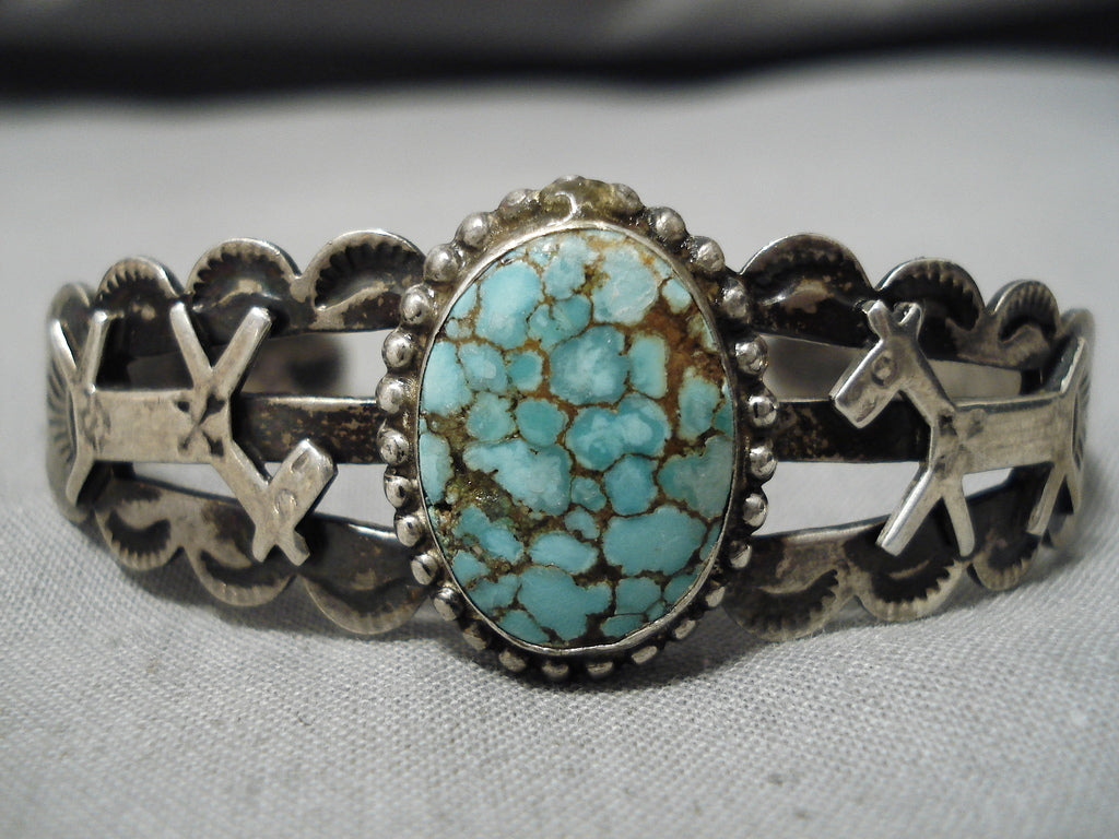 A beautiful vintage Navajo silver bracelet. Absolutely mesmerizing, this gorgeous green spiderweb turquoise stone is surrounded with silver beads and placed at the heart of its scalloped handstamped bracelet – as a silver applique dog guards either side! The center stone measures around 3/4" x 1/2". The width of the bracelet measures around 7/8". Sterling silver, marked. The inside end to end measures around 5-3/8" with an additional 1-1/4" gap. Sturdy 16 grams.