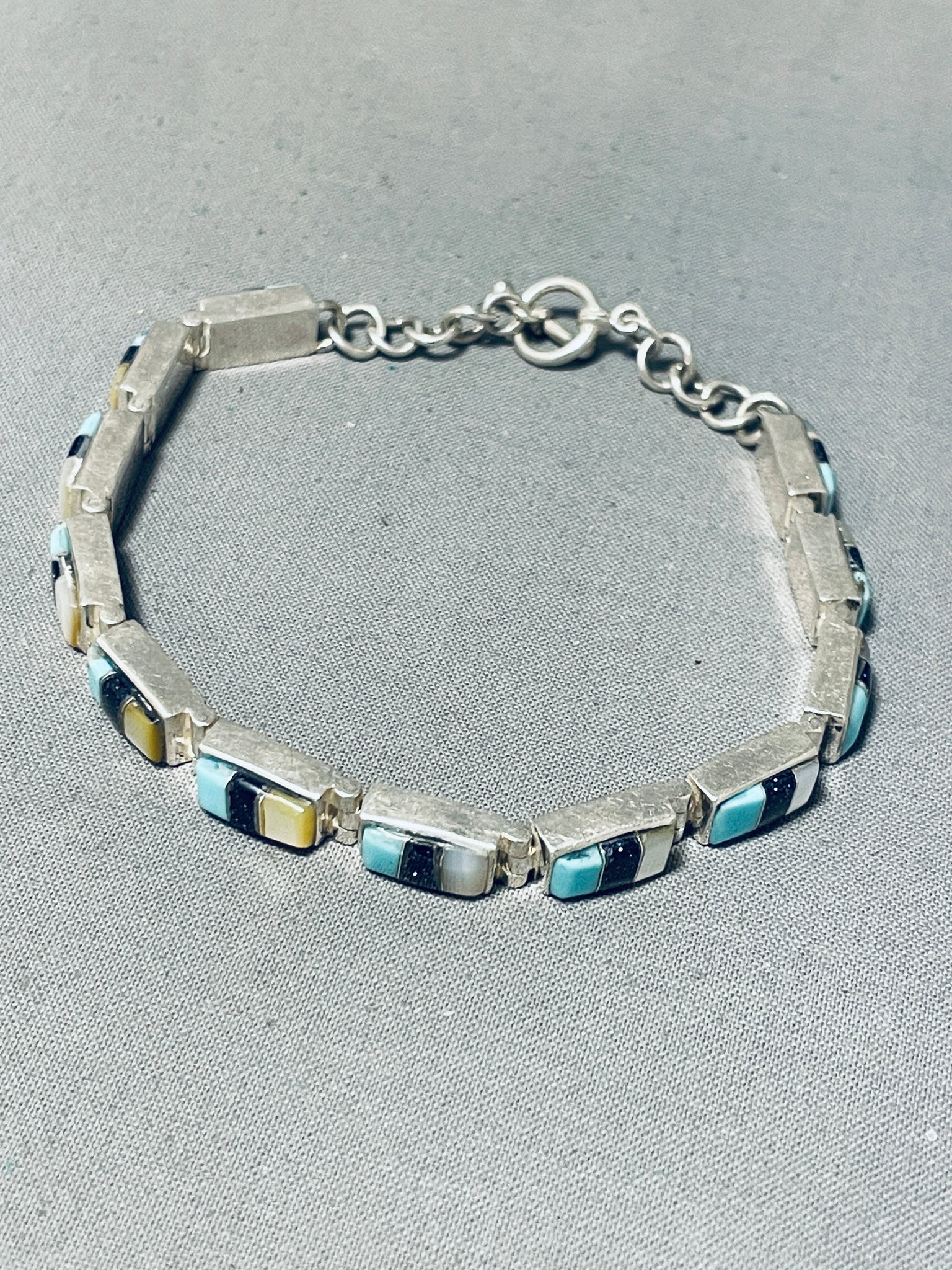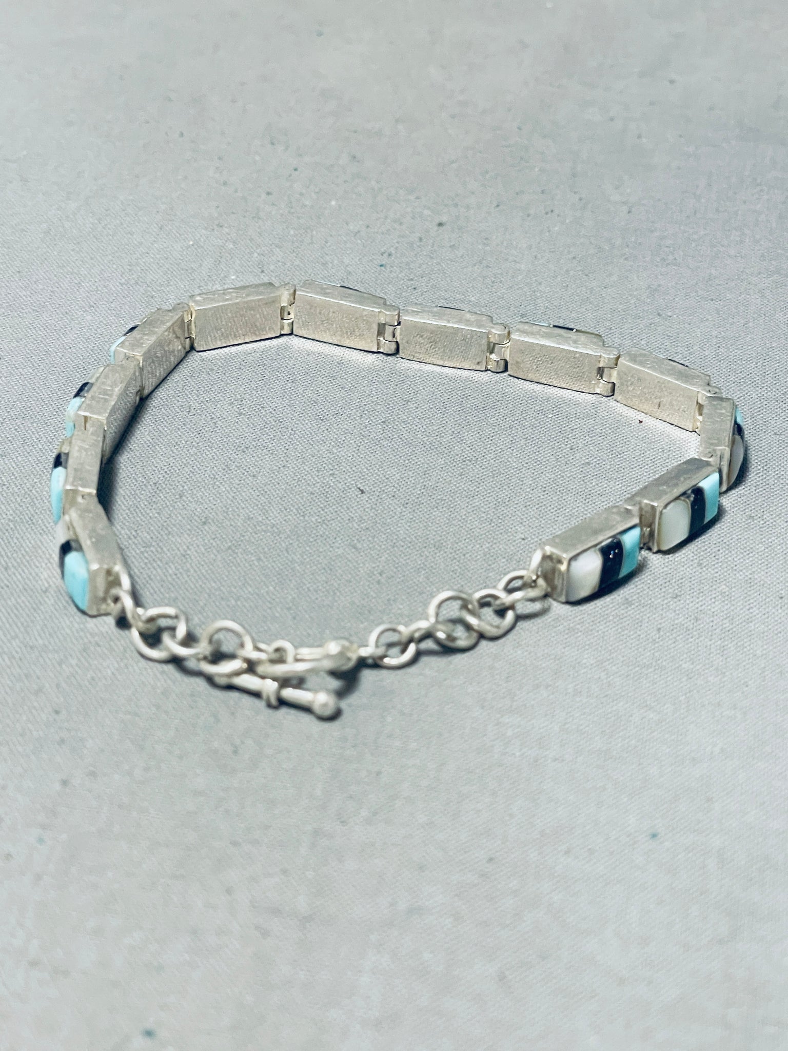 The Blue Gem turquoise mine, located near Battle Mountain, Nevada, is renowned for producing some of the finest turquoise in the world. This historic mine, active primarily from the 1930s through the 1970s, is celebrated for yielding high-grade turquoise in a spectrum of vibrant hues, ranging from intense blue to rich green, often with golden or brown matrix patterns. Known for its hardness and brilliant colors, Blue Gem turquoise is highly sought after by jewelers and collectors alike. Its exceptional quality and rarity make it a prized material in Native American jewelry, particularly in intricate silver settings. Although the mine is no longer operational, the legacy of Blue Gem turquoise endures, with its stones continuing to be treasured for their beauty and connection to the American Southwest. The width of the bracelet measures around 1/4". Sterling silver. The inside end to end measures around 8-1/2". Sturdy 25 grams.