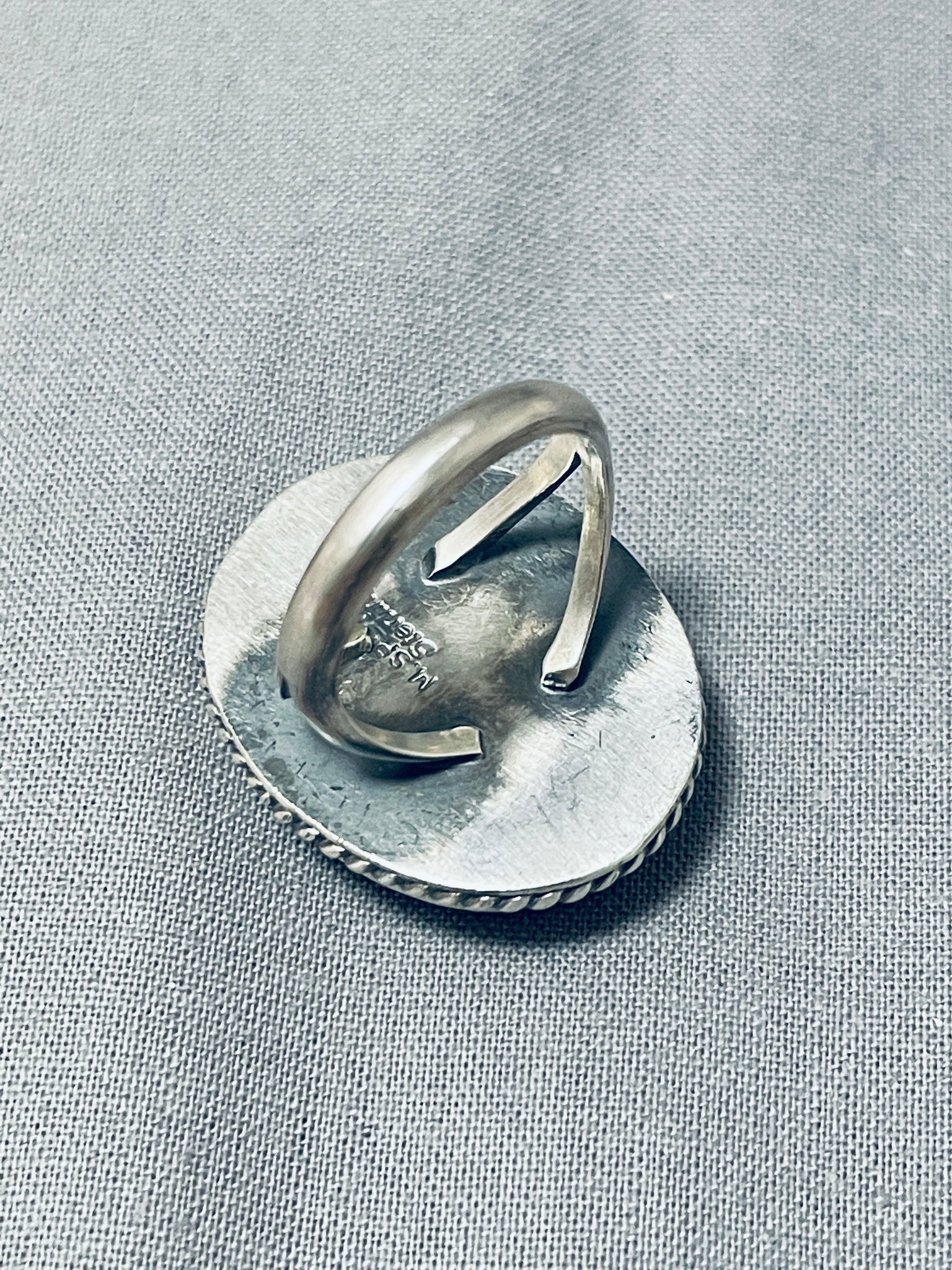 This is an incredible vintage Navajo ring featuring a round blue green turquoise stone surrounded by handcarved silver rope, on a double rail silver band that graduates to a solid silver band! So Striking! The center stone measures around 7/8" x 3/4". The ring face measures around 1" x 7/8". Signed by Navajo artist, M. Spencer. The ring size is around 5. Sterling silver, marked. Sturdy 11 grams.