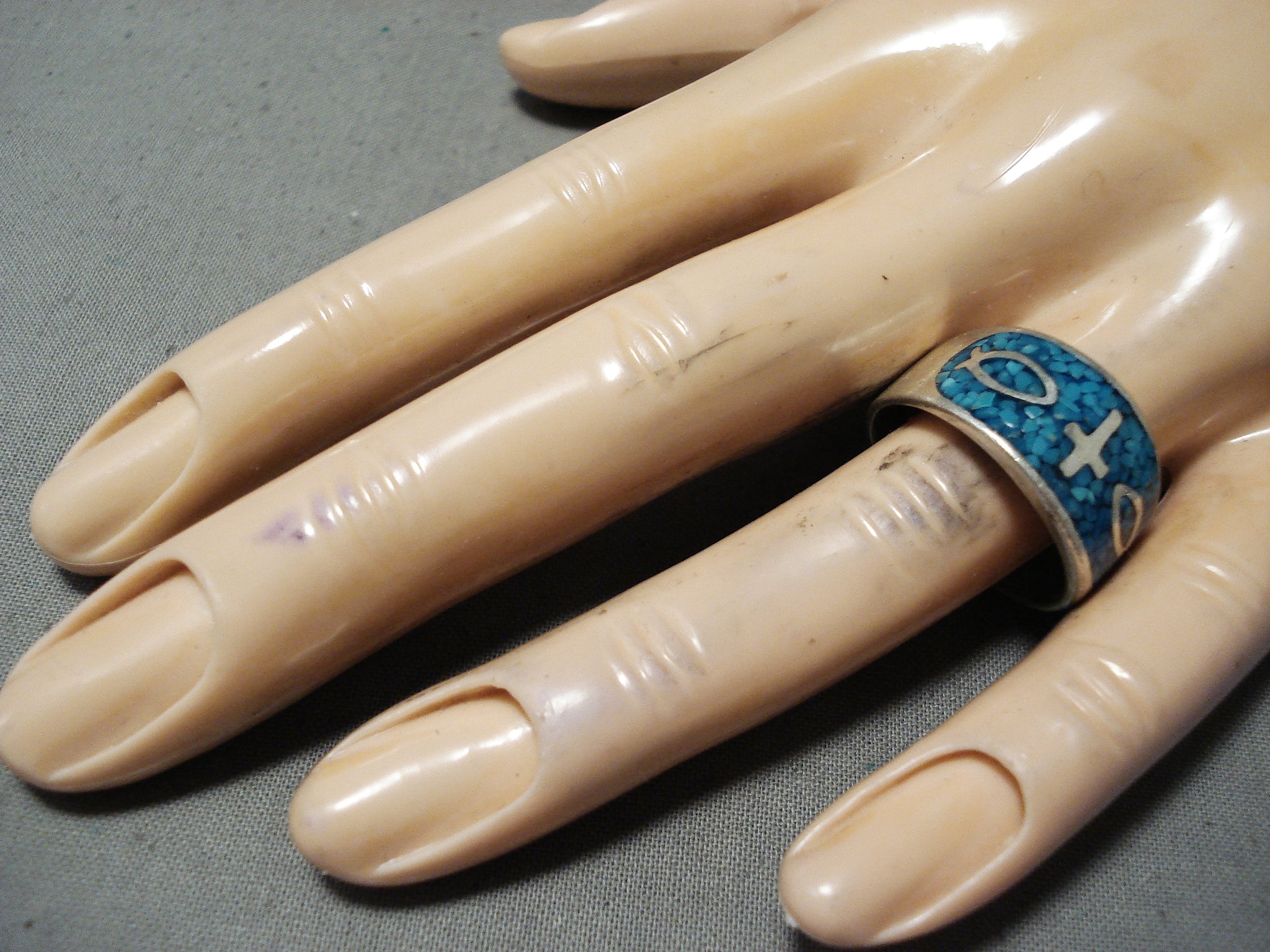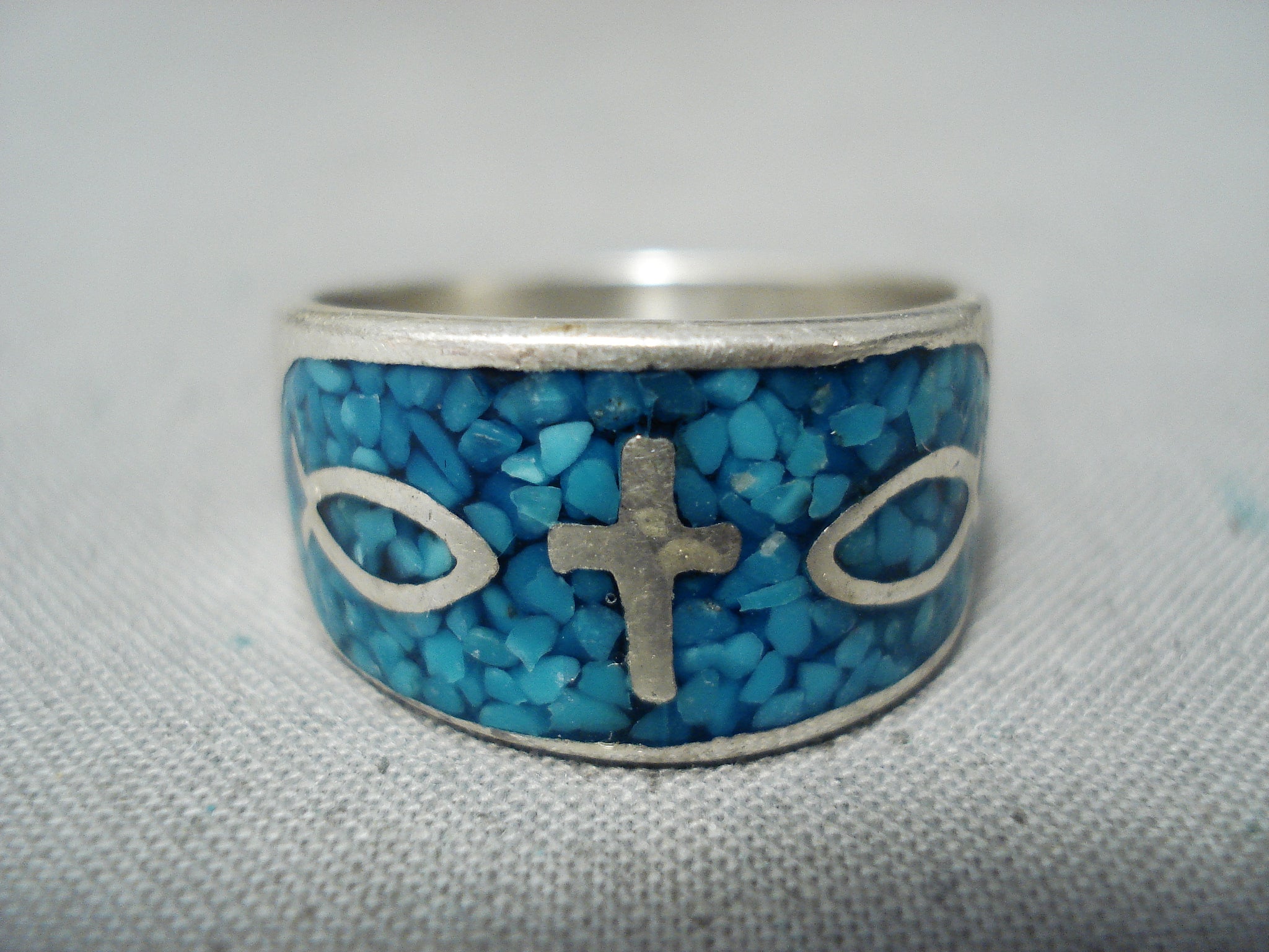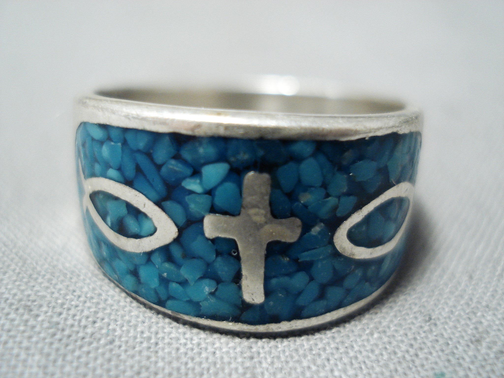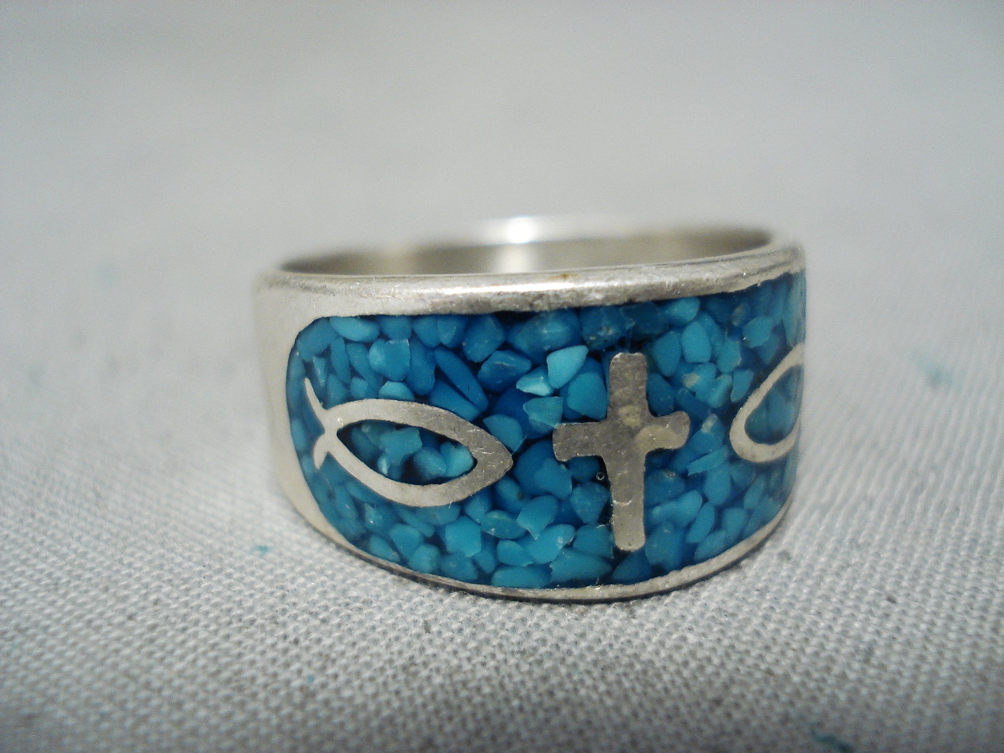 Beautiful Vintage Native American Navajo Christian Cross Sterling Silver Turquoise Fish Ring