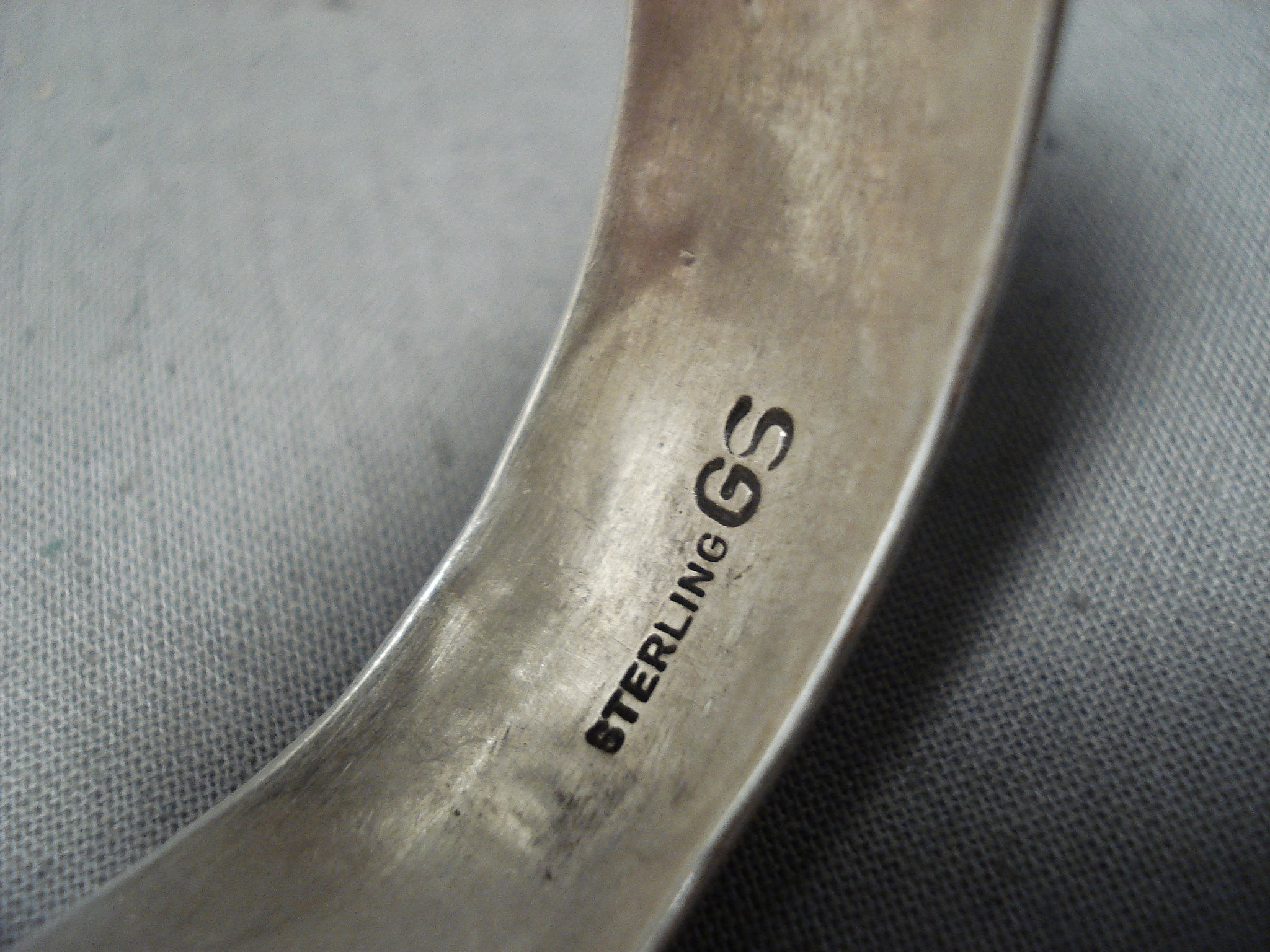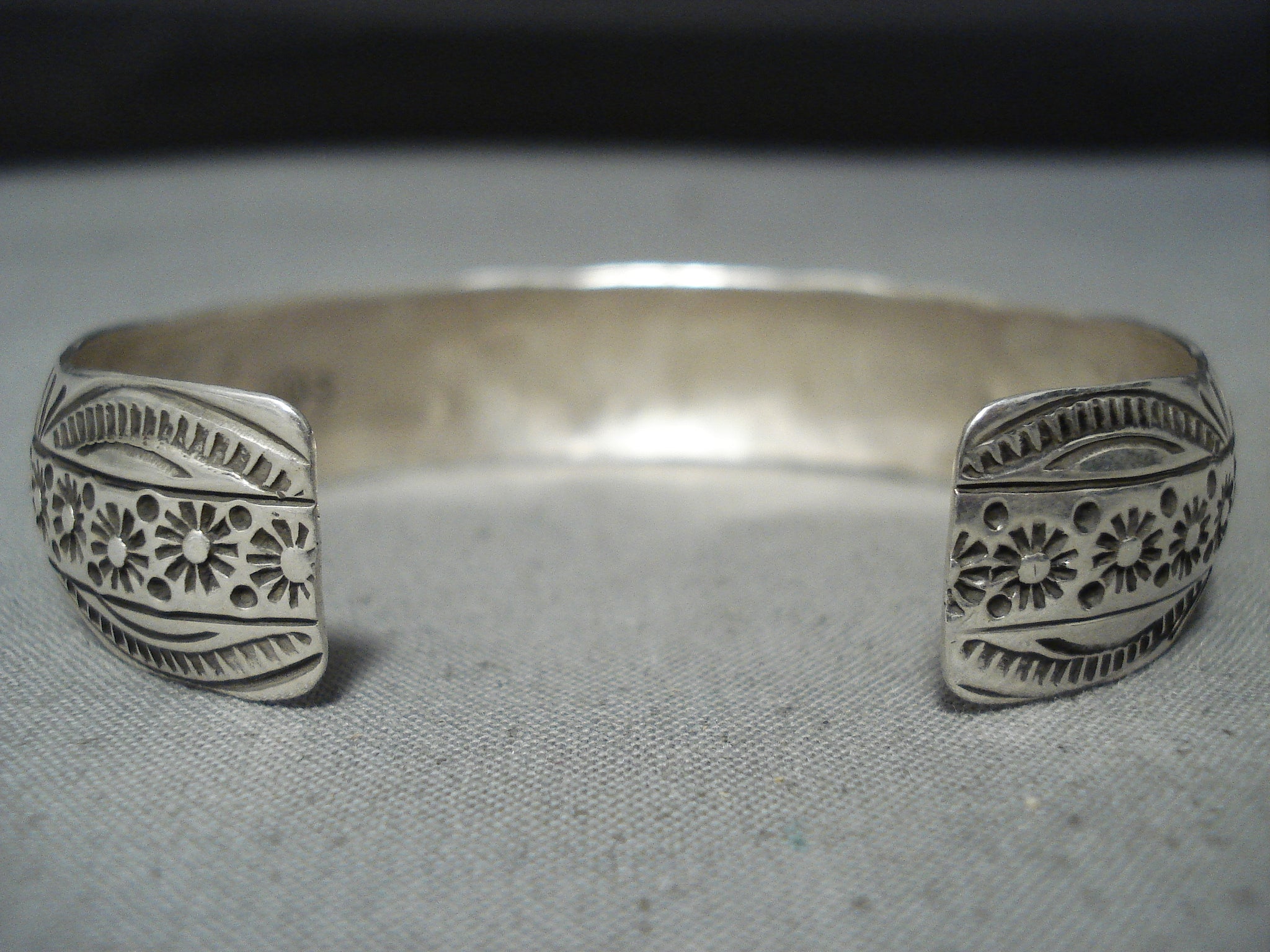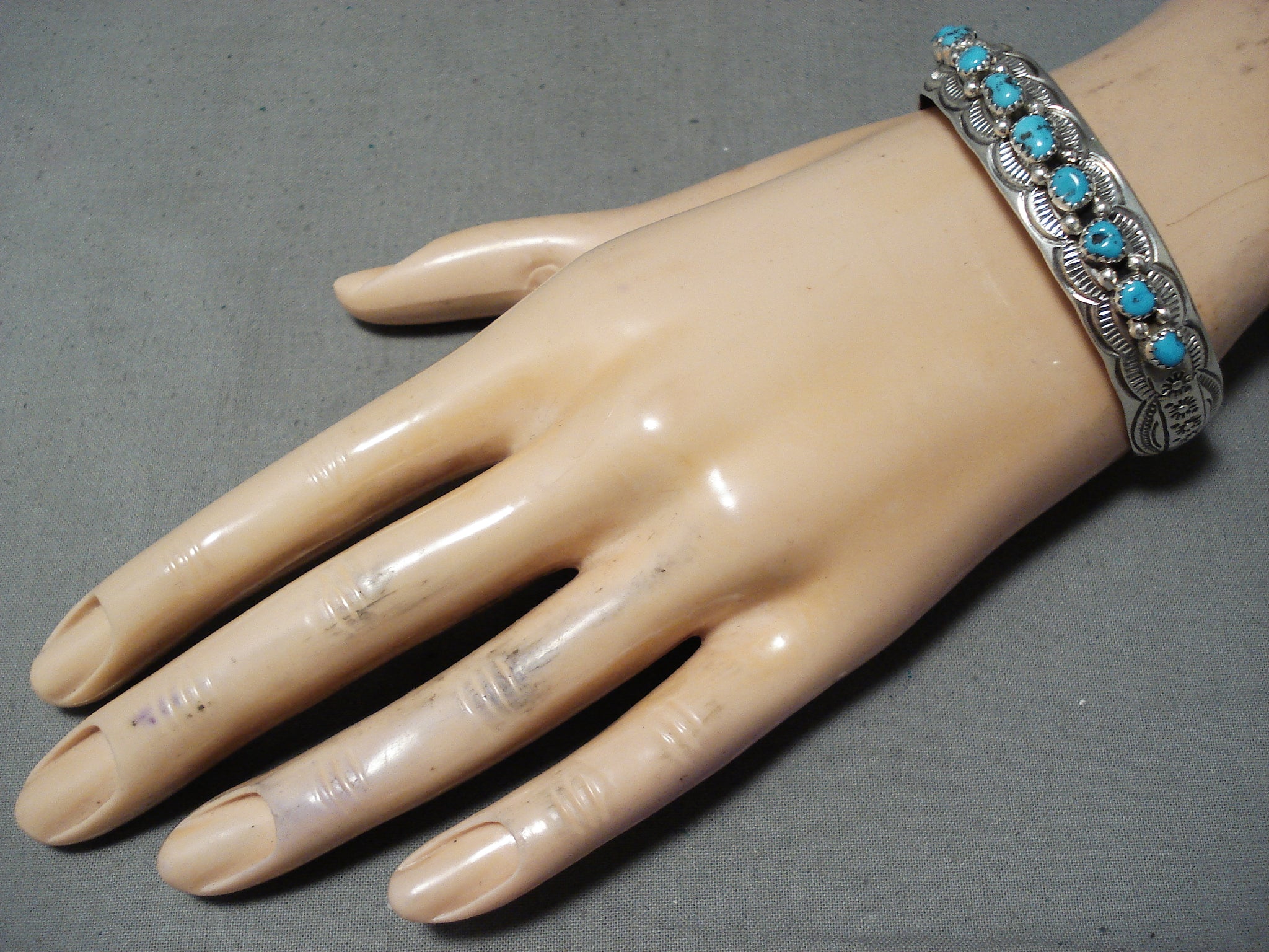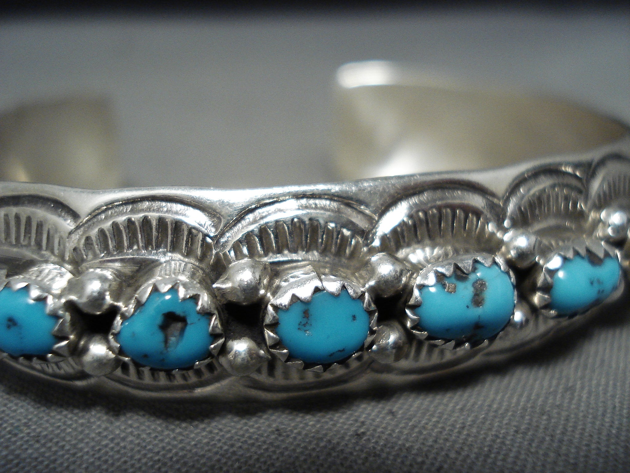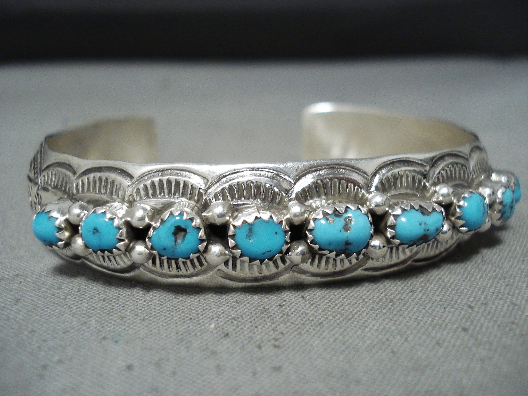 This is a marvelous vintage Navajo multiple stone silver bracelet. This wonderful bracelet contains superior old Sleeping Beauty turquoise stones, a total of 9 stones. Accenting the entire bracelet are stunning silver sun and star stampings with accenting silver raindrops throughout the stones. The center stone measures around 1/4" x 1/8". The width of the bracelet measures around 1/2". Signed by Navajo artist, Glen Sandoval. Sterling silver. Cir. 1970's+. The inside end to end measures around 6" with an additional 1" gap. Sturdy 19 grams.