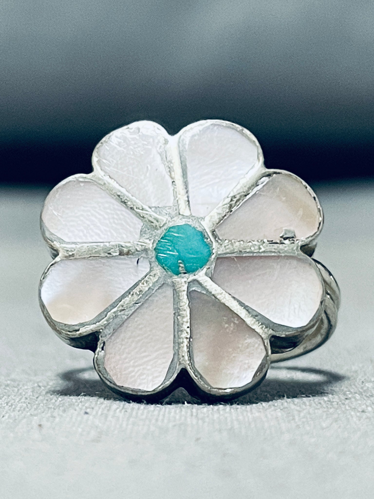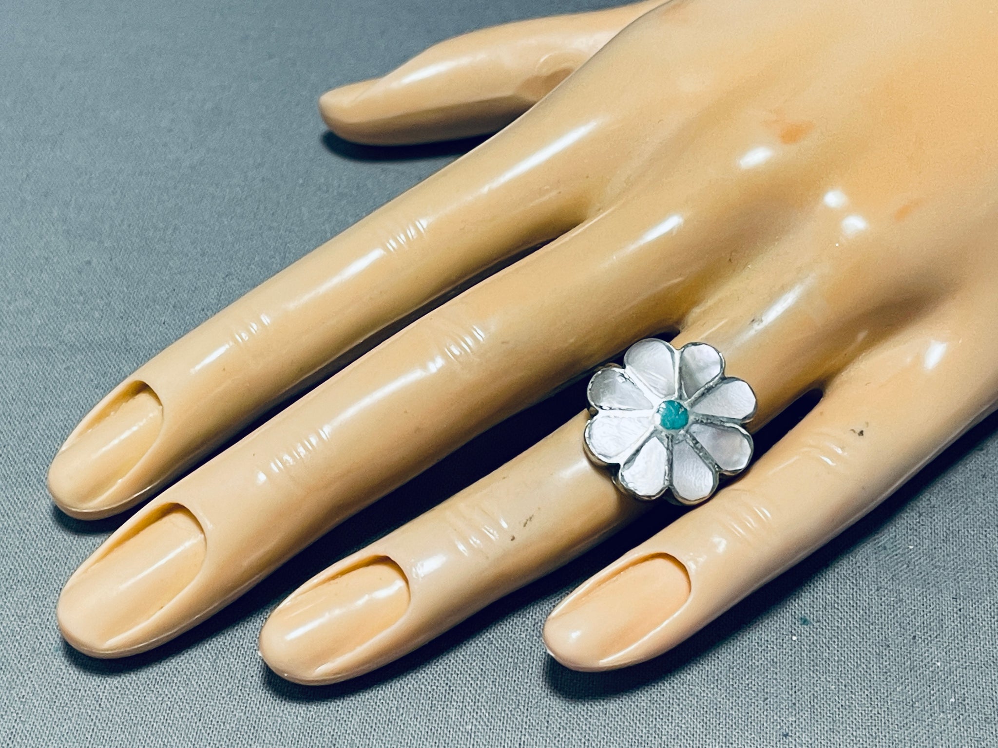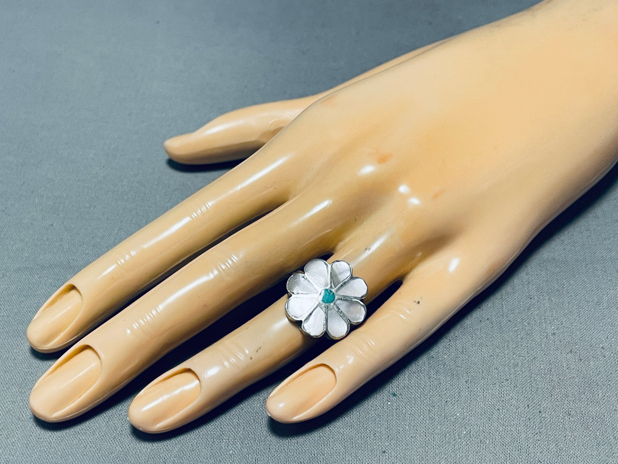 Beautiful Vintage Native American Navajo Flower Turquoise Inlay Sterling Silver Ring