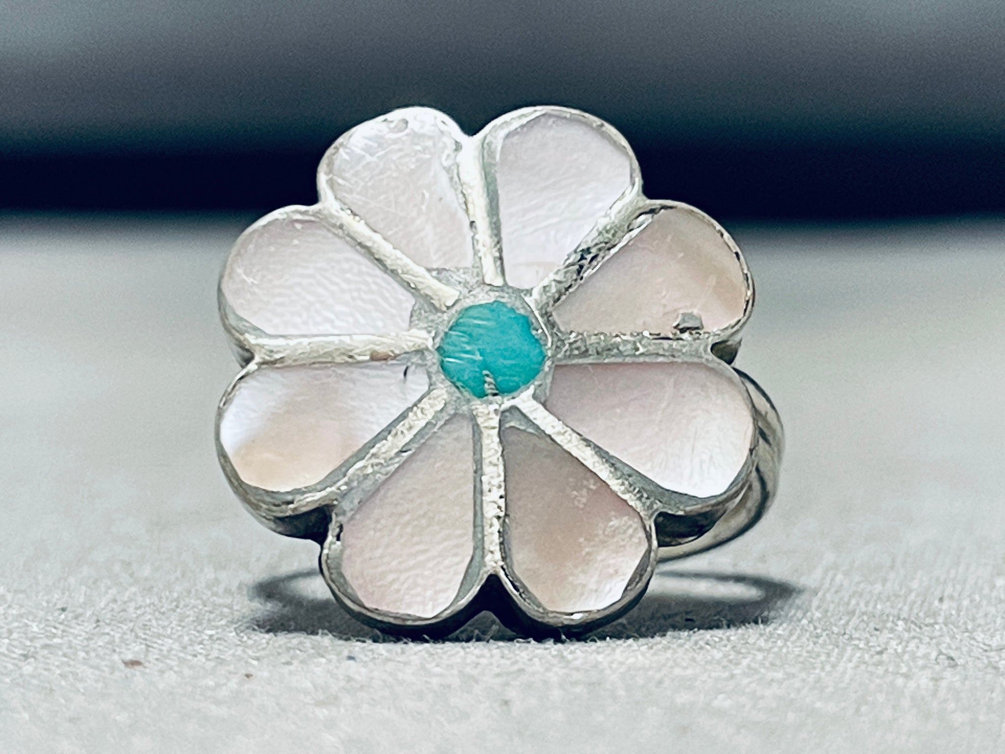 This is a striking vintage Navajo inlaid flower silver ring. This beautiful ring is designed into a wonderful inlaid flower that consists of natural Sleeping Beauty turquoise and mother of pearl shell. The ring contains a stunning double silver shank. The ring face measures around 3/4" x 3/4". The ring size is around 6.5. Cir. Mid century . Sterling silver. Sturdy 4 grams.